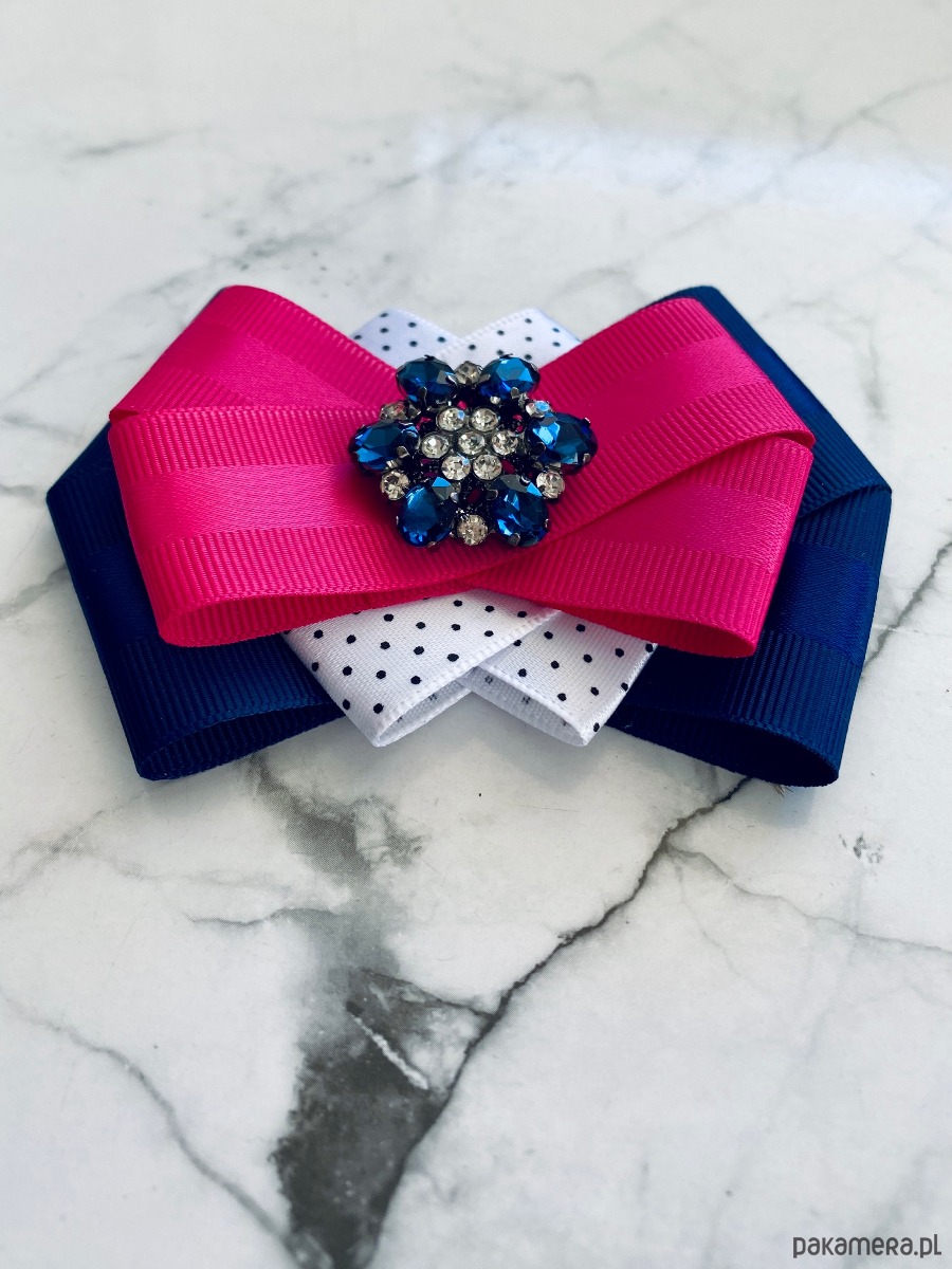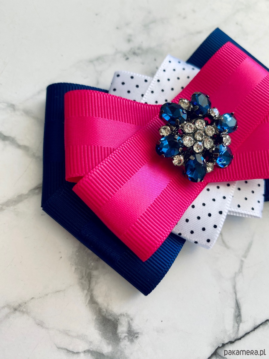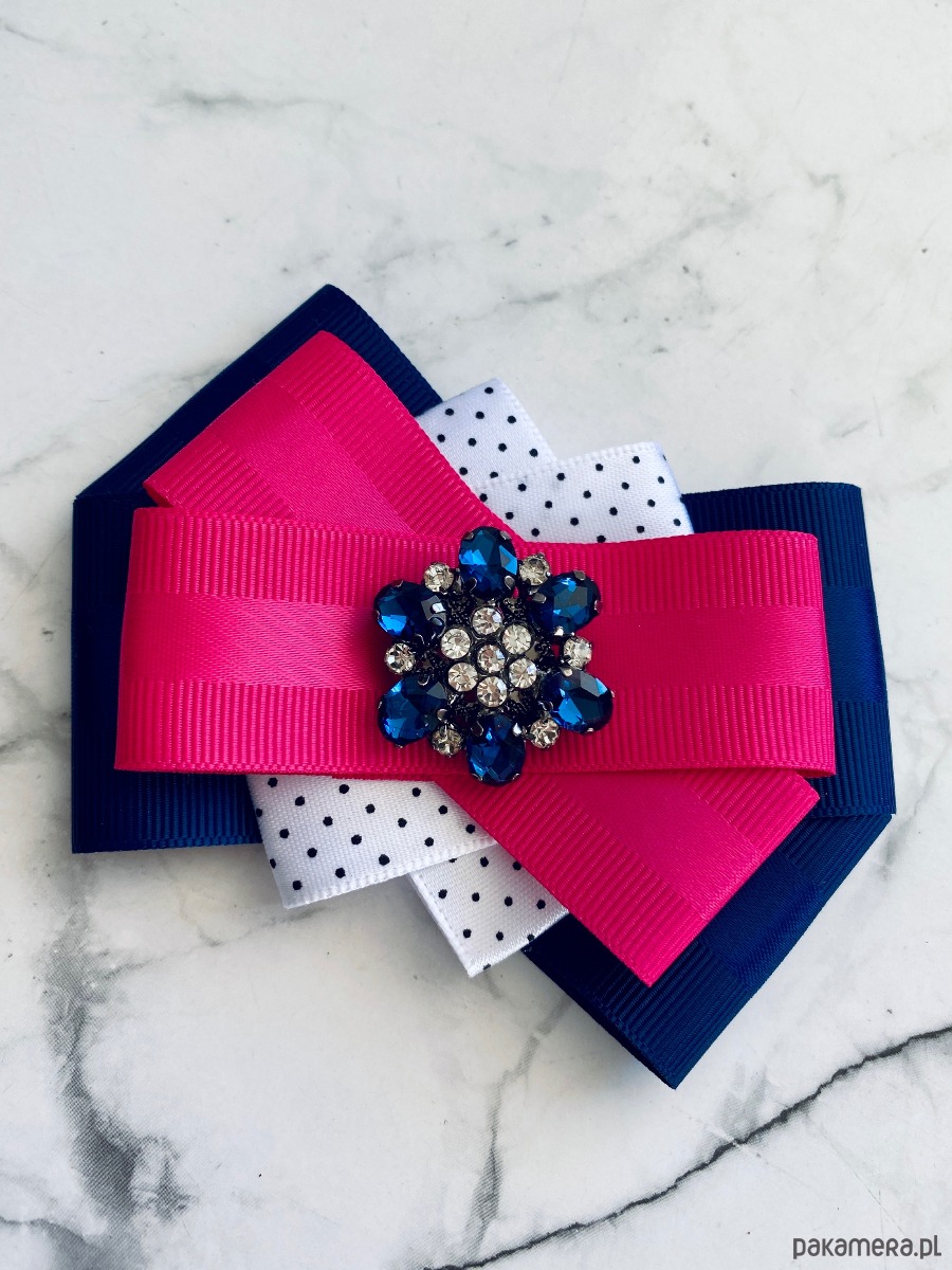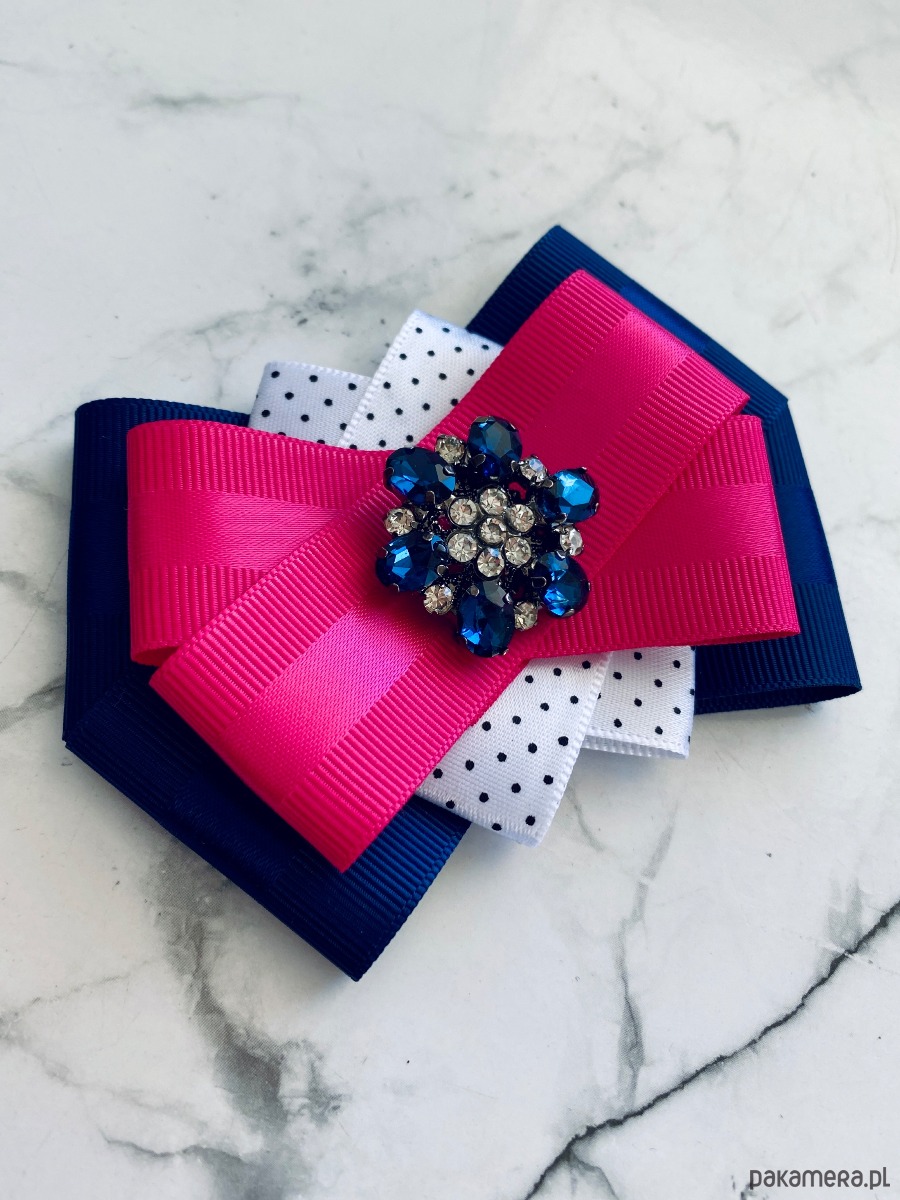 Brosza wykonana z wysokiej jakości taśm i dodatków. Broszka w kolorach granatu, bieli i fuksji. Piękna oryginalna ozdoba na środku kwiat wykonany z kryształków. Będzie idealnie pasować zarówno do koszul, bluzek, swetrów, sukienek, żakietów oraz do płaszczy, kurtek, szali i chust. Idealna do każdej stylizacji, zarówno do sportowej jak również do eleganckich stylizacji.