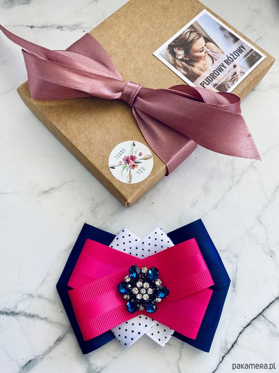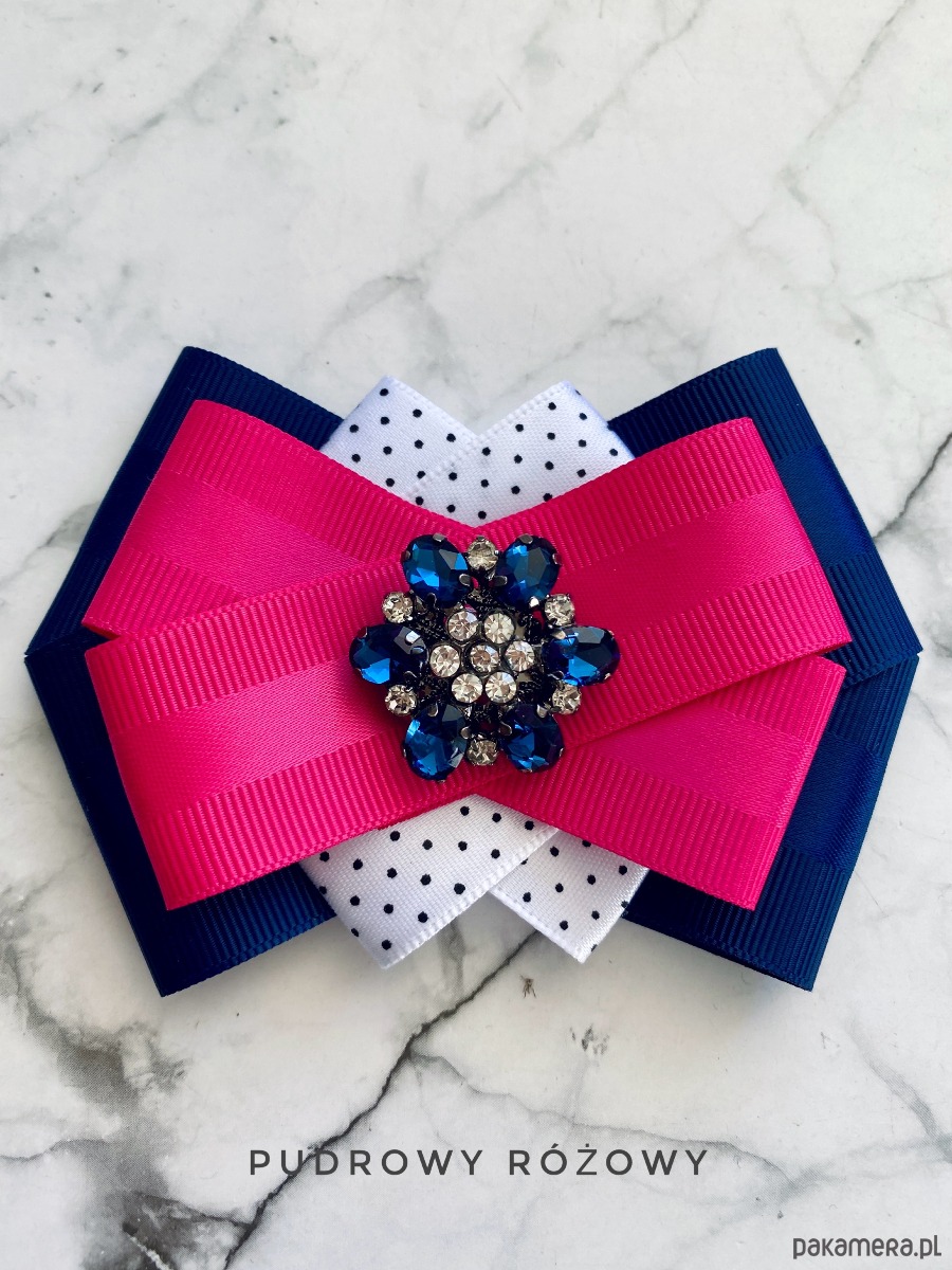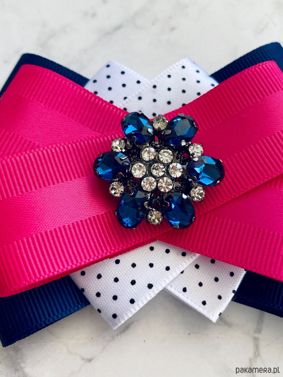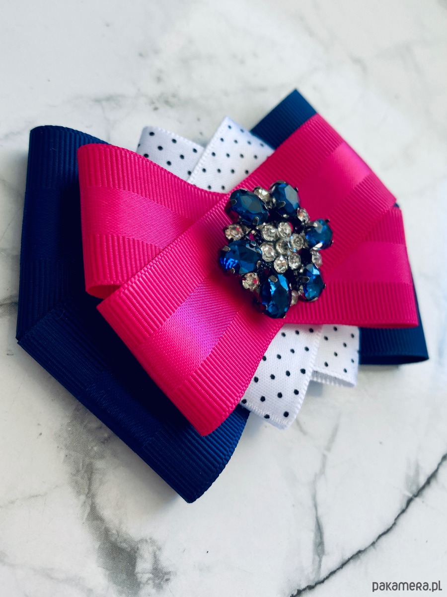Brosza wykonana z wysokiej jakości taśm i dodatków. Broszka w kolorach granatu, bieli i fuksji. Piękna oryginalna ozdoba na środku kwiat wykonany z kryształków. Będzie idealnie pasować zarówno do koszul, bluzek, swetrów, sukienek, żakietów oraz do płaszczy, kurtek, szali i chust. Idealna do każdej stylizacji, zarówno do sportowej jak również do eleganckich stylizacji.