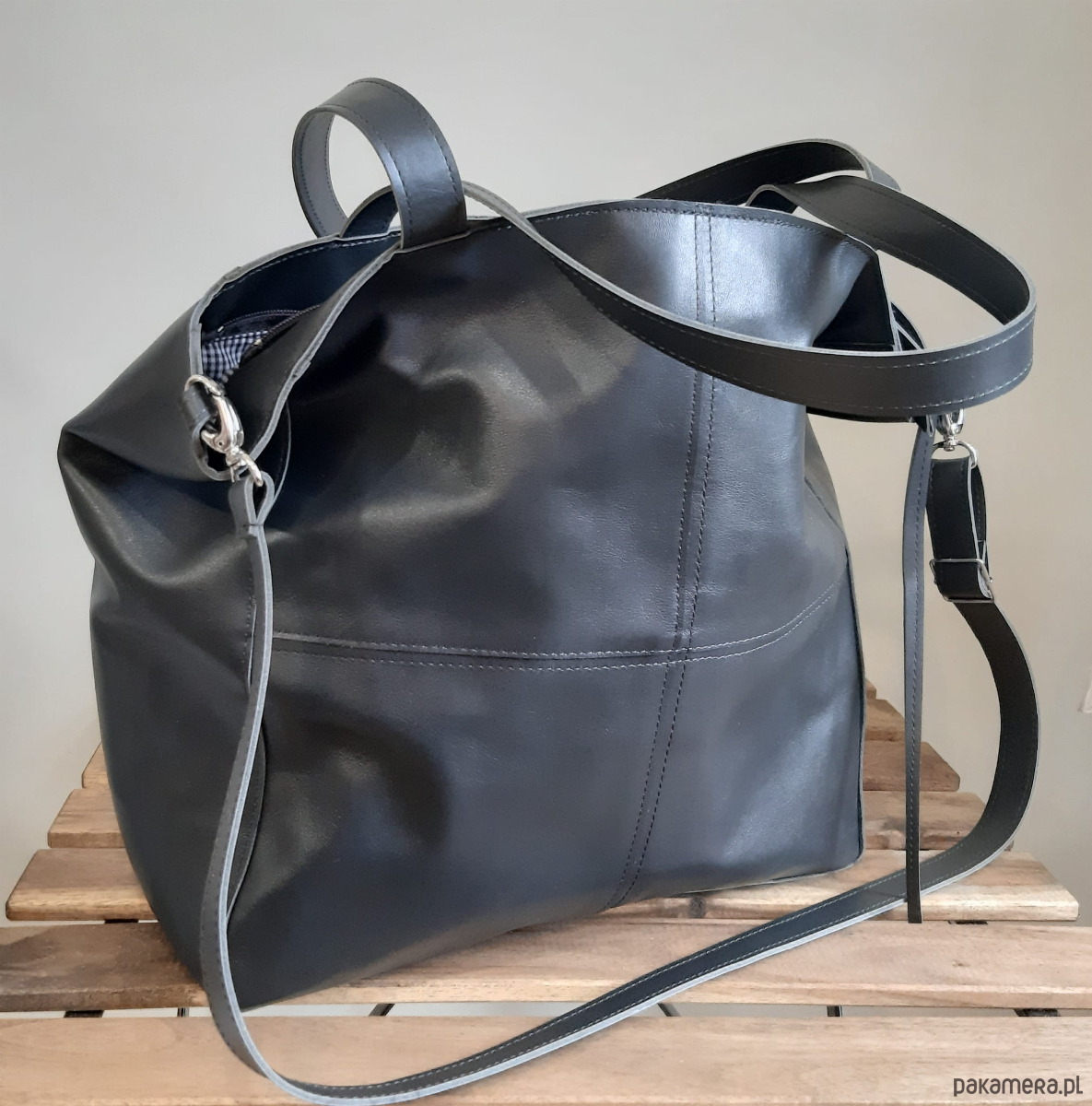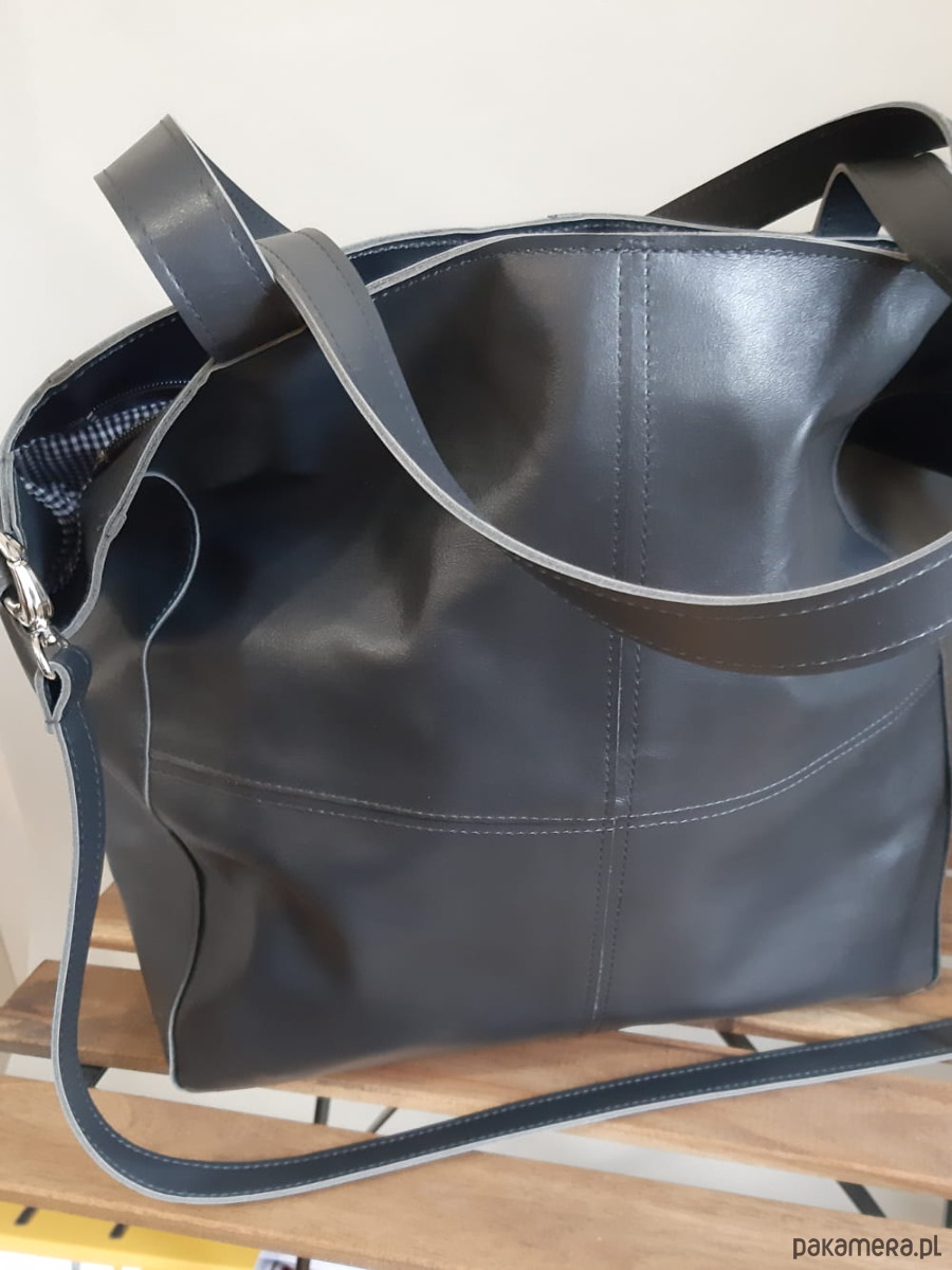 Skórzana torba w kolorze granatowym. Skóra grubsza, ale miękka, gładka, z lekkim połyskiem