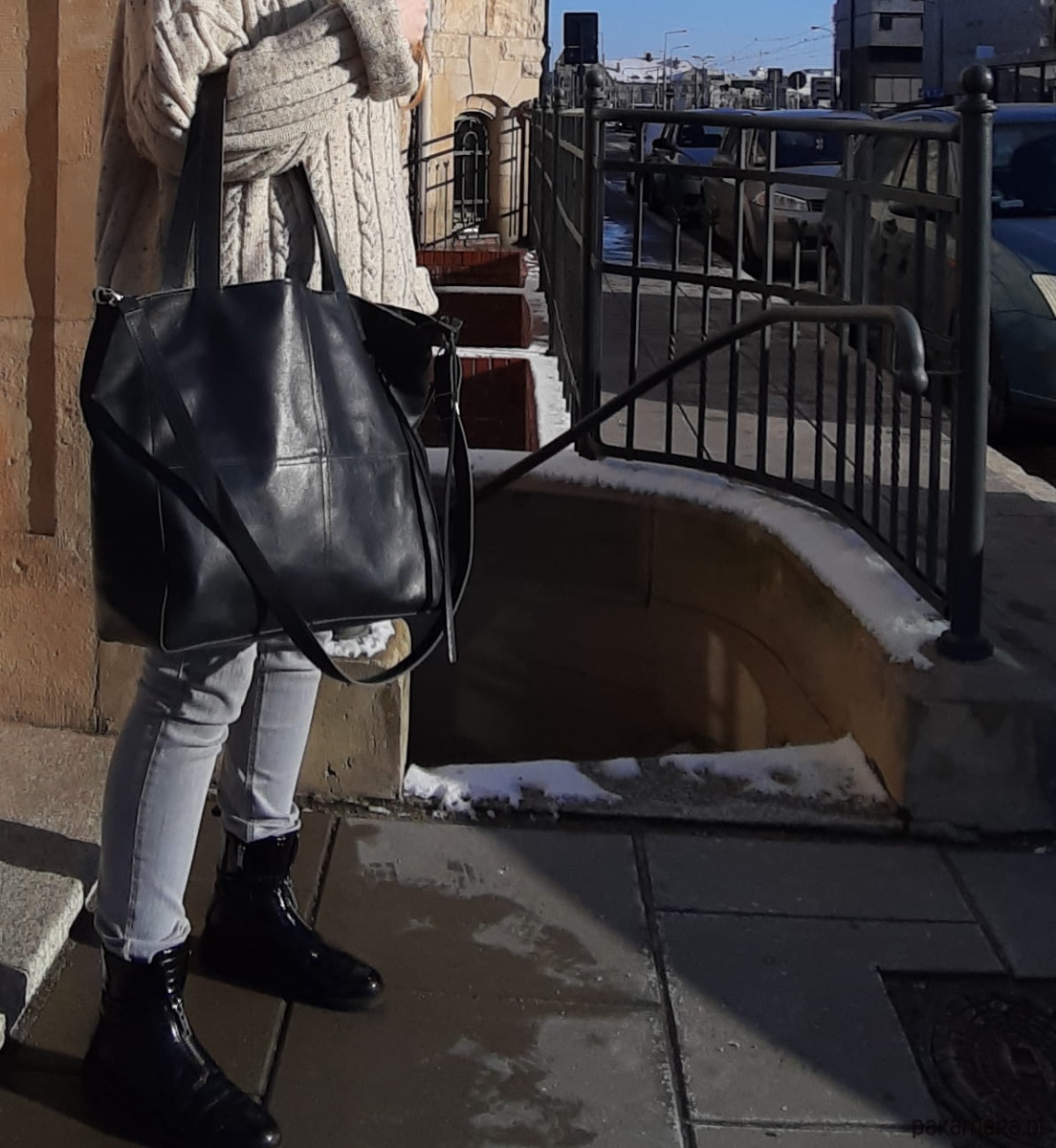 Do noszenia na ramieniu na podwójnych uchwytach 60 cm, lub też na długim regulowanym pasku o szer. 2,5 cm.