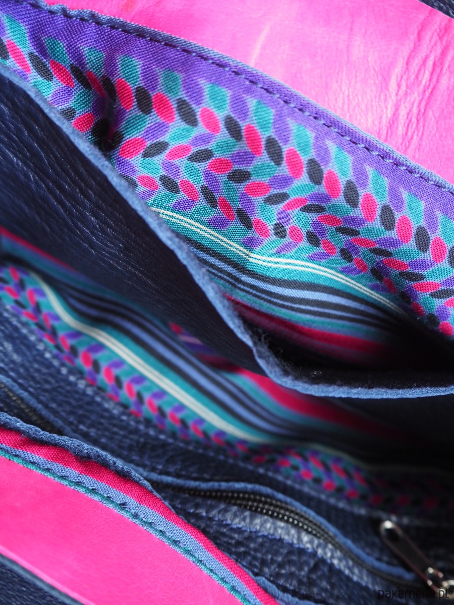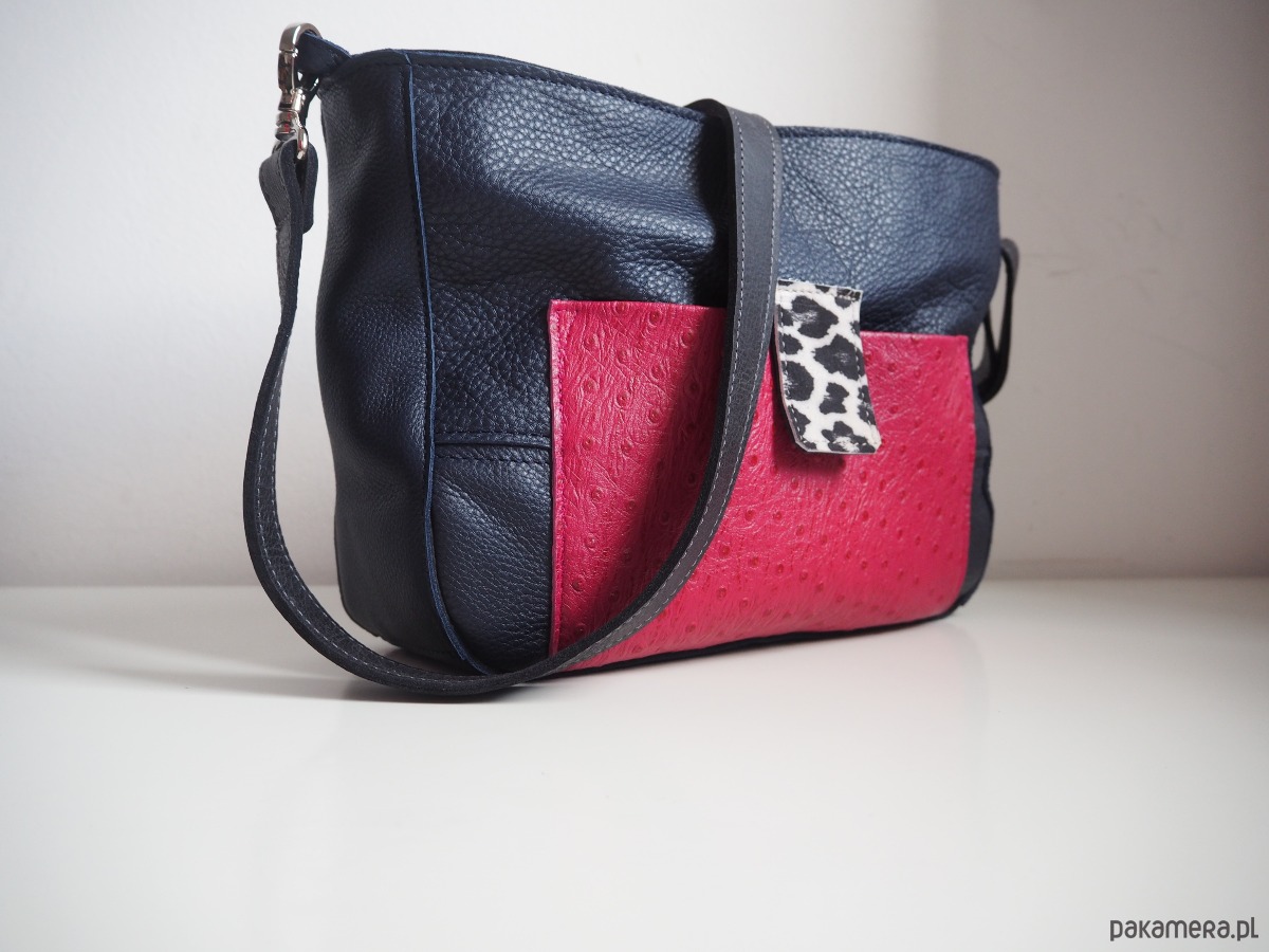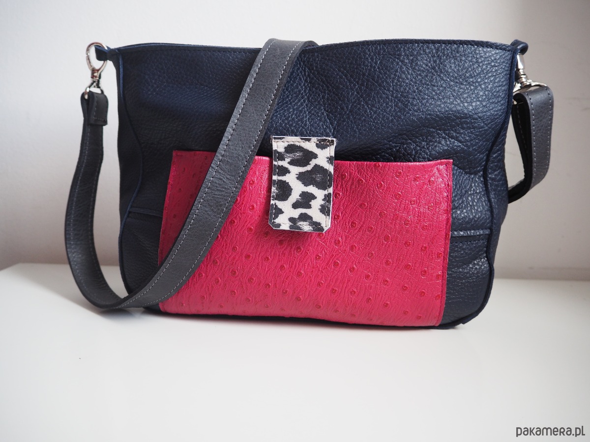 Granatowa skórzana torebka. Z przodu ciemno różowa kieszonka z panterkowa patką z zapięciem na magnes.