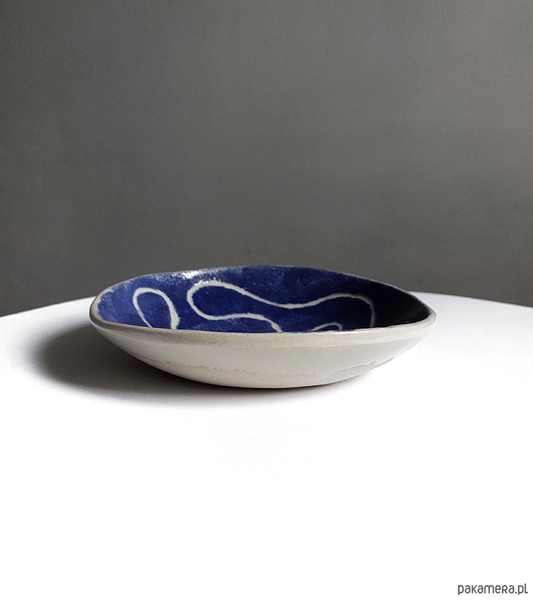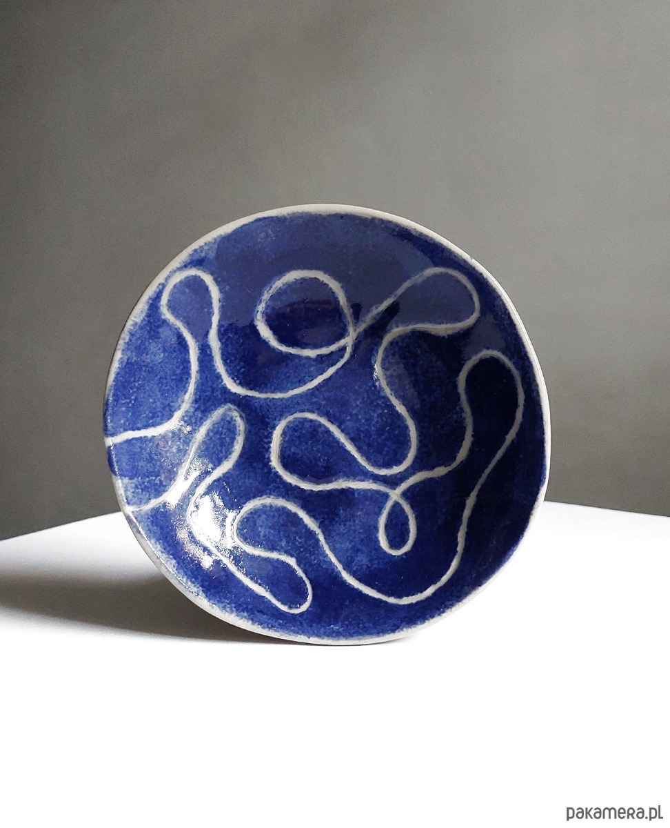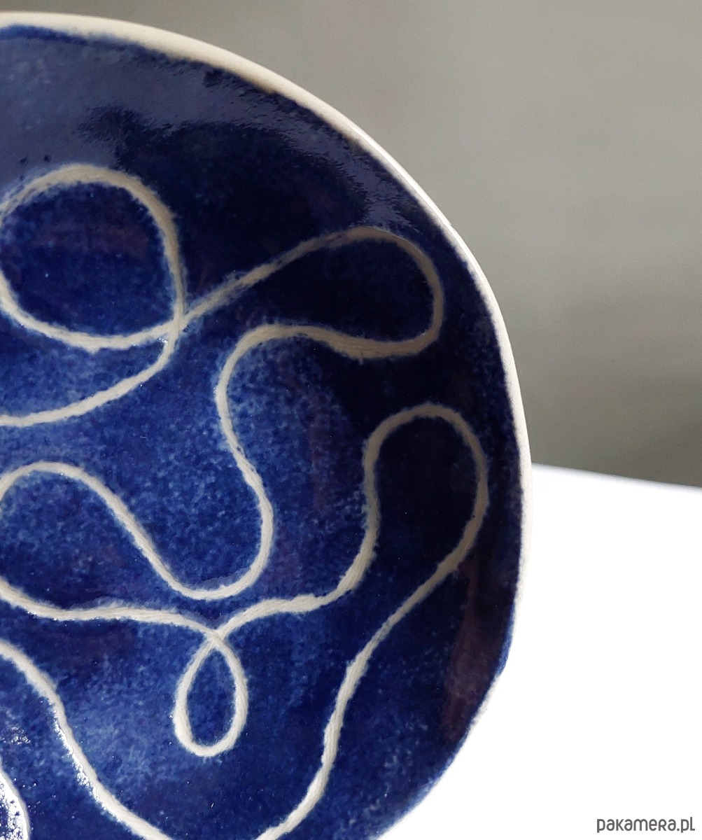 Ceramiczna miseczka ozdobiona granatową angobą.