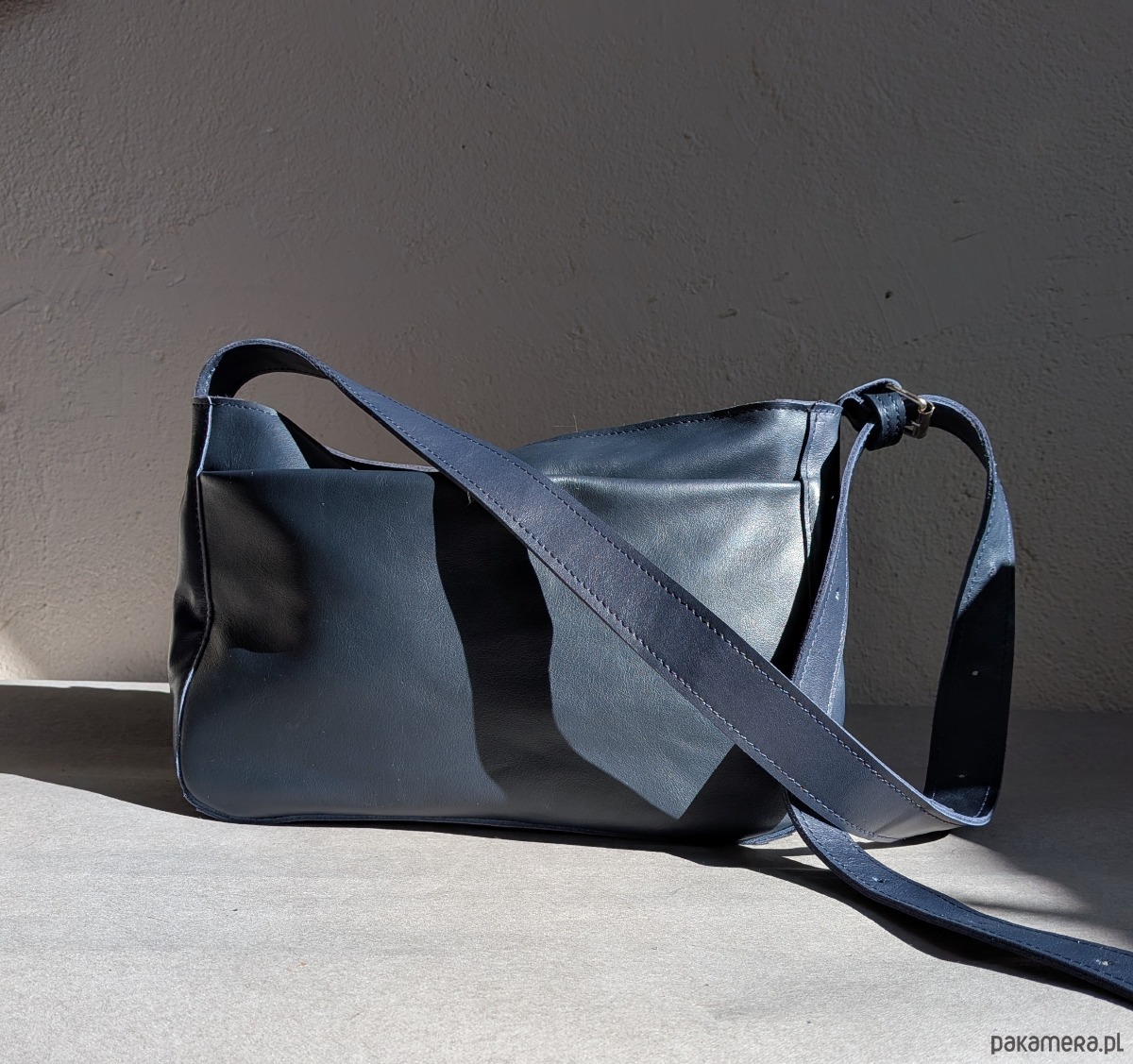 Granatowa skórzana torebka.