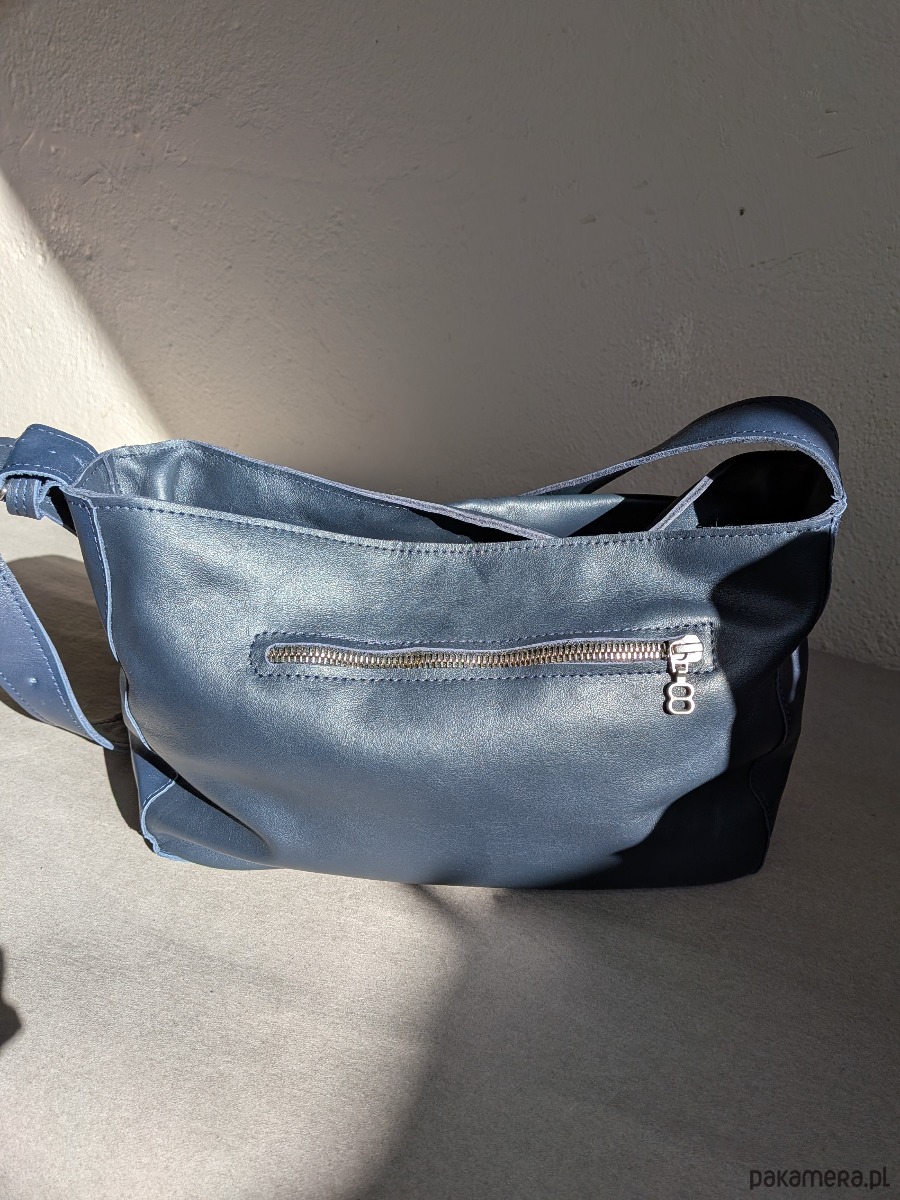 Wielkościowo jest to średniej wielkości listonoszka, która zmieści małą parasolkę, duży portfel, notes formatu a5 i sporo innych rzeczy. Przód i tył wycięte w kształcie/ wielkości kartki a4.