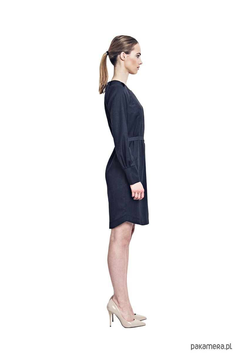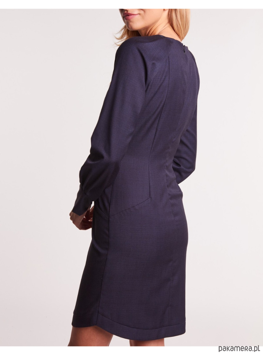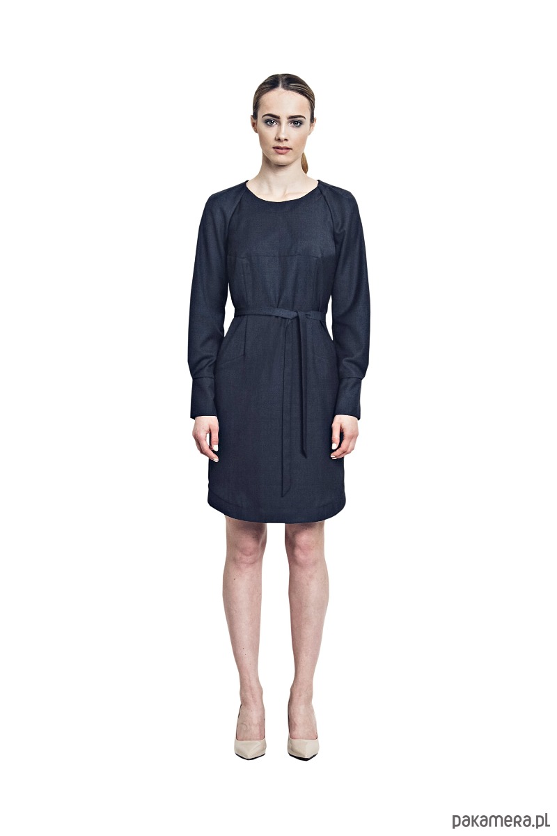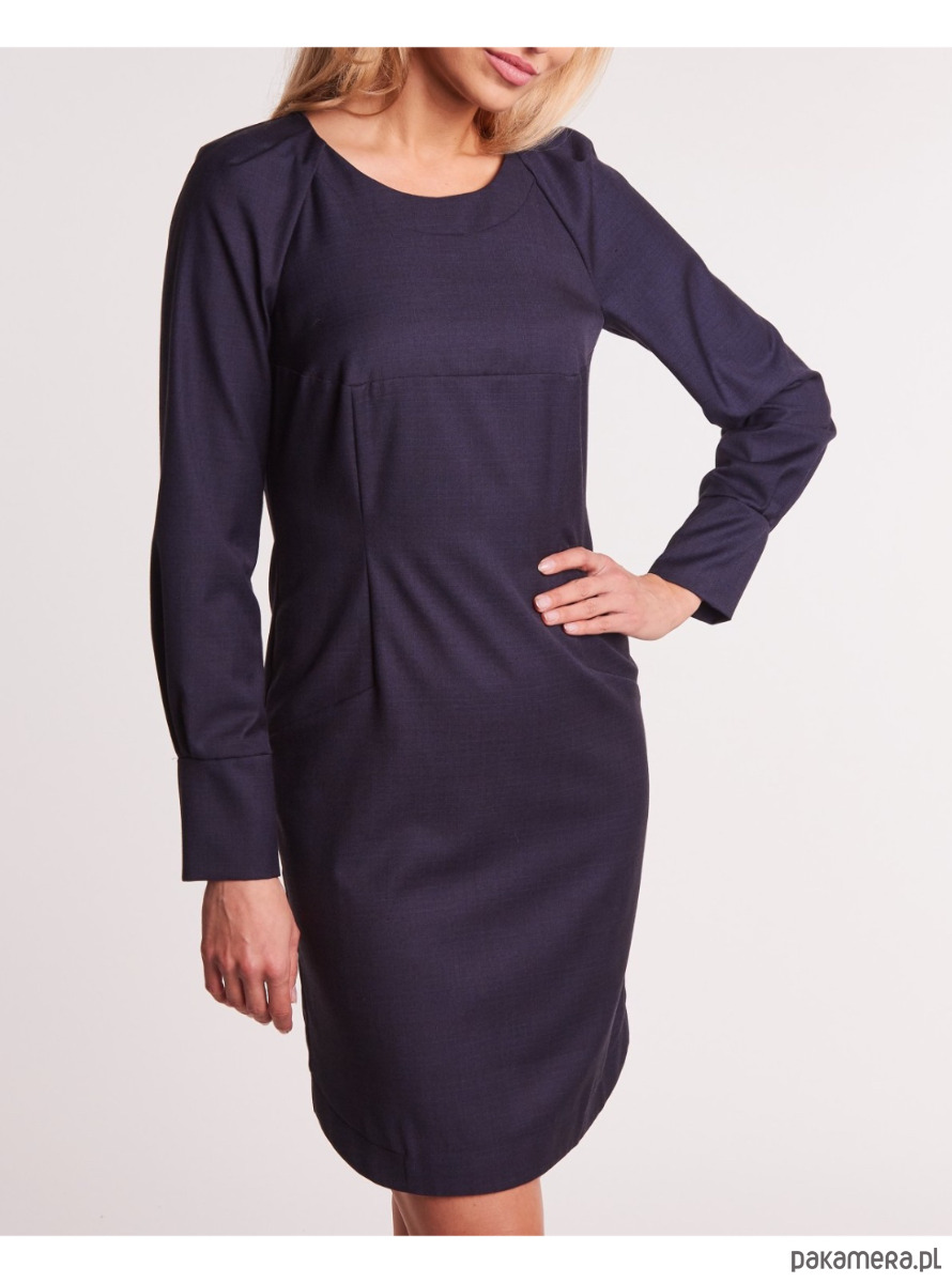 Klasyczna sukienka o prostym kroju, podkreślająca sylwetkę subtelnymi cięciami konstrukcyjnymi. Wykonana z gładkiej tkaniny w szlachetnym odcieniu granatu. Delikatnie taliowana, z wiązaniem w pasie, które pozwala dopasować fason do figury.