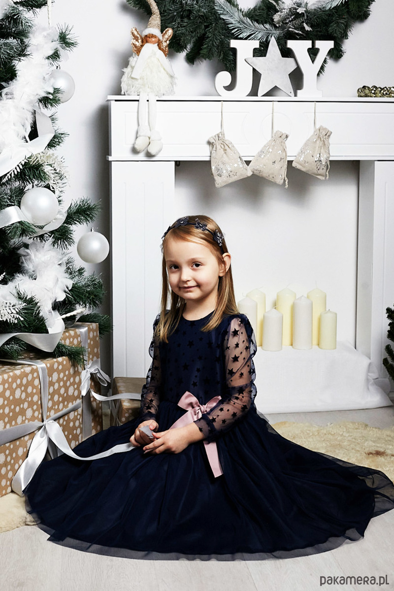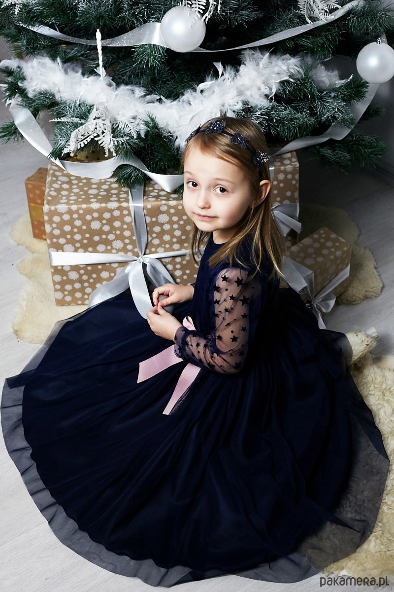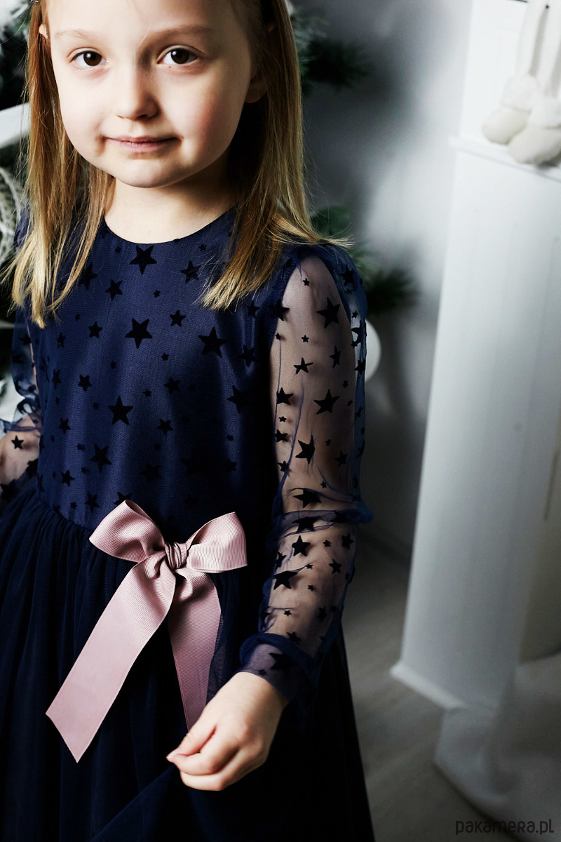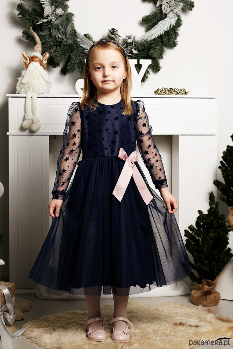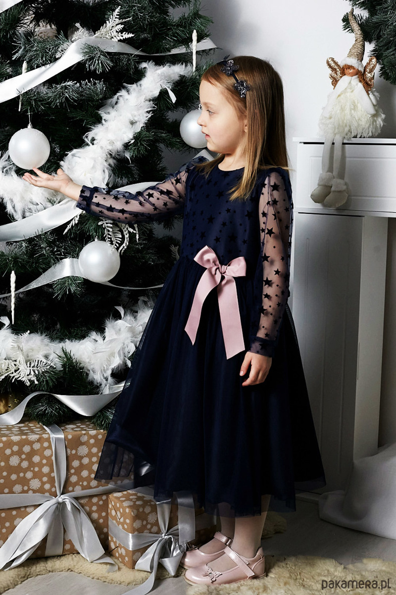 Piękna wizytowa sukienka z długim rękawem Góra wykonana z mięciutkiej siateczki w granatowe gwiazdki. W pasie ozdobiona kokardą i szarfą wiązaną z tyłu w kontrastowym różowym kolorze. Dół sukienki rozłożysty, składający się z atłasu i miękkiego tiulu. Długość do połowy łydki. Rewelacyjna na święta, wesela i wszystkie wyjątkowe okazje.