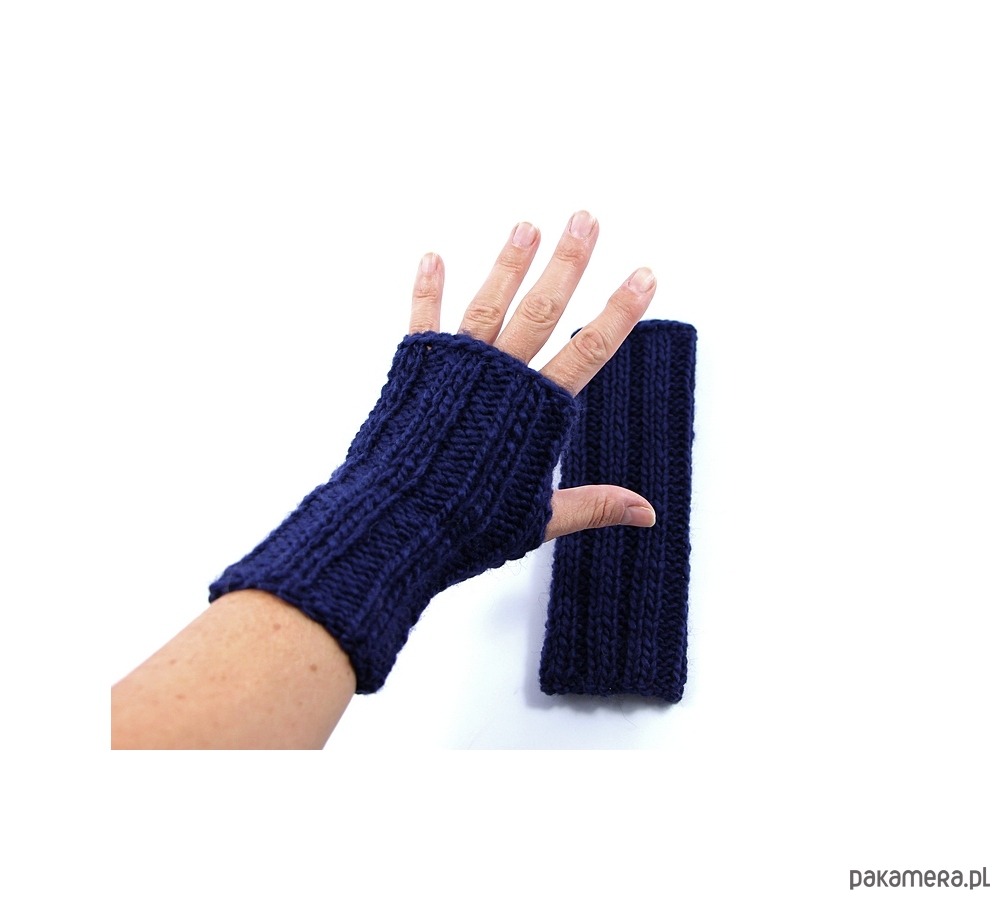 Cieplutkie mitenki zrobione na drutach z włóczki w kolorze granatowym. Z boku mają otwór na kciuk.
