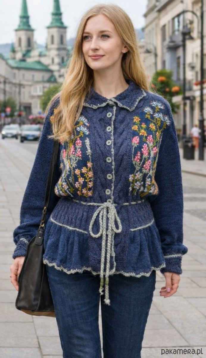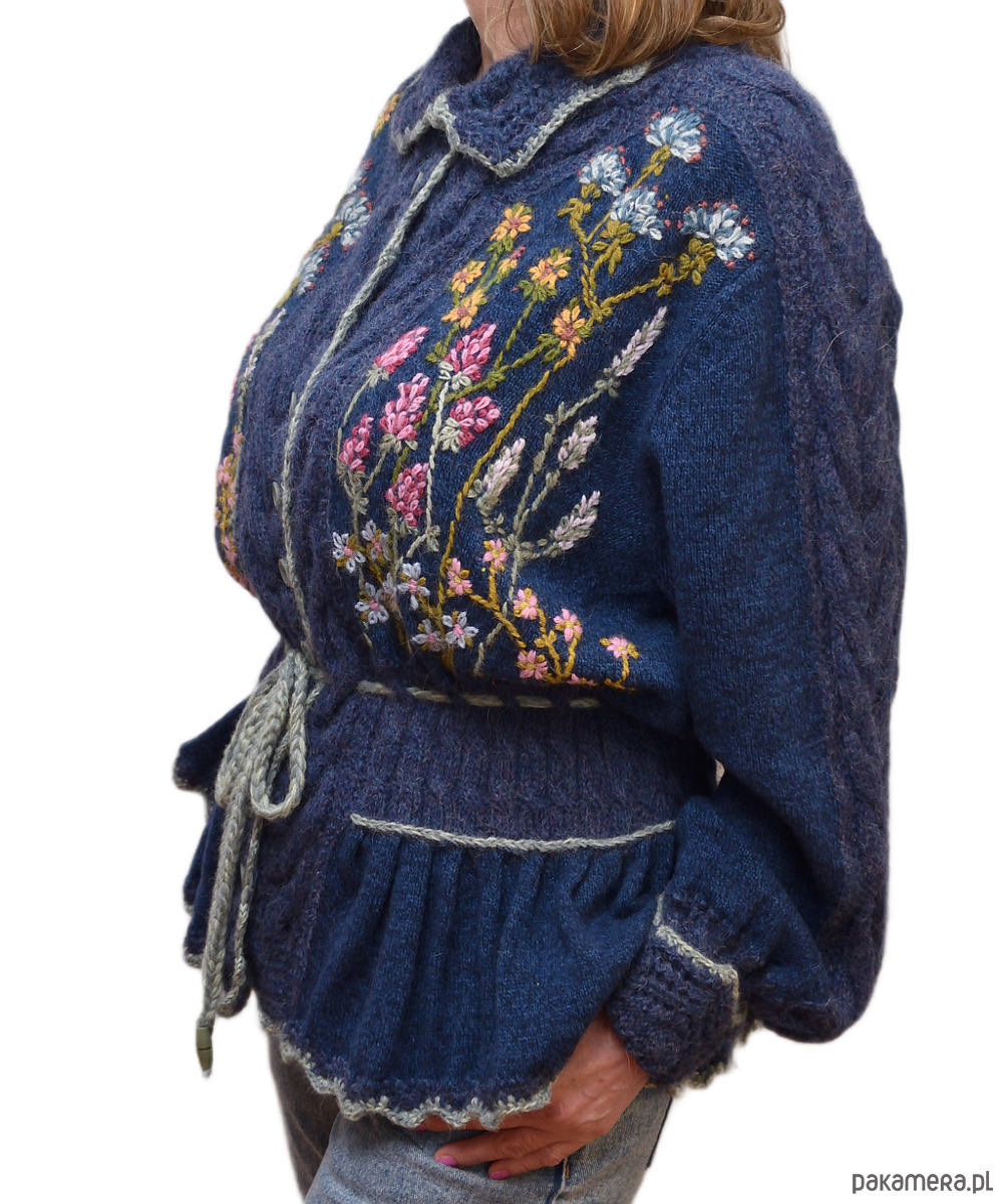 Granatowy sweter z warkoczami i haftowanymi motywami kwiatowymi, wykonany z sercem i dbałością o detale.