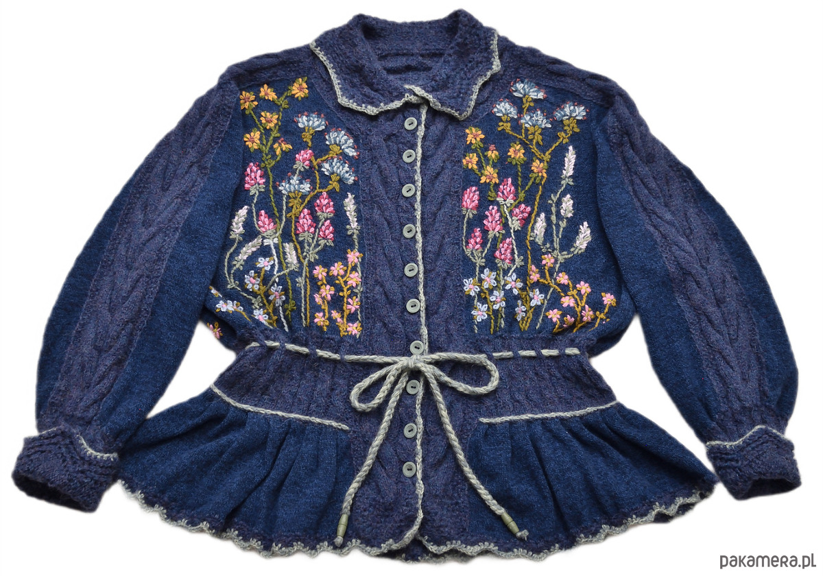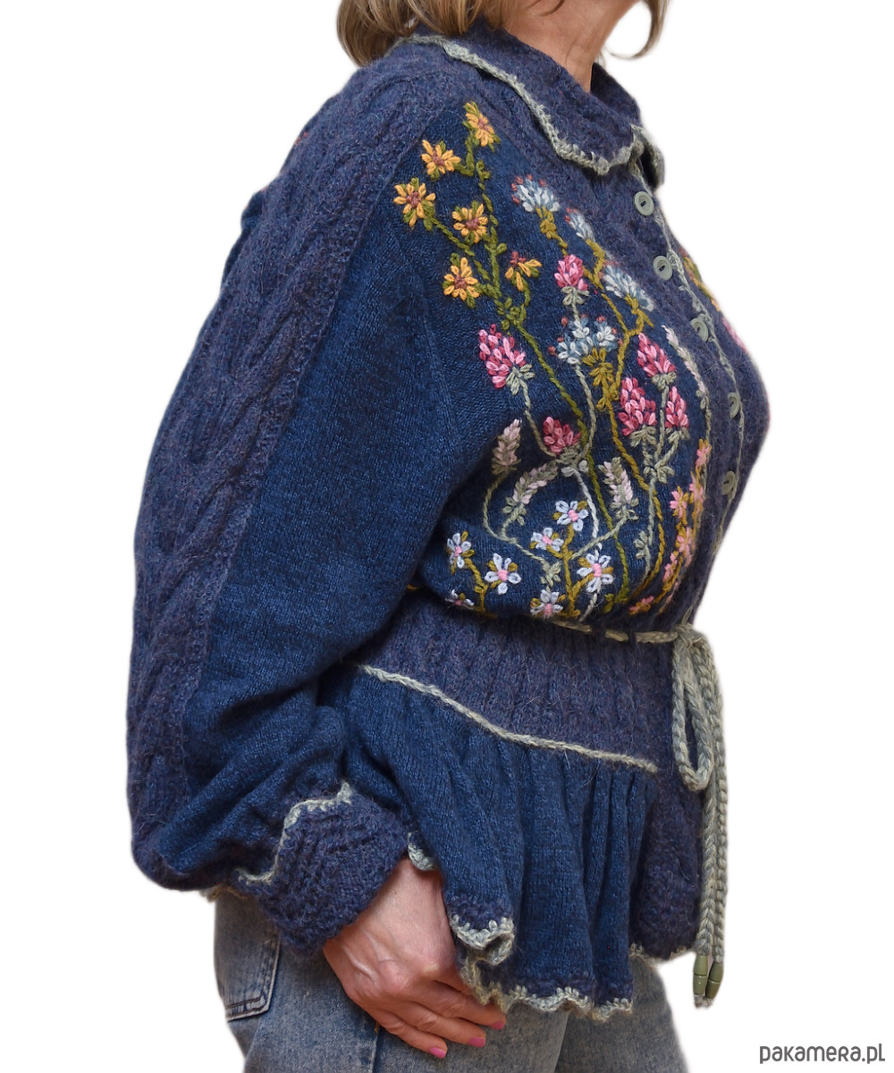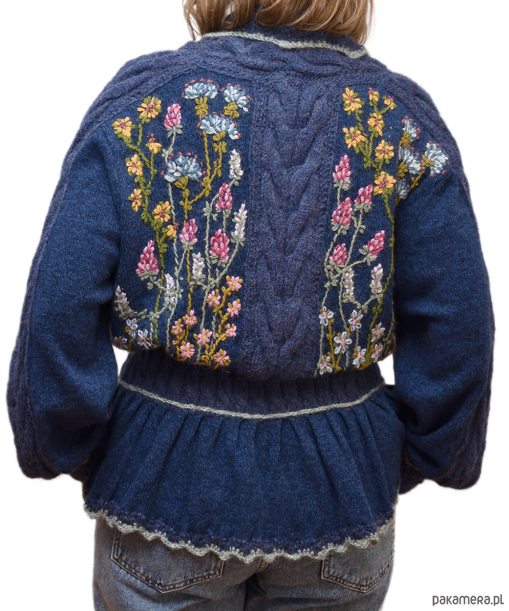 Połączenie głębokiego granatu z kompozycją strukturalnych warkoczy i kolorowych kwiatów przypominających kwitnącą łąkę sprawia, że ten sweter jest unikatowy. Ażurowy kołnierzyk, mankiety, wiązanie w talii i wykończenie dołu falbanką, dodaje mu dziewczęcej lekkości i romantyzmu. Części przodu, tyłu, rękawów i falbanka wykonane są z przyjemnej w dotyku dzianiny pochodzącej z drugiego obiegu, zawierającej 80% wełny. Pozostałe części swetra: warkocze, kołnierzyk, mankiety i wiązanie, zostały wydziergane ręcznie ze 100% alpaki. Kolorowej alpaki użyto także do haftowania.