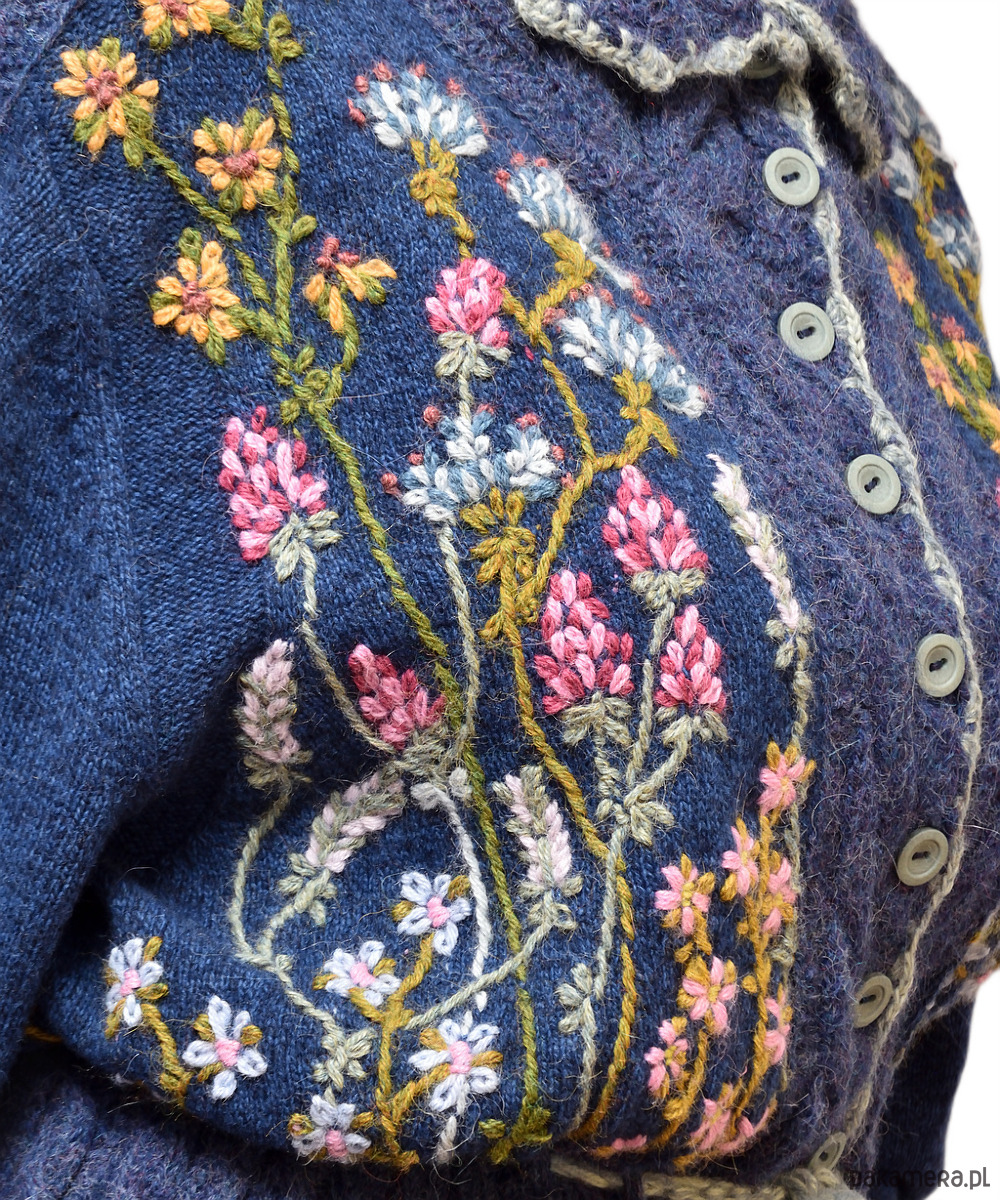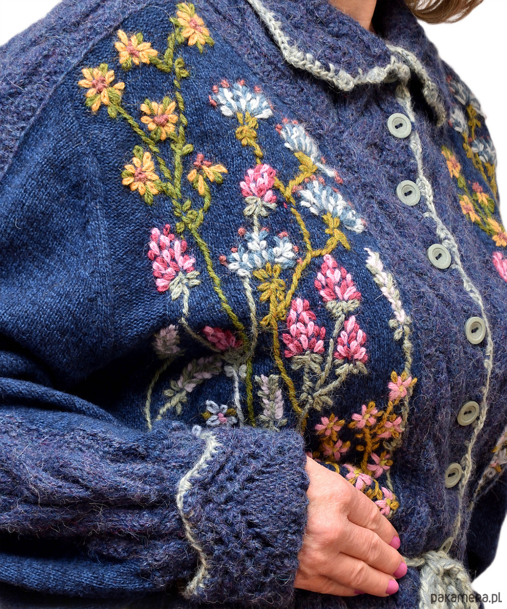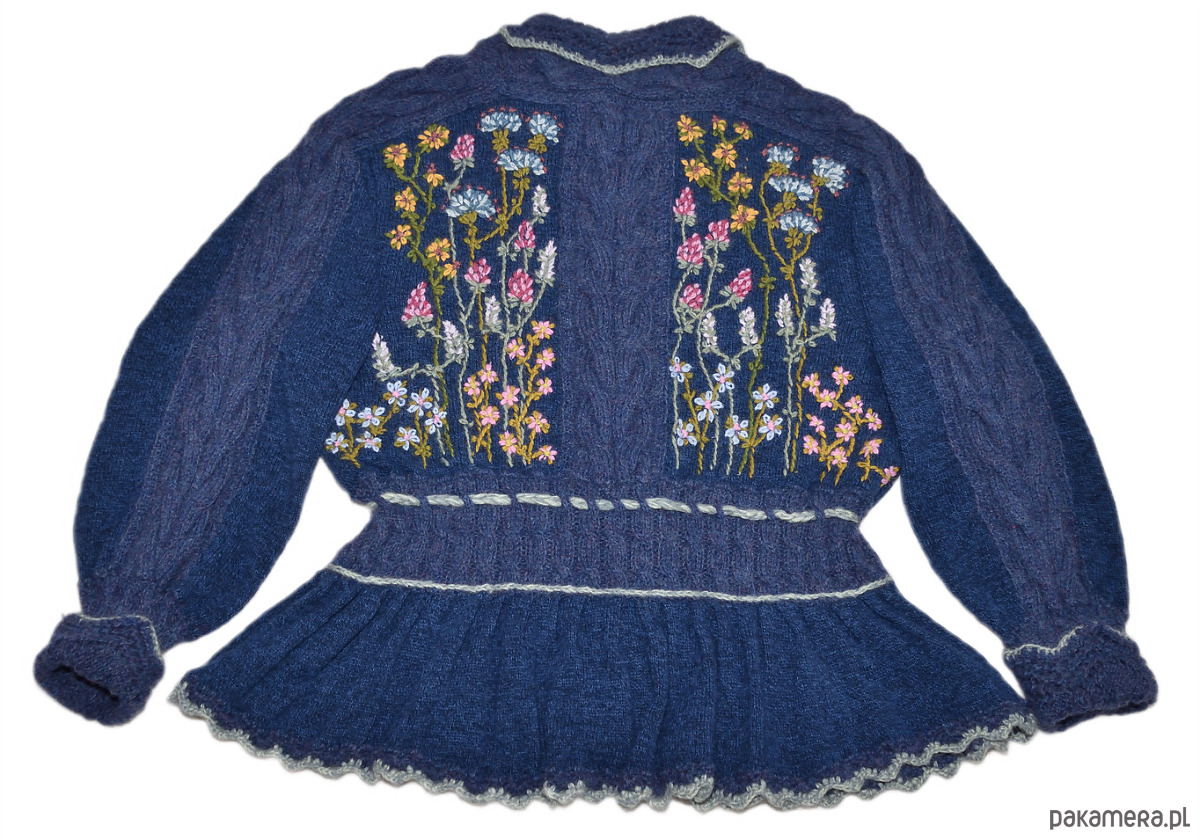 Połączenie głębokiego granatu z kompozycją strukturalnych warkoczy i kolorowych kwiatów przypominających kwitnącą łąkę sprawia, że ten sweter jest unikatowy. Ażurowy kołnierzyk, mankiety, wiązanie w talii i wykończenie dołu falbanką, dodaje mu dziewczęcej lekkości i romantyzmu. Części przodu, tyłu, rękawów i falbanka wykonane są z przyjemnej w dotyku dzianiny pochodzącej z drugiego obiegu, zawierającej 80% wełny. Pozostałe części swetra: warkocze, kołnierzyk, mankiety i wiązanie, zostały wydziergane ręcznie ze 100% alpaki. Kolorowej alpaki użyto także do haftowania.