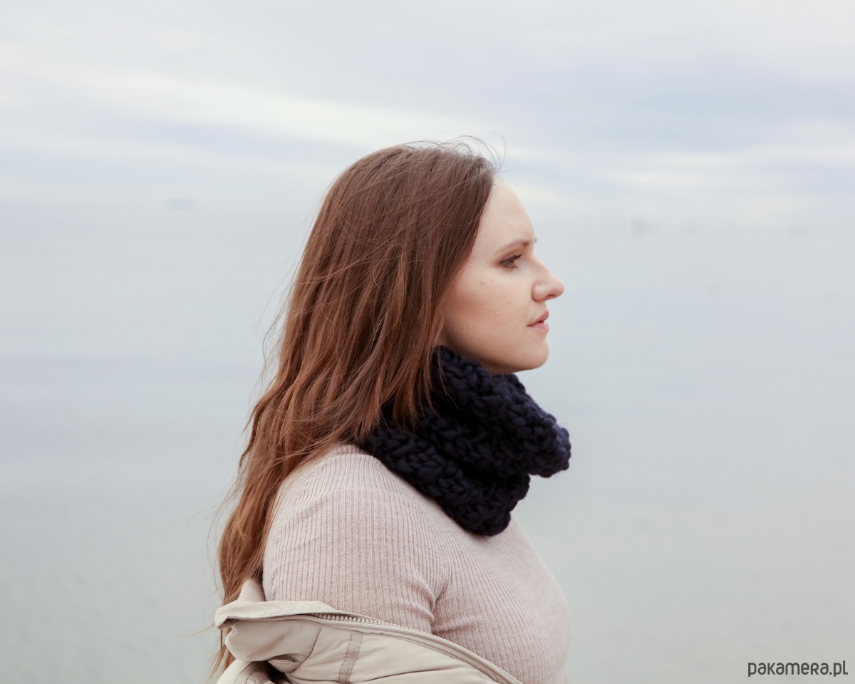 Jest w kształcie bezszwowej tuby, aby lepiej otulał szyję i wygodnie układał się na karku po zapięciu kurtki czy płaszcza. Wykonałam go na drutach dwustronnym ściegiem, więc możesz estetycznie go wywijać. Jest gruby, ale nie ciężki. Ciepły, miękki, o świetnych właściwościach termoregulacyjnych.