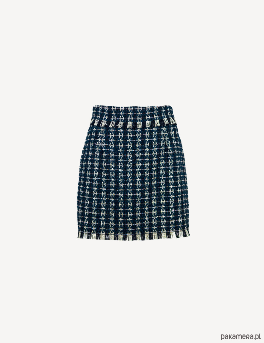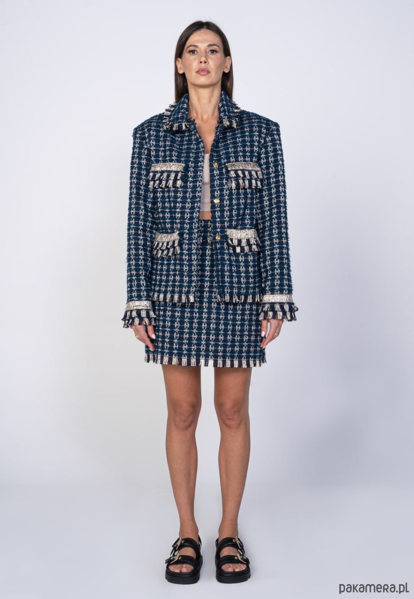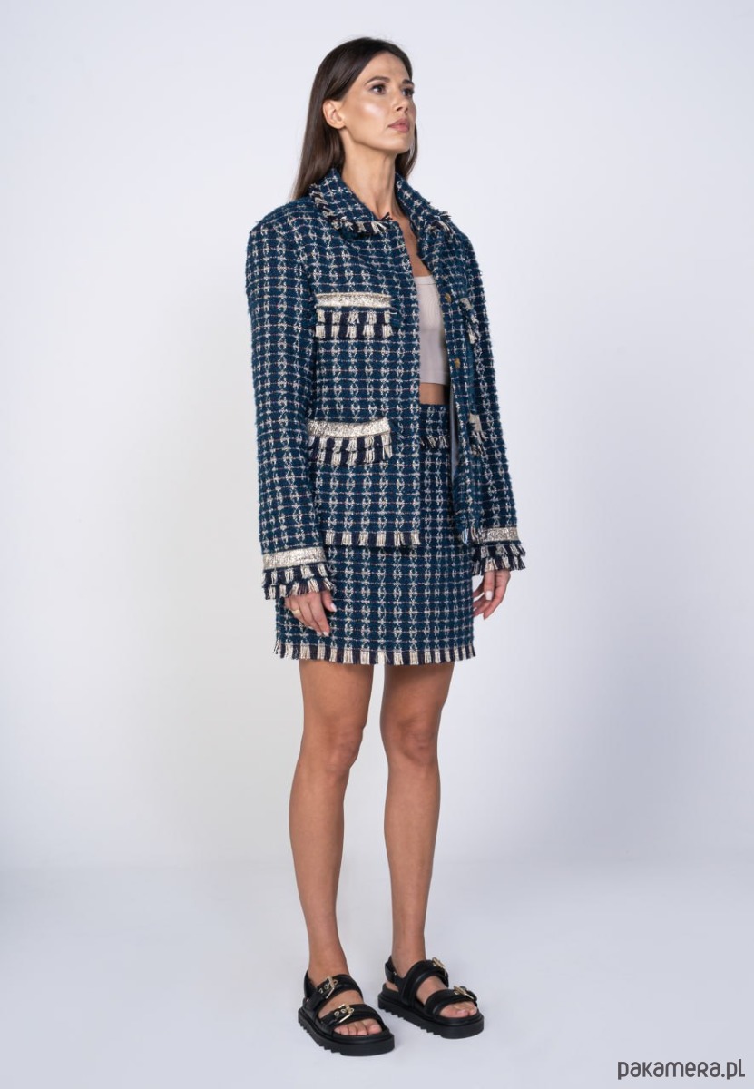 W skład zestawu wchodzi zapinana na zatrzaski kurtka oraz spódnica mini zapinana po boku na zamek błyskawiczny.