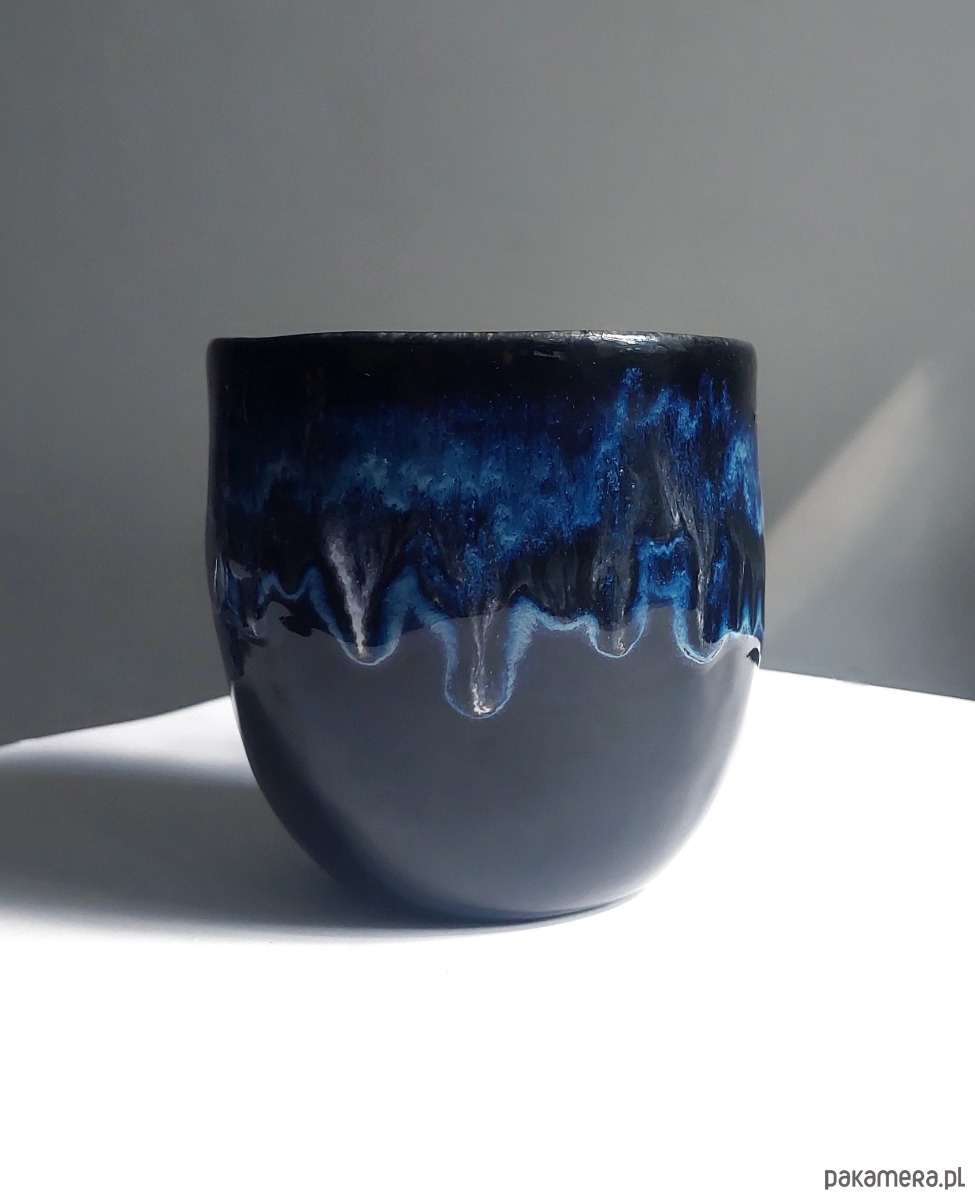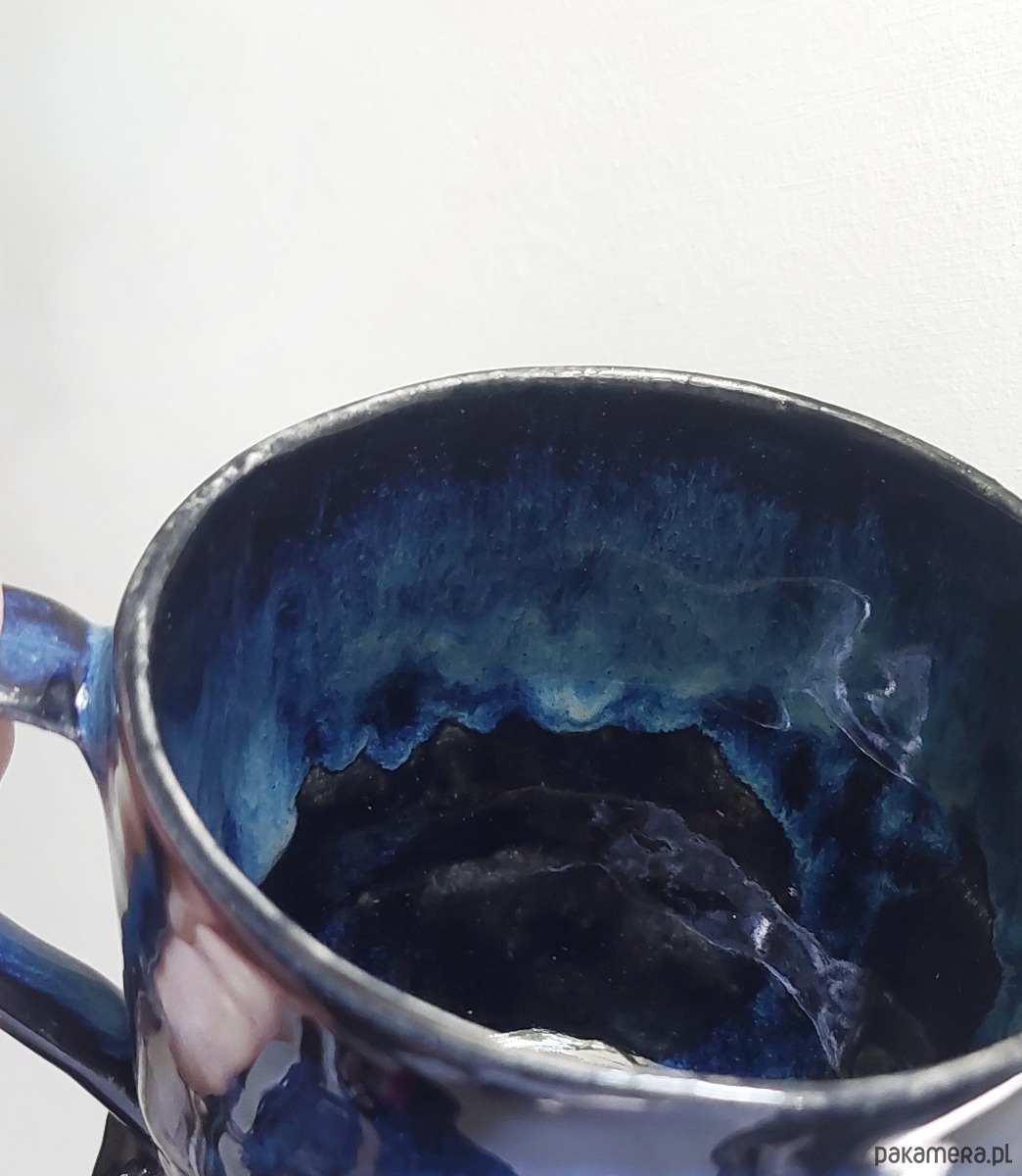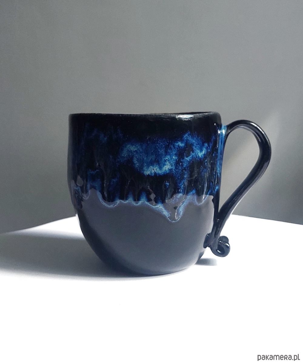 Kubek z uchem ozdobiony granatowym szkliwem z błękitno-białymi przebiciami.