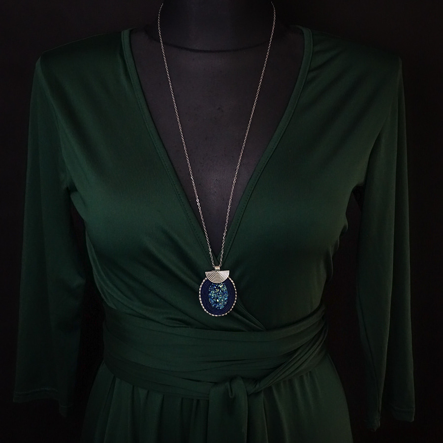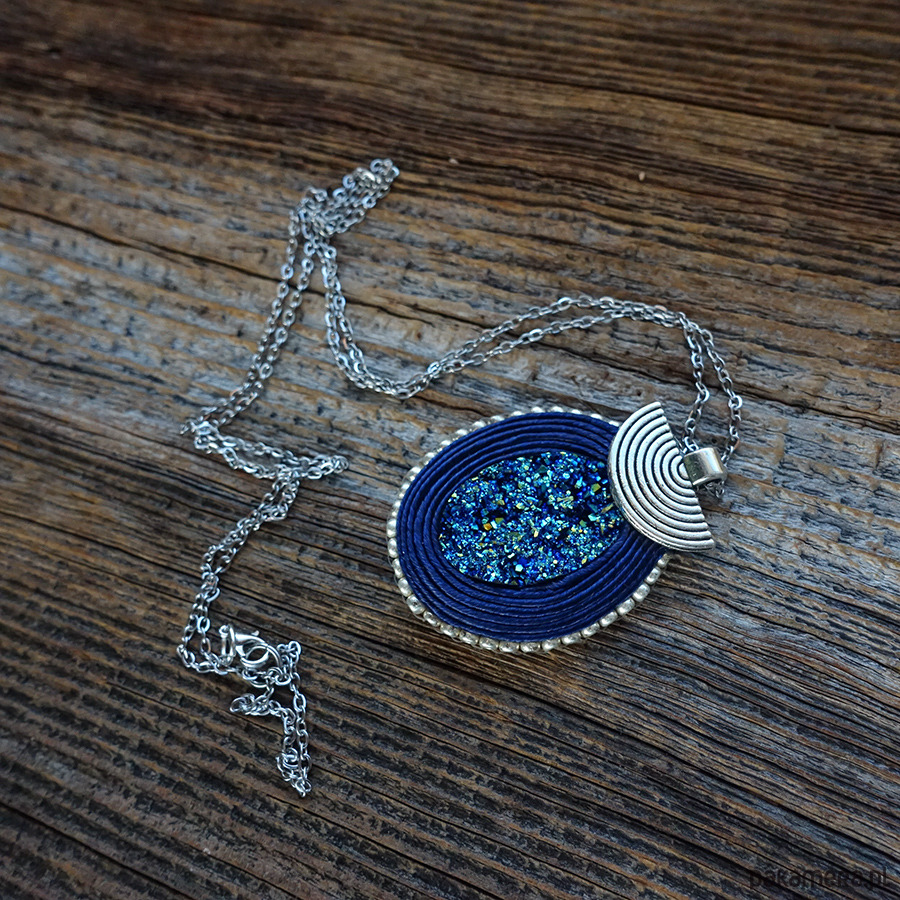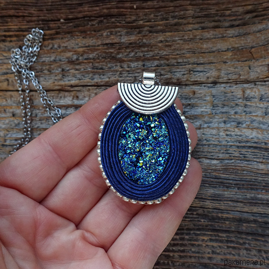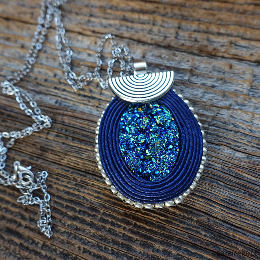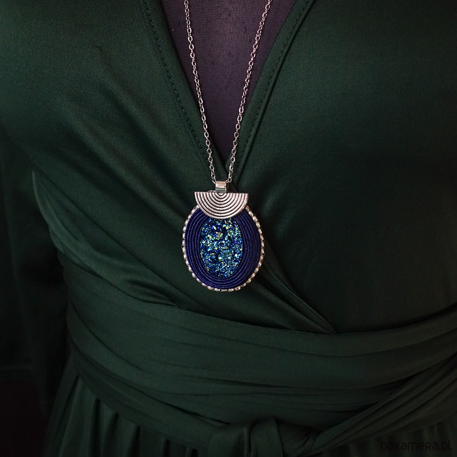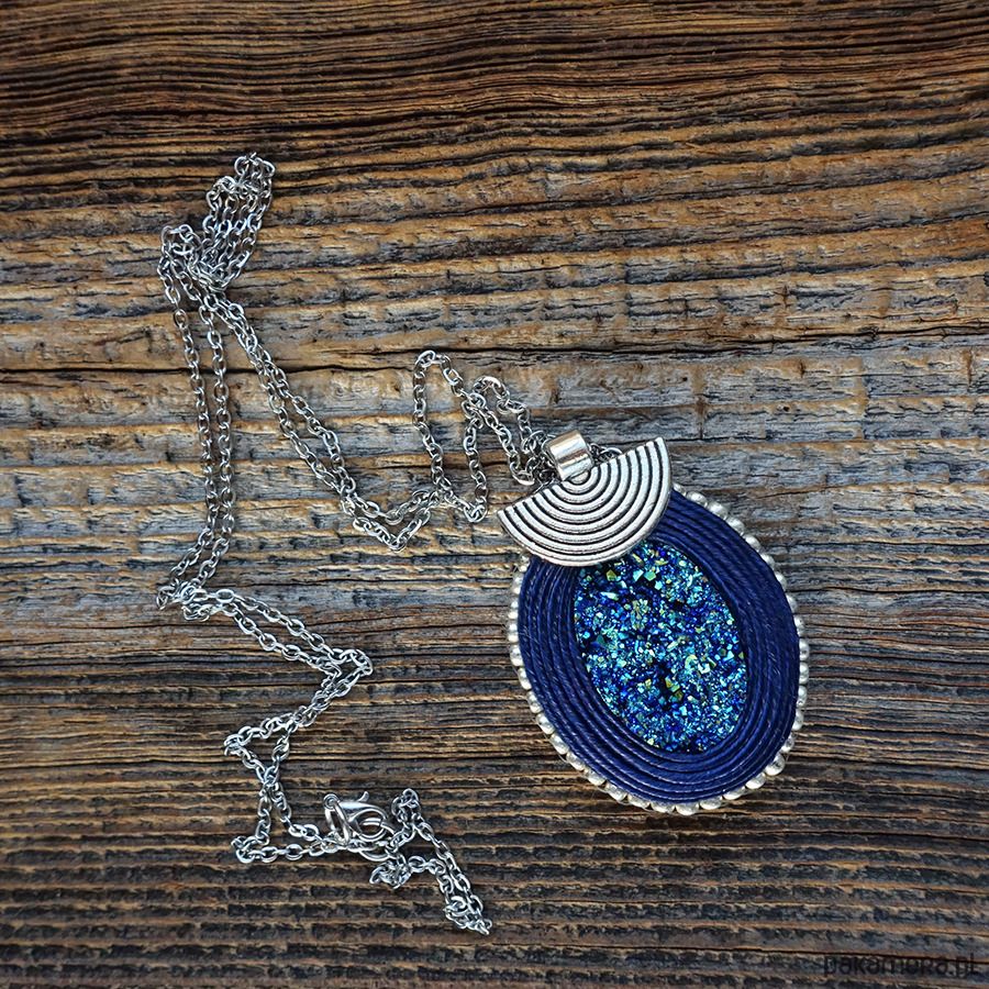 Wisior o nowoczesnej, minimalistycznej formie, w której centralnym elementem jest połyskujący kaboszon typu druzy. To propozycja dla osób, które lubią granatowe akcenty i delikatny srebrny błysk.