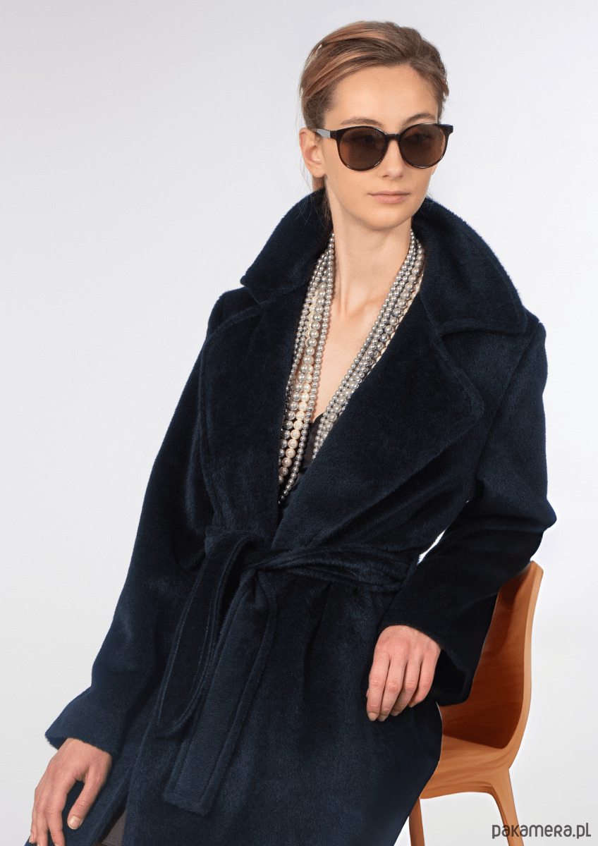 Granatowy płaszcz z alpaki i kaszmiru – krój szlafrokowy