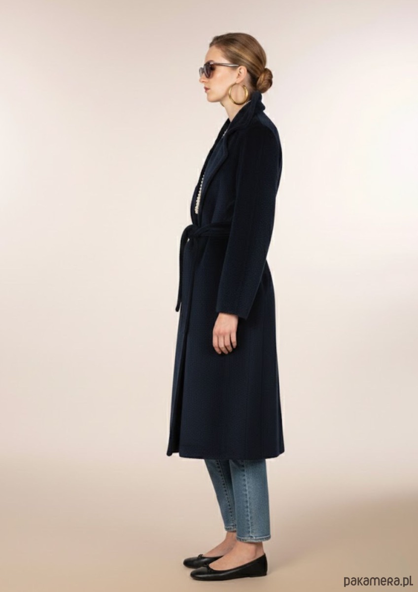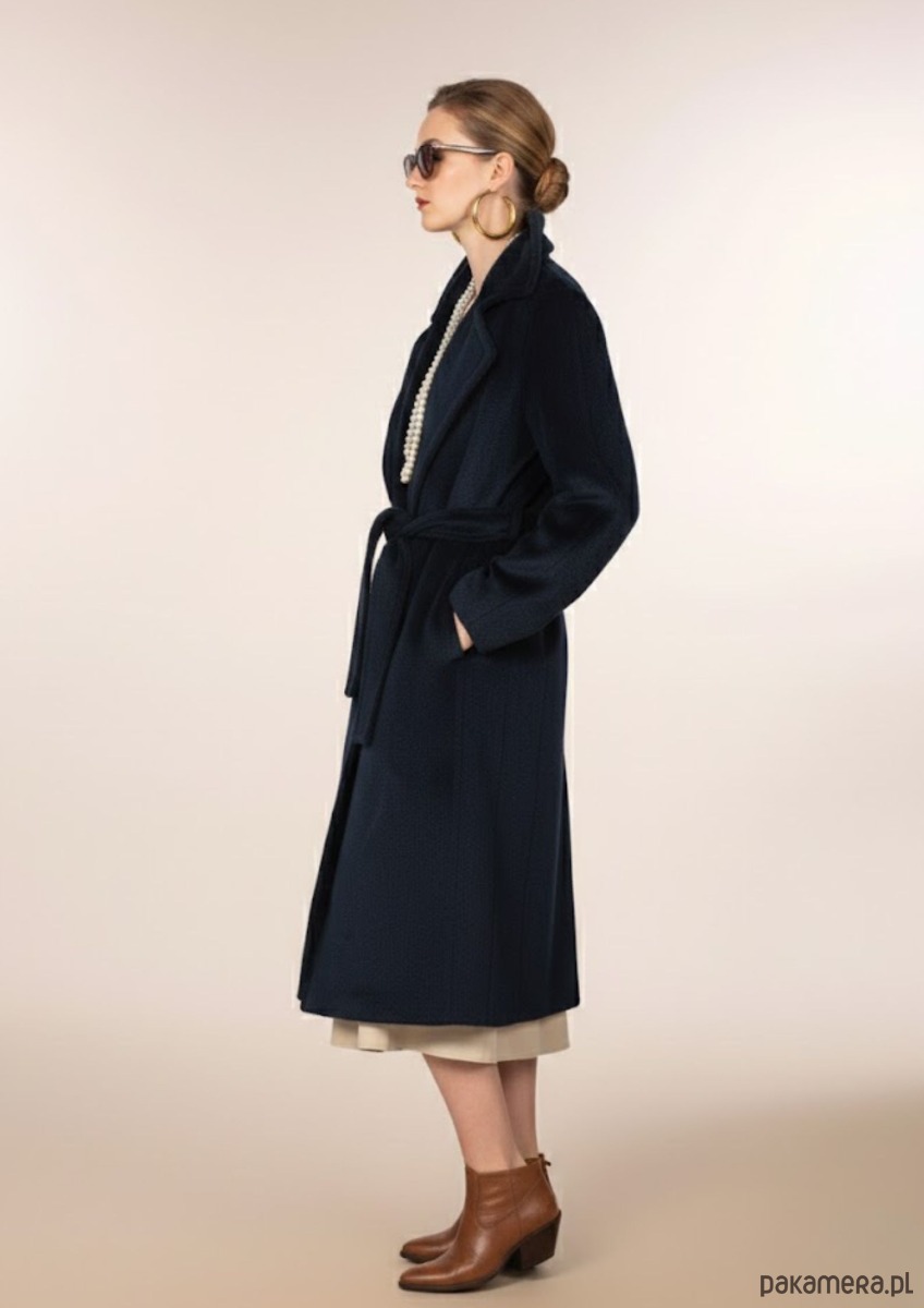 Granatowy płaszcz z alpaki i kaszmiru – krój szlafrokowy