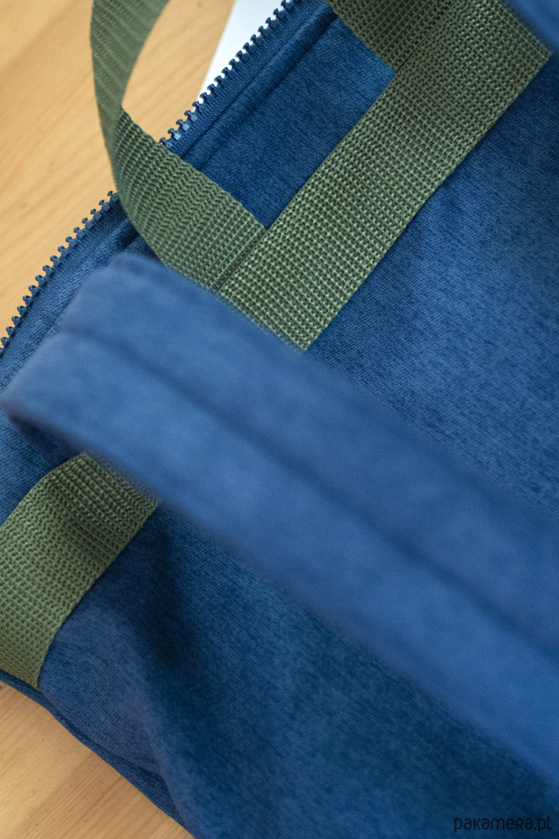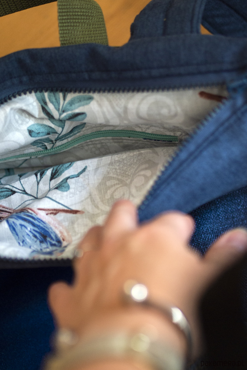 Regulowane paski. W środku biała, bawełniana podszewka w kwiaty oraz mała kieszonka na suwak.