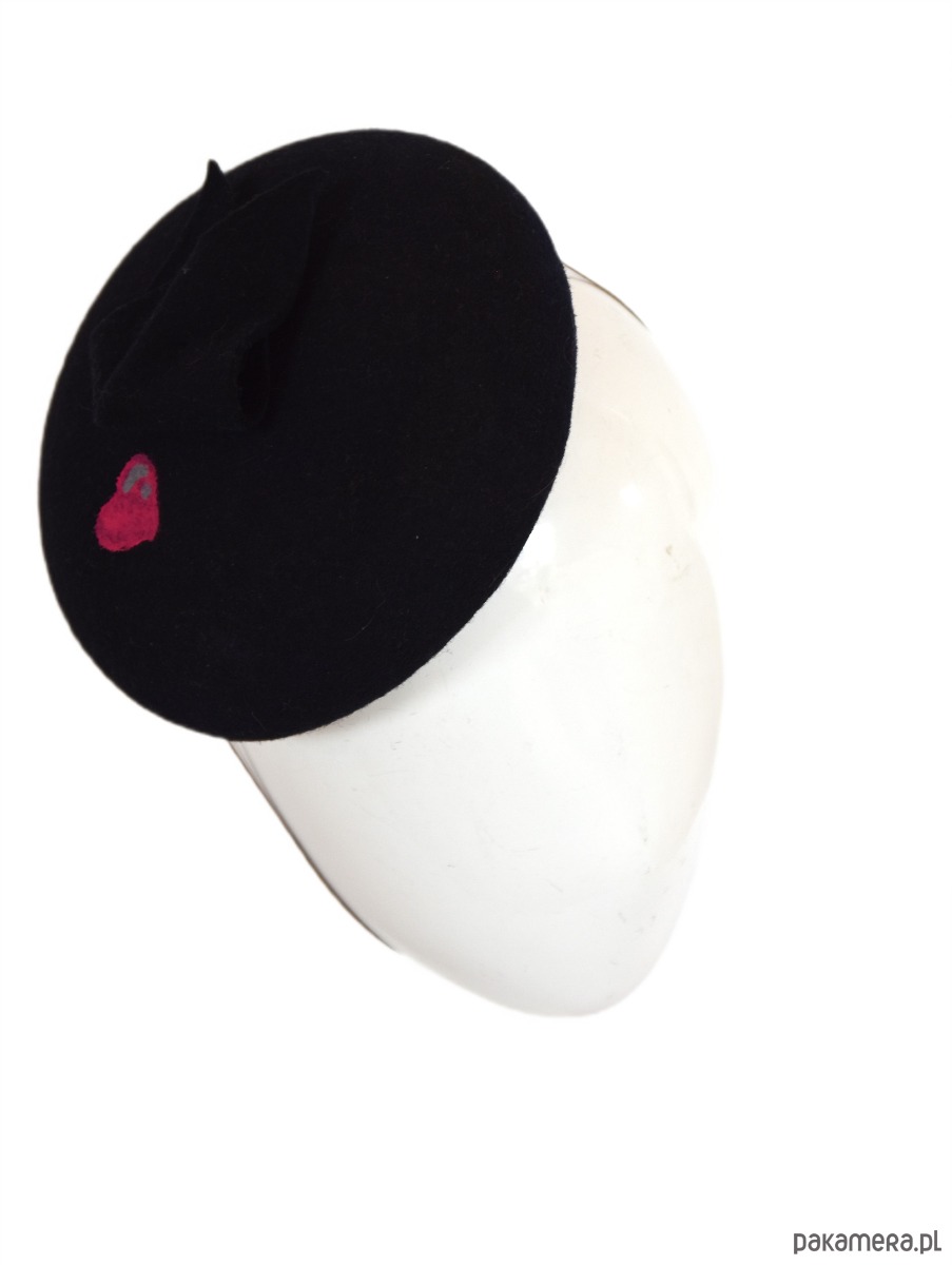 Toczek wykonany z filcu w kolorze ciemnego granatu. Zdobiony malowanym serduszkiem.. Mocowany na gumce kapeluszowej. Rozmiar 20cm średnica