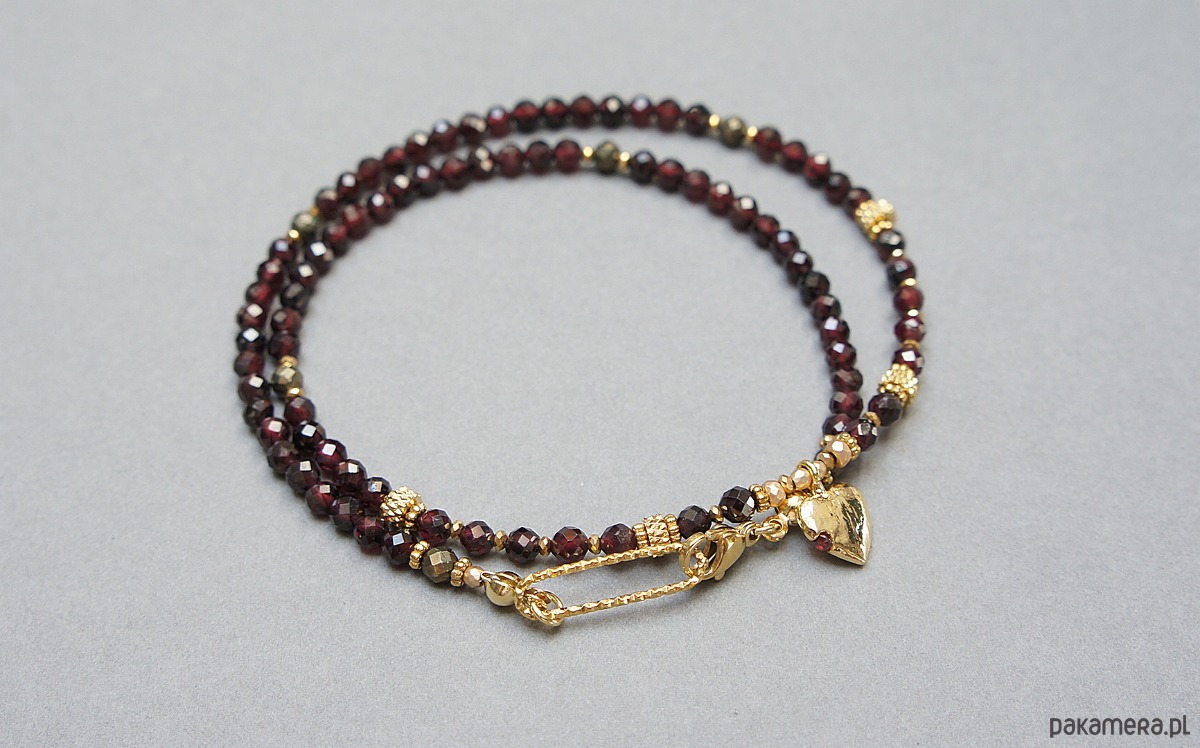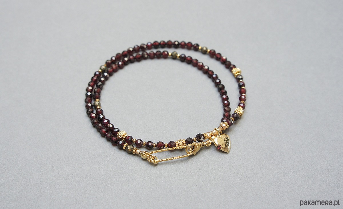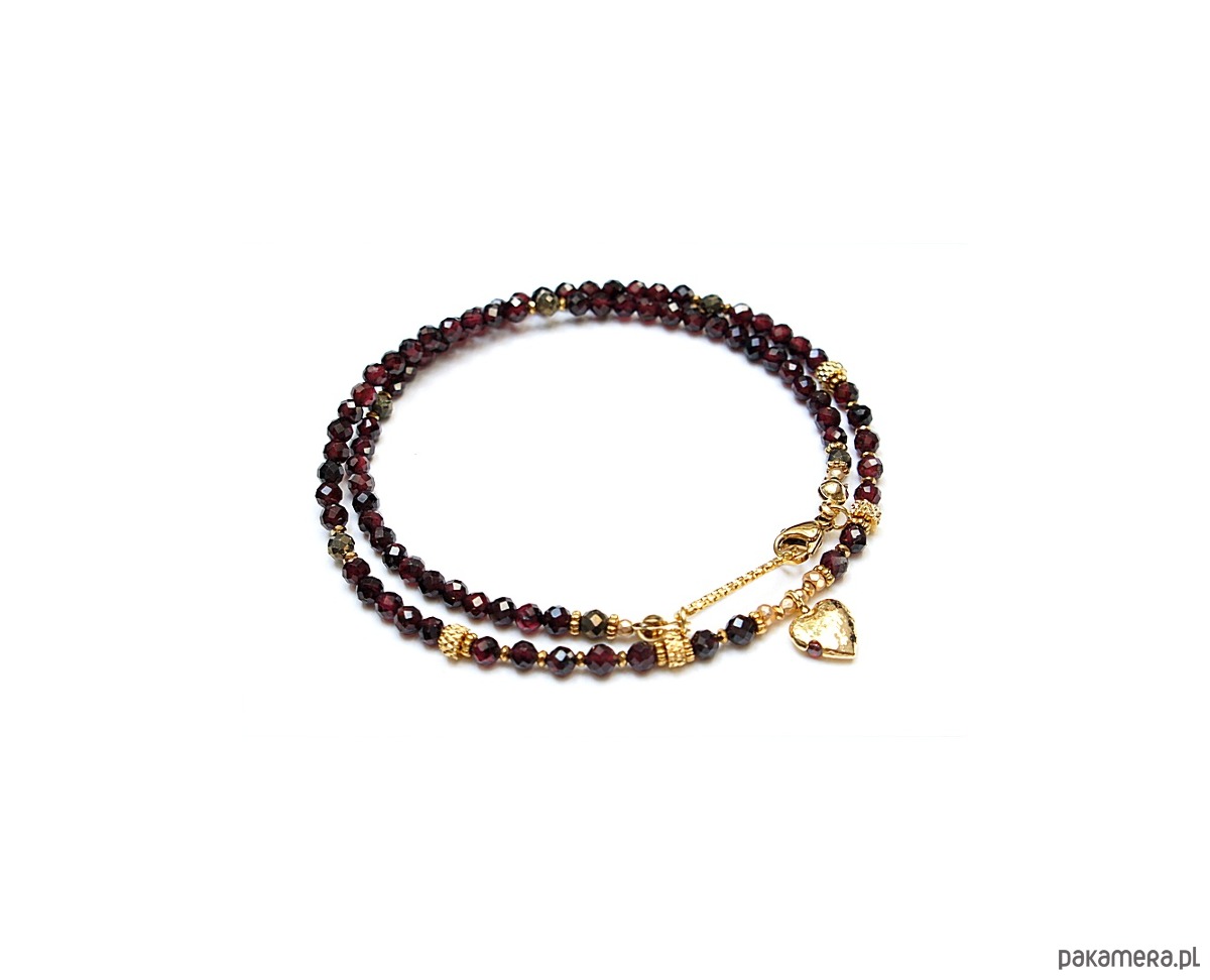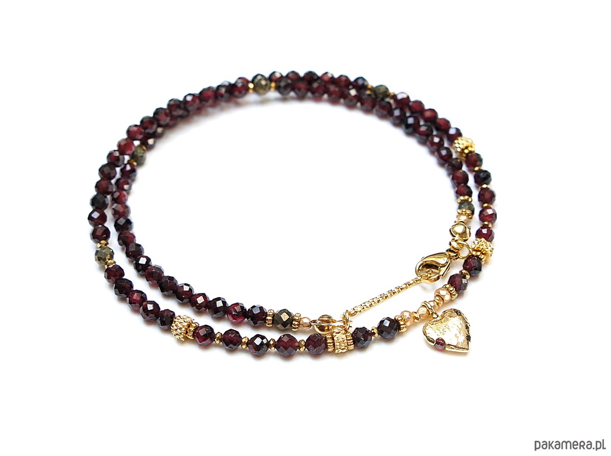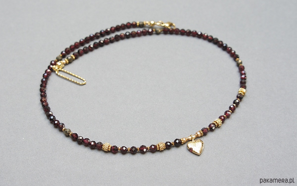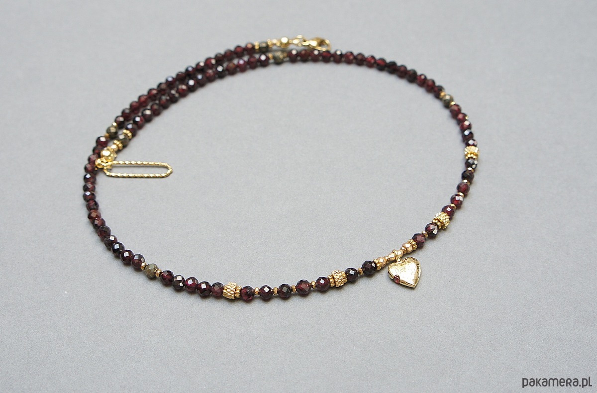 Krótki, delikatny naszyjnik wykonany w całości z pozłacanej stali szlachetnej oraz naturalnych, szlachetnych kamieni - fasetowane granaty [3mm], piryt fasetowany o surowym wyglądzie [3mm], hematyt fasetowany, platerowany [2mm i 3mm], przekładek z hematytu [1mm]. Naszyjnik o długości ok. 43cm.
