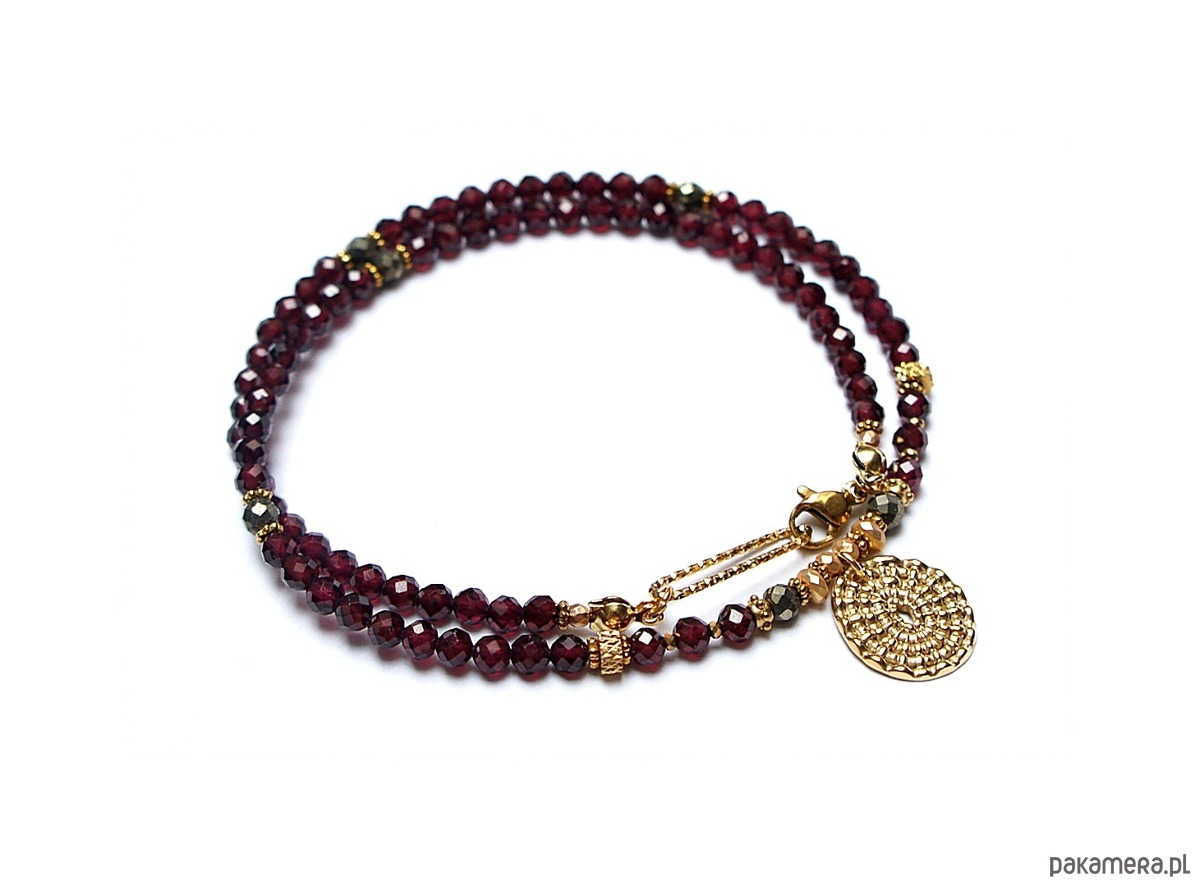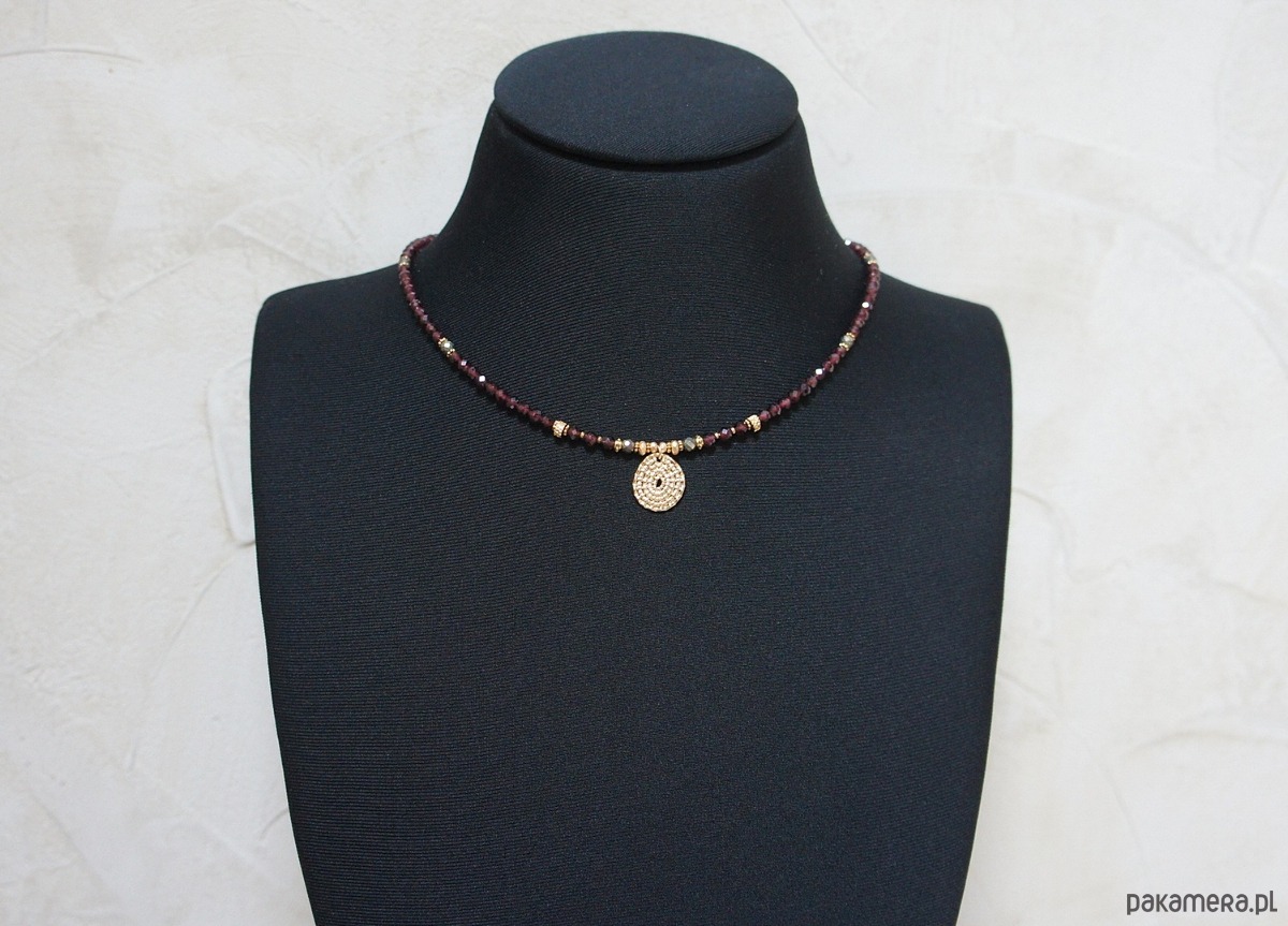 Krótki, delikatny naszyjnik wykonany w całości z pozłacanej stali szlachetnej oraz naturalnych, szlachetnych kamieni - fasetowane granaty [4mm], piryt fasetowany o surowym wyglądzie [4mm], hematyt fasetowany, platerowany [2mm i 3mm], przekładek z hematytu [1mm]. Naszyjnik o długości ok. 43cm.