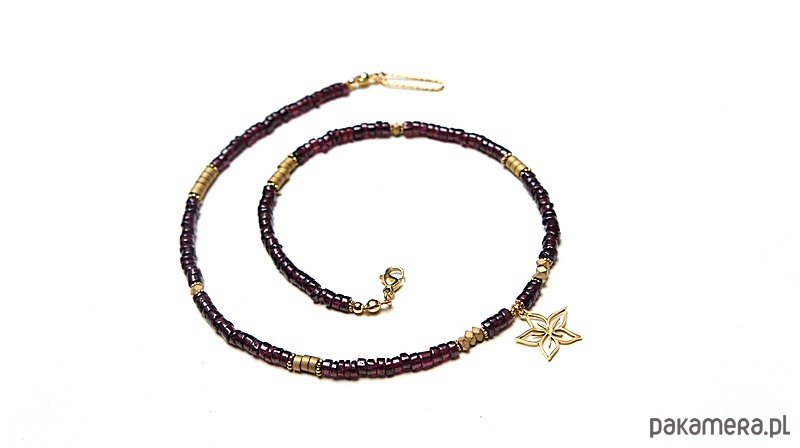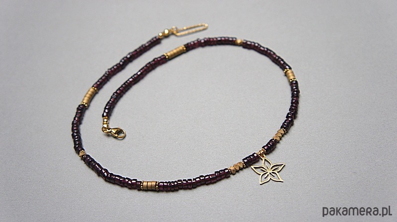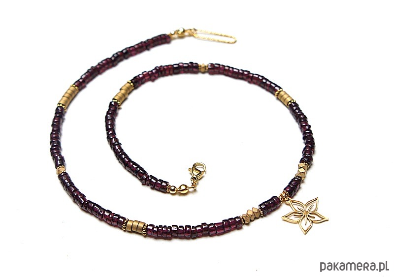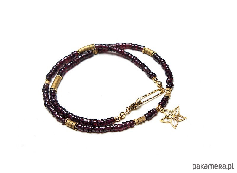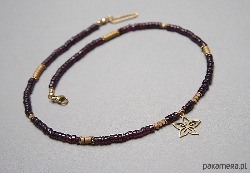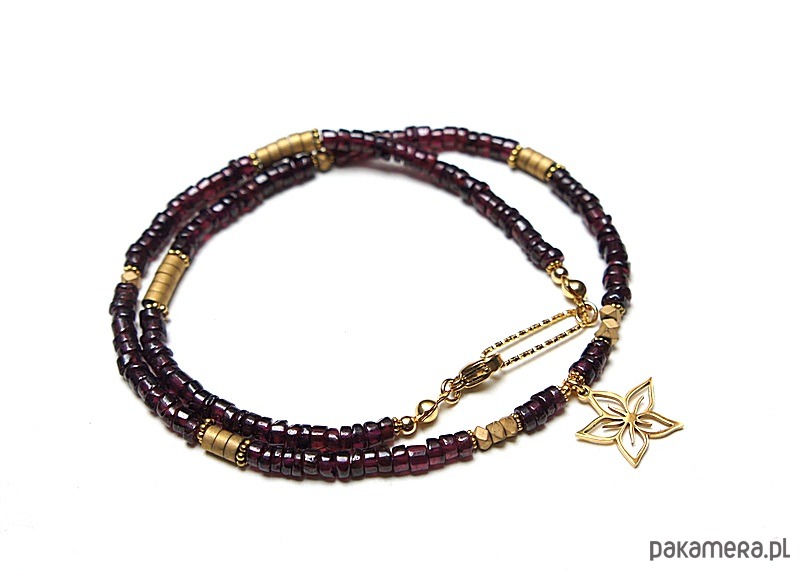 Krótki, delikatny naszyjnik wykonany w całości z pozłacanej stali szlachetnej oraz naturalnych, szlachetnych kamieni - talarki nieregularnego granatu [4,5 x 2-3mm] oraz przekładek z hematytu [4 x 2mm]. Naszyjnik o długości 44,2cm.
