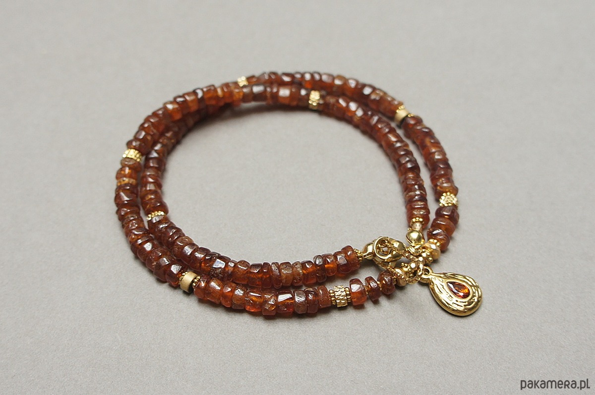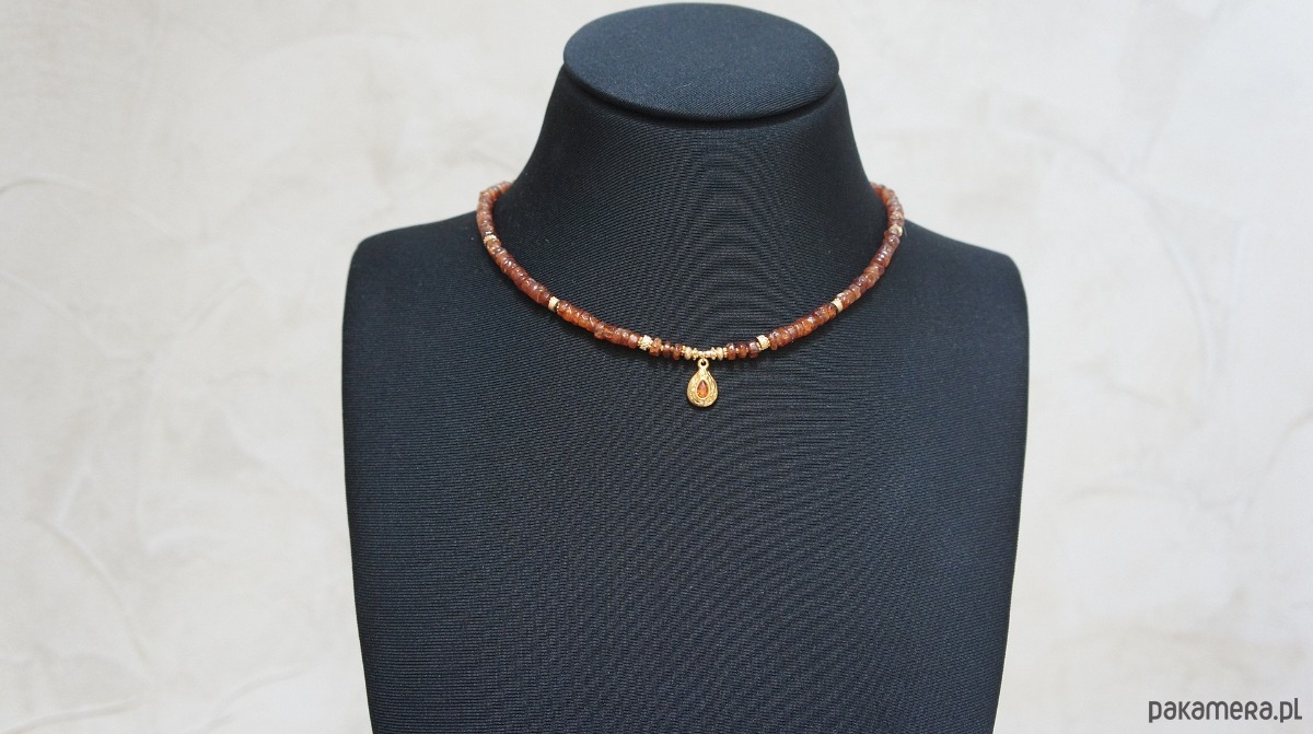 Krótki naszyjnik wykonany w całości z pozłacanej stali szlachetnej oraz naturalnych, szlachetnych kamieni - talarki nieregularnego granatu hessonit [4,5 x 2-3mm], talarków matowego hematytu [4 x 2mm], oponek fasetowanego, platerowanego hematytu [3x2mm], przekładek z hematytu [1mm]. Naszyjnik o długości ok. 42cm.