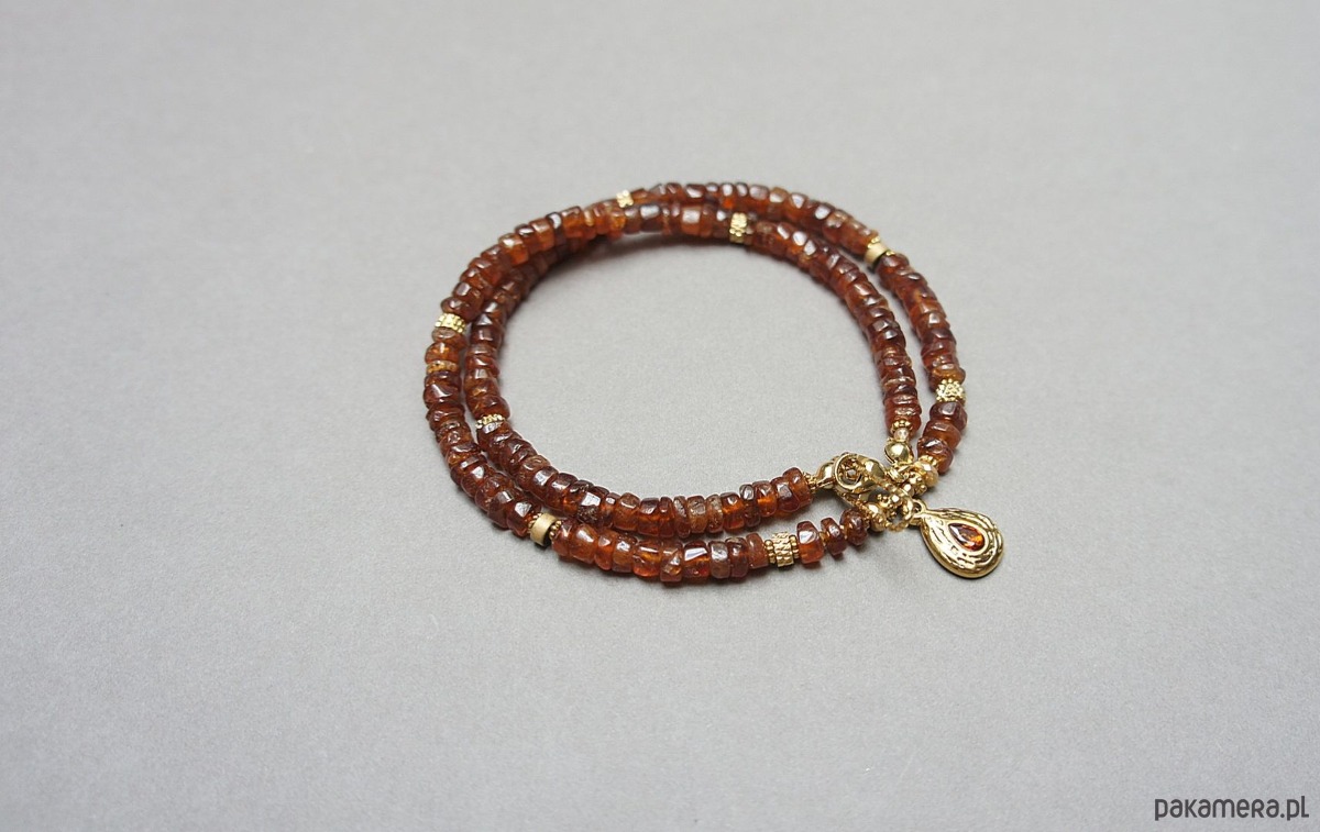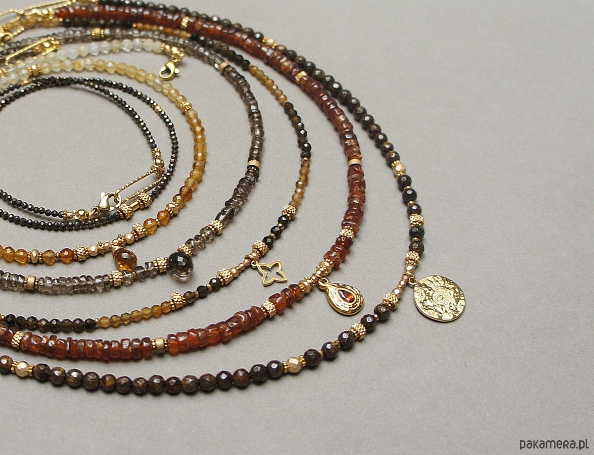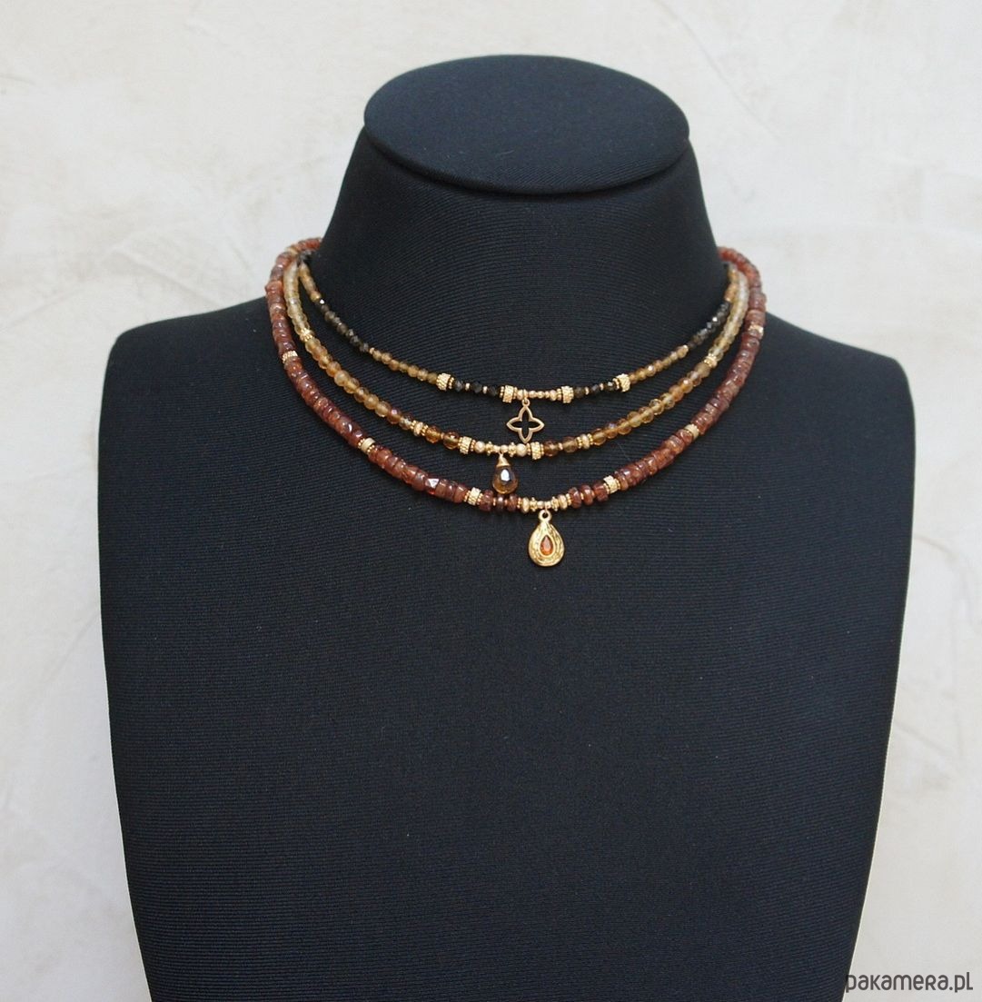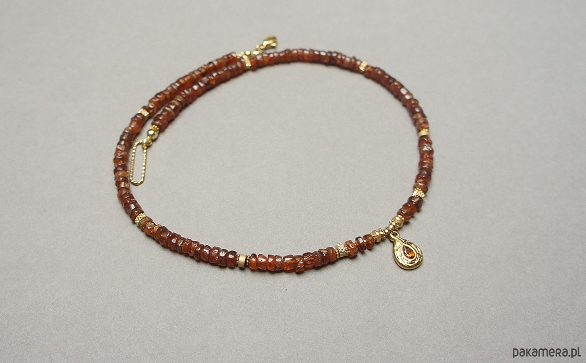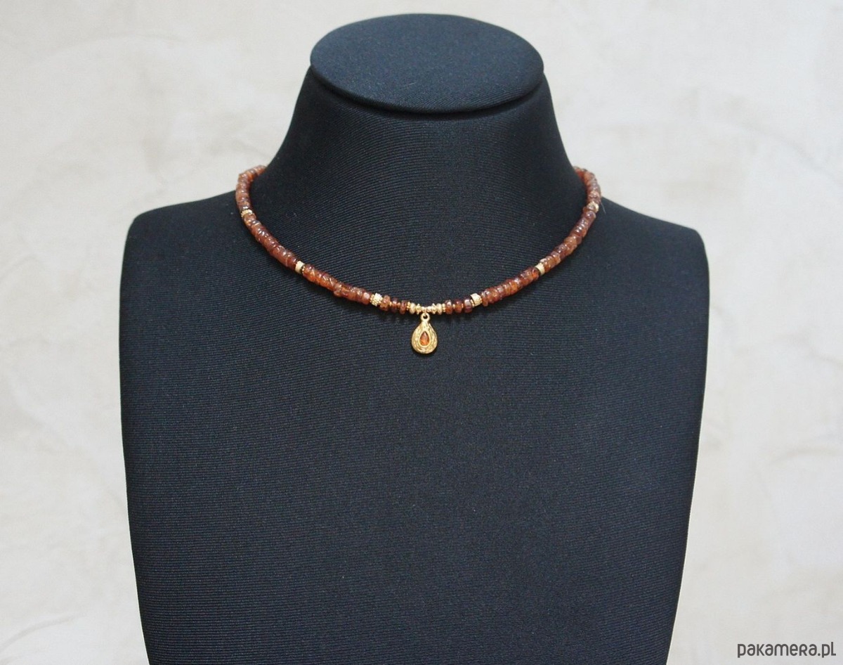 Krótki naszyjnik wykonany w całości z pozłacanej stali szlachetnej oraz naturalnych, szlachetnych kamieni - talarki nieregularnego granatu hessonit [4,5 x 2-3mm], talarków matowego hematytu [4 x 2mm], oponek fasetowanego, platerowanego hematytu [3x2mm], przekładek z hematytu [1mm]. Naszyjnik o długości ok. 42cm.