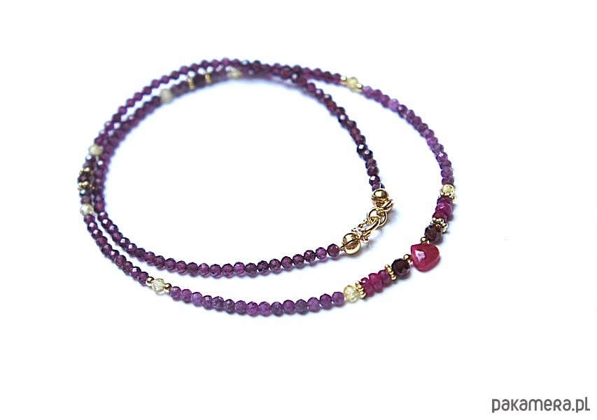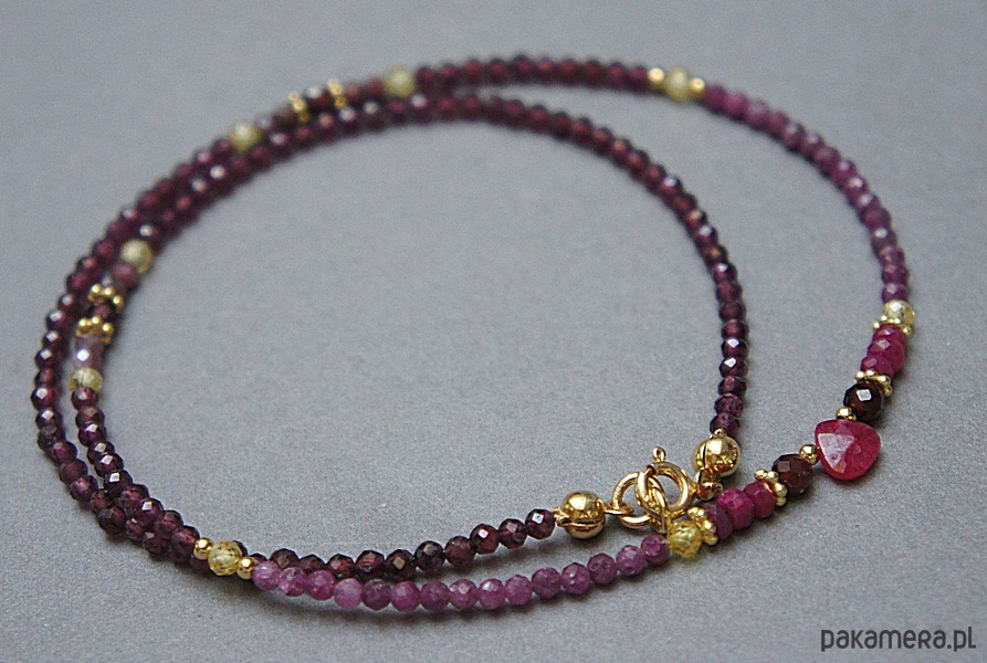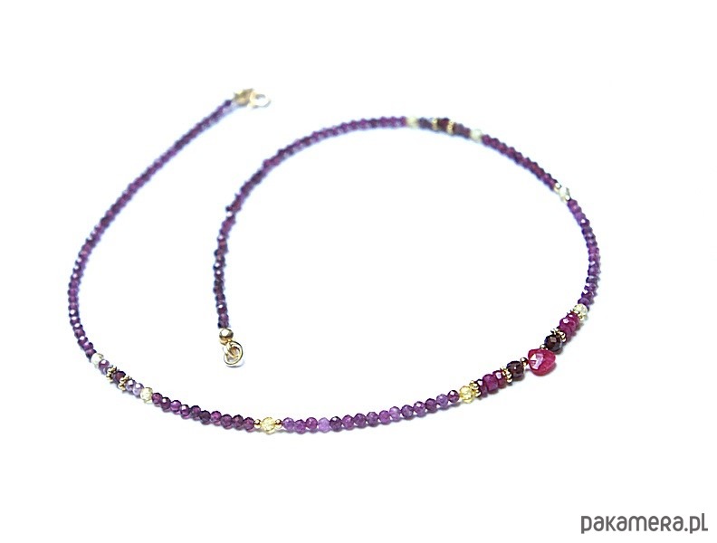 Delikatny, krótki naszyjnik wykonany ze srebra oraz srebra pozłacanego 24k złotem [pr. 925] w połączeniu z fasetowanymi kuleczkami granatów [2,5mm i 3mm], fasetowanymi kuleczkami rubinów [2,5mm], fasetowanymi cyrkoniami [3mm], fasetowaną kropelką rubinu [6 x 6mm]. Całkowita długość naszyjnika 44,1 cm. Biżuteria ozdobnie zapakowana.