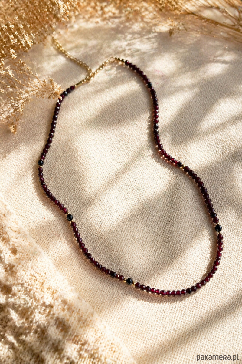 Naszyjnik, który przyciąga spojrzenia swoją głębią koloru i subtelnym blaskiem naturalnych kamieni. Intensywnie bordowe granaty w połączeniu z czarnym turmalinem tworzą elegancką, a jednocześnie wyrazistą kompozycję — ponadczasową i pełną charakteru.