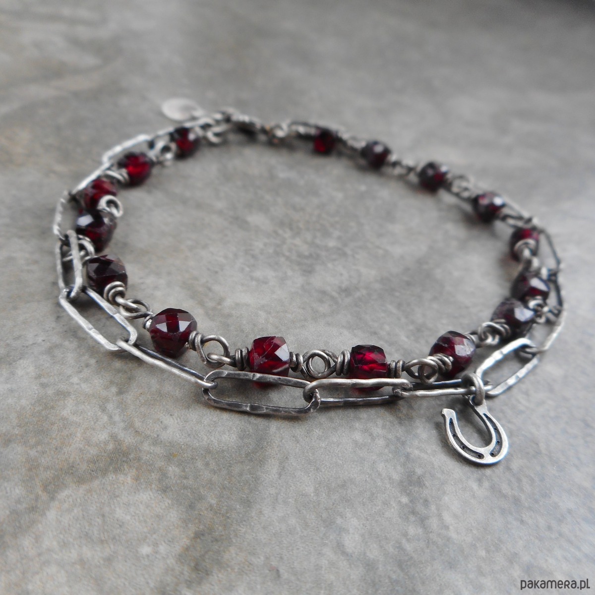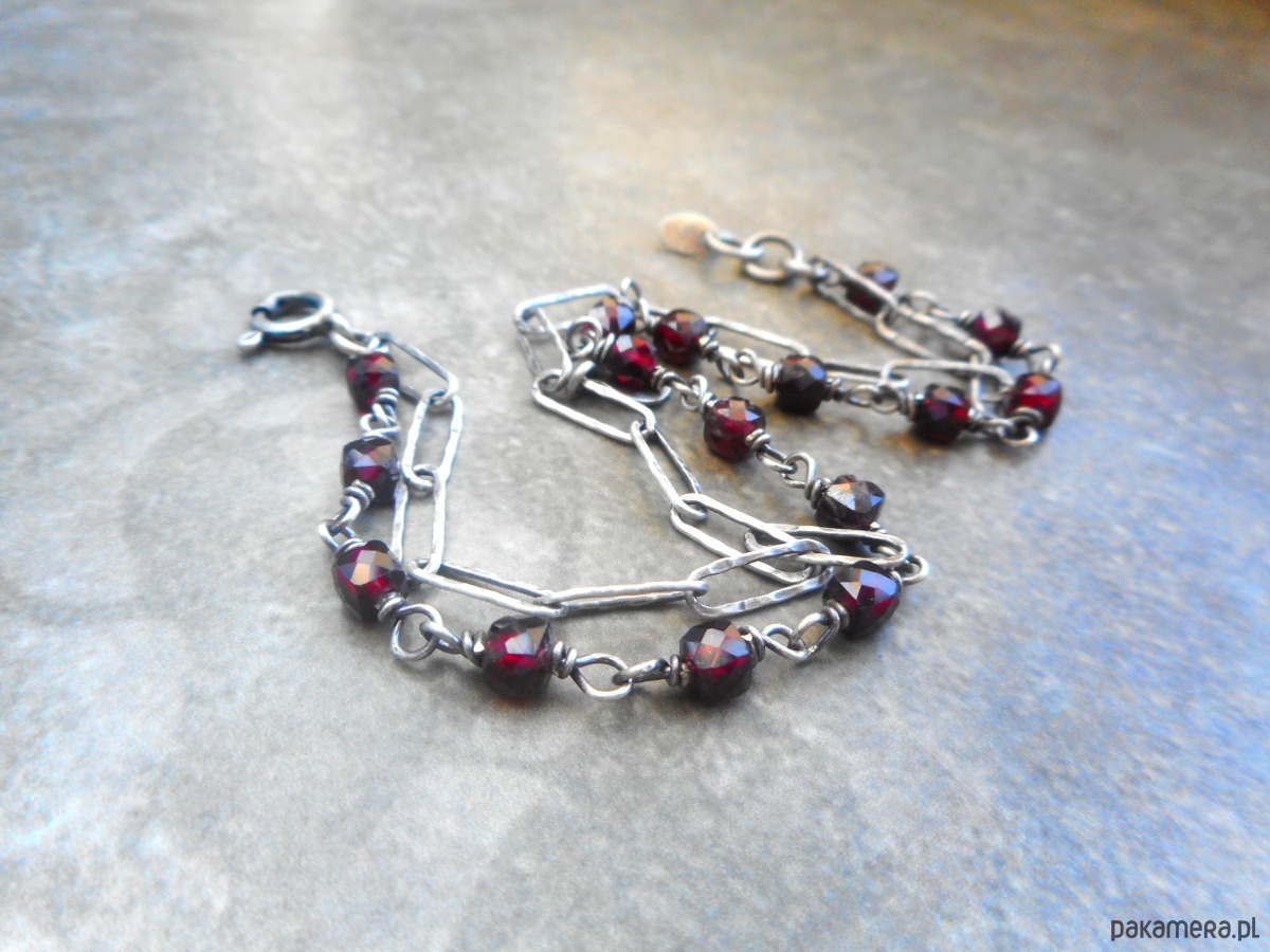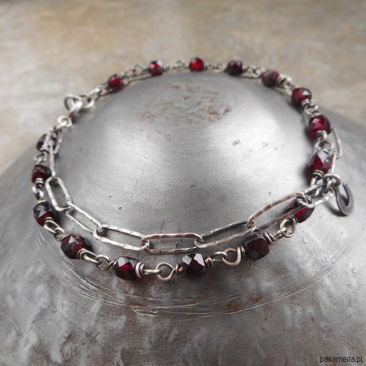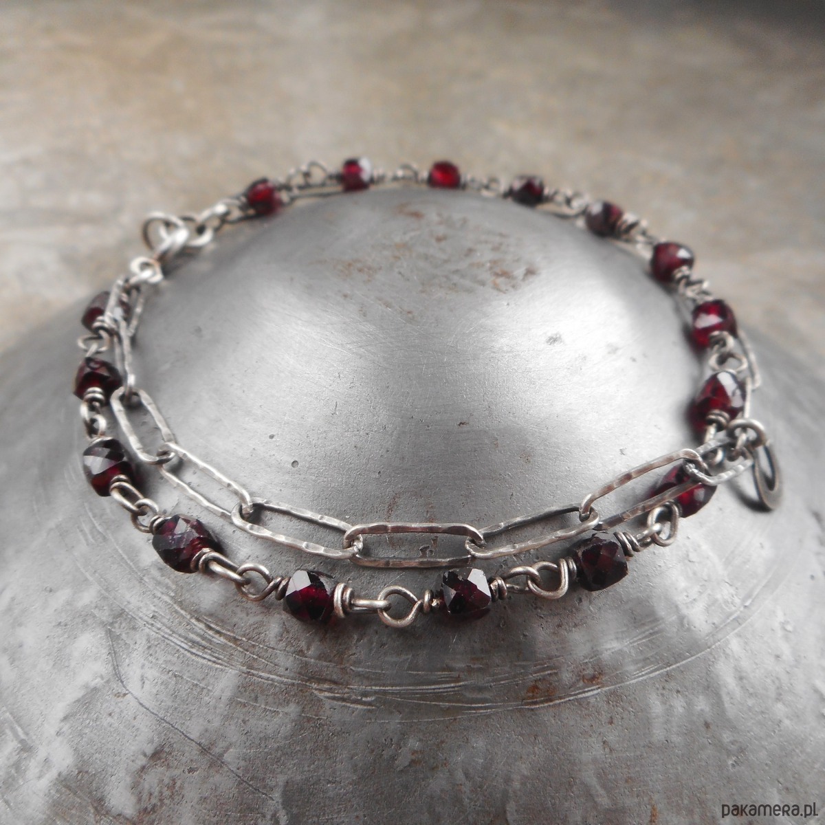 Bransoletka wykonana ze szlachetnego srebra i kamieni naturalnych; lekka i efektowna, w pięknym burgundowym kolorze.