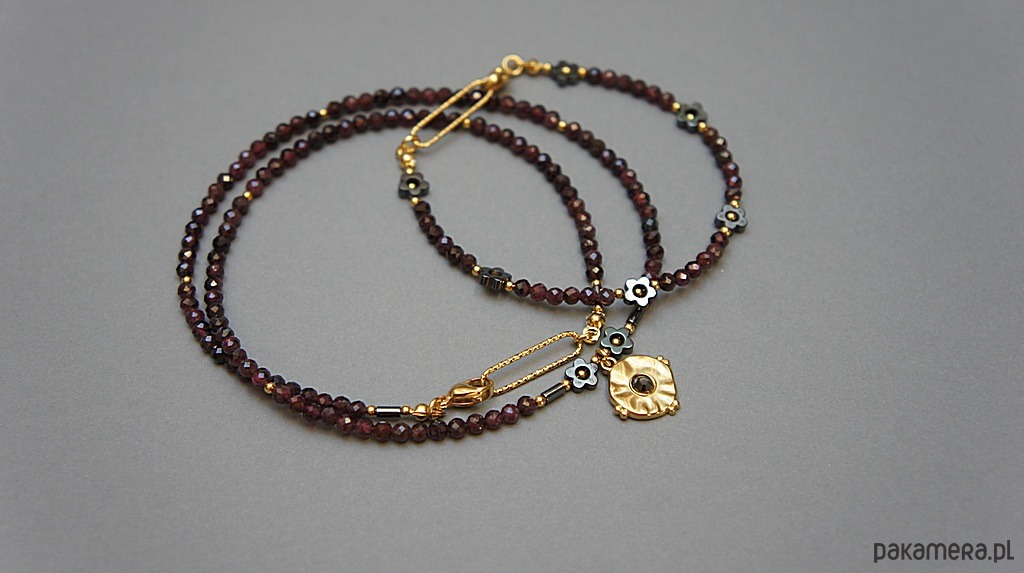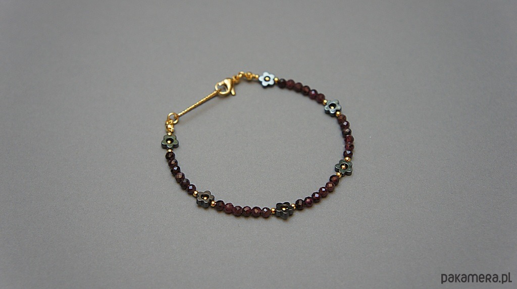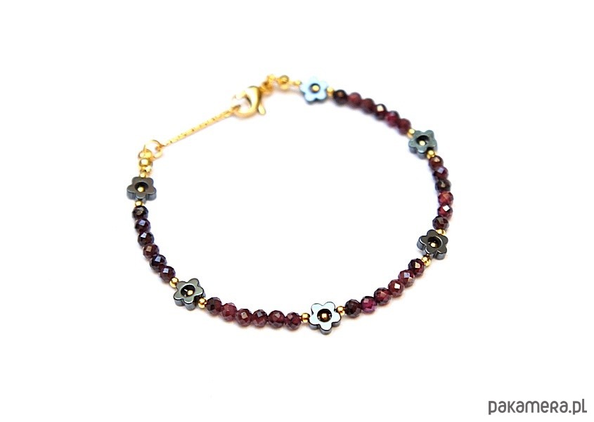 Delikatna bransoletka wykonana w całości ze stali szlachetnej pozłacanej oraz naturalnych, szlachetnych kamieni - fasetowanych kuleczek granatu [3mm], hematytu [5mm - kwiatuszki]. Całkowita długość bransoletki: 18,8cm.