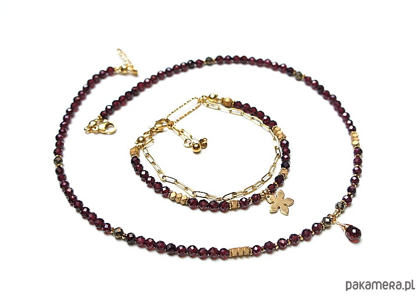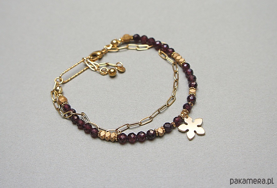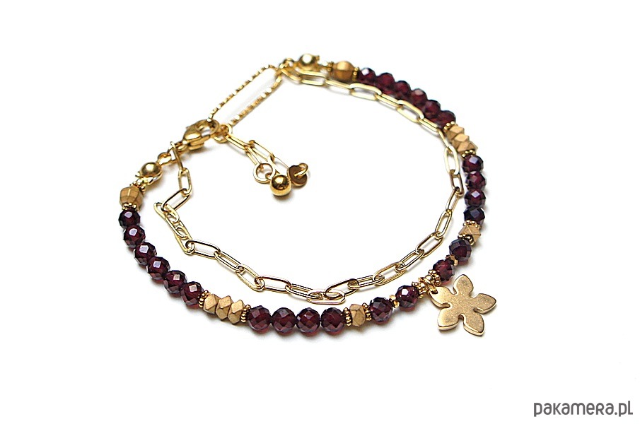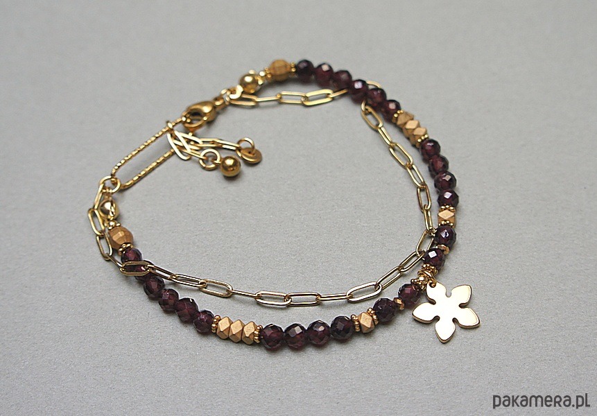 Delikatna bransoletka wykonana w całości ze stali szlachetnej pozłacanej oraz naturalnych, szlachetnych kamieni - fasetowanych kuleczek granatu [3,5mm], przekładek z hematytu [3 x 2mm, 1mm oraz 5mm]. Całkowita długość bransoletki: ok. 19,5cm.