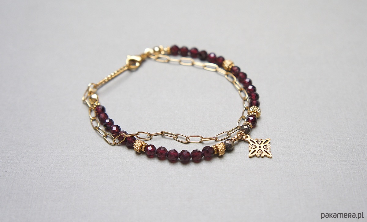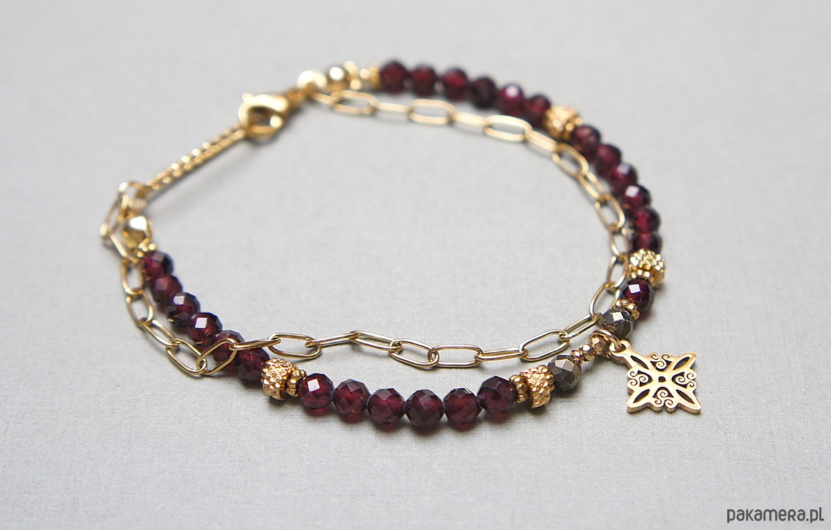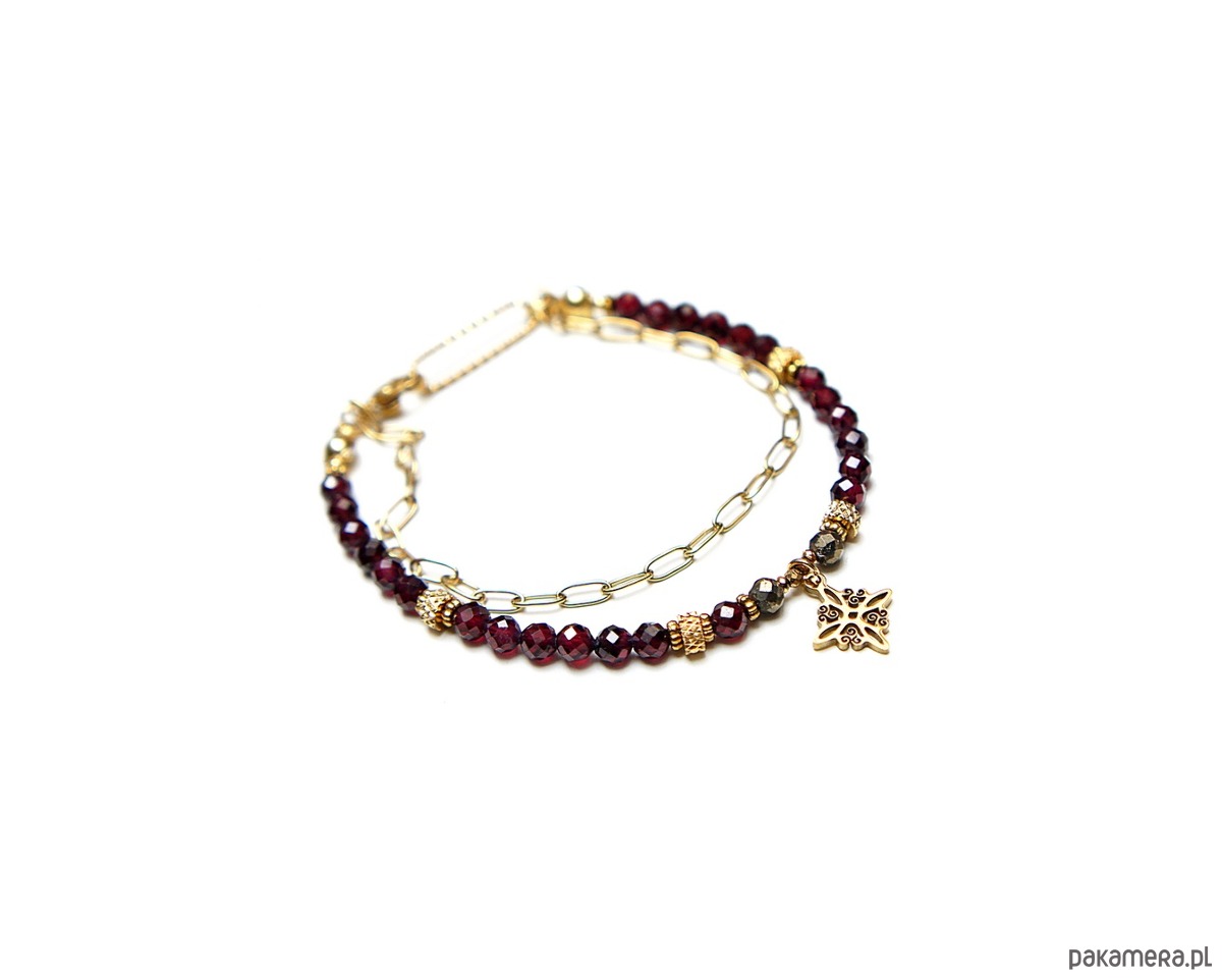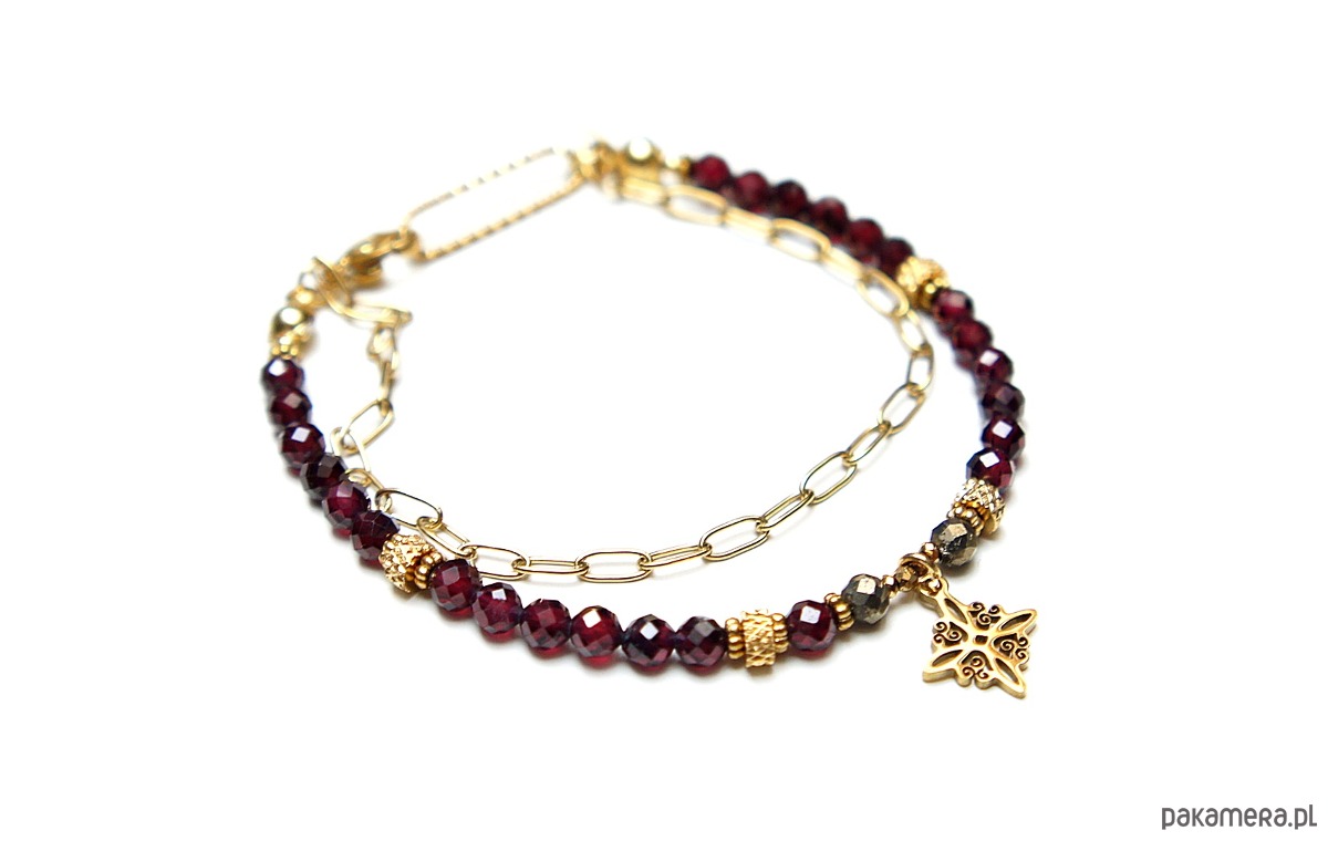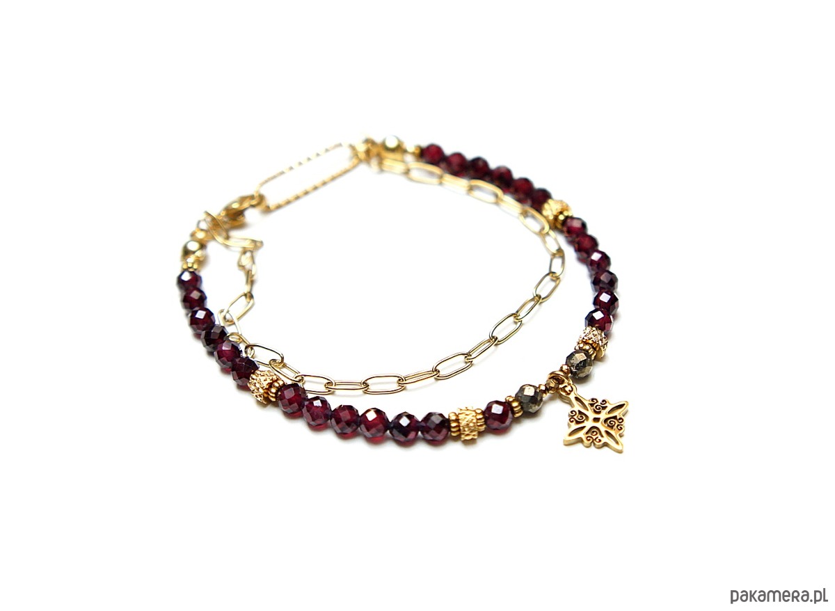 Delikatna bransoletka wykonana w całości ze stali szlachetnej pozłacanej oraz naturalnych, szlachetnych kamieni - fasetowanych kuleczek granatu [4mm], pirytu fasetowanego o surowym wyglądzie [3,5mm], przekładek z hematytu [1mm i 2mm]. Całkowita długość bransoletki: ok. 18,2cm. Biżuteria ozdobnie zapakowana.