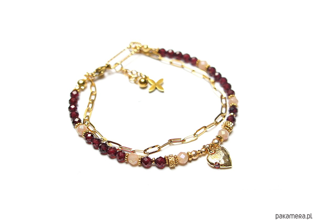 Delikatna bransoletka wykonana w całości ze stali szlachetnej pozłacanej oraz naturalnych, szlachetnych kamieni - granat fasetowany [4mm], kamień słoneczny fasetowany [4mm], hematyt fasetowany, platerowany [2mm i 3mm], przekładek z hematytu [1mm]. Całkowita długość bransoletki: ok. 19,5cm.