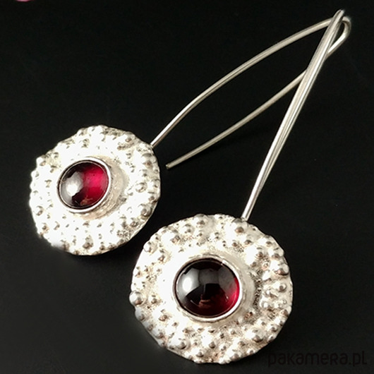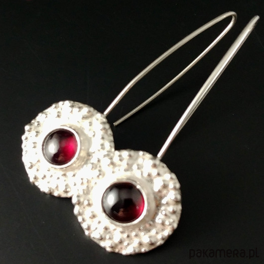 Surowe kolczyki wykonane od podstaw własnoręcznie ze srebra próby 925 z wkomponowanymi naturalnymi granatami w winnym odcieniu. Ponadczasowa elegancja, klasyka z nutą awangardy. Średnica kamieni 7 mm, Średnica elementów oprawy 20 mm, długość z biglami 47 mm. Kolczyki są lekkie i komfortowe w noszeniu pomimo swoich rozmiarów. Waga jednego kolczyka 3,9 grama. Kolczyki zostaną zapakowane w ozdobne pudełeczko.