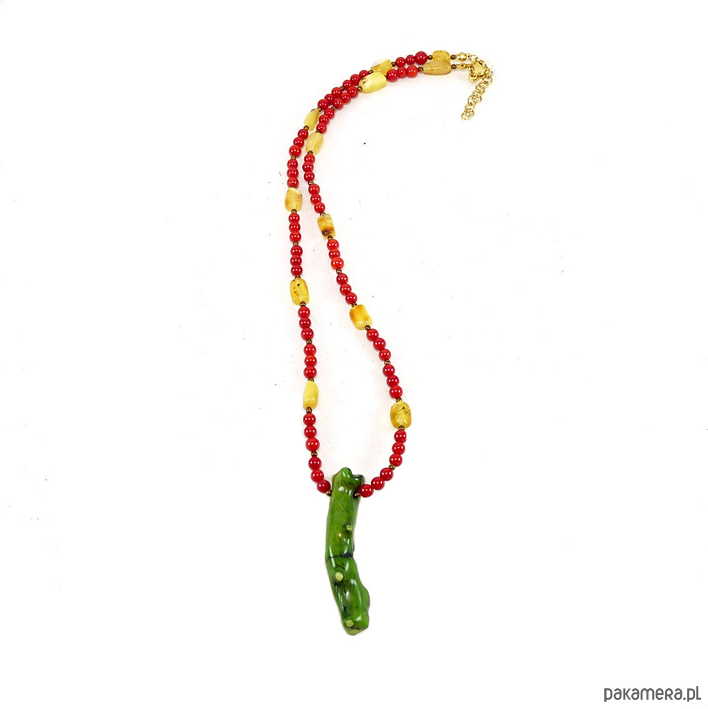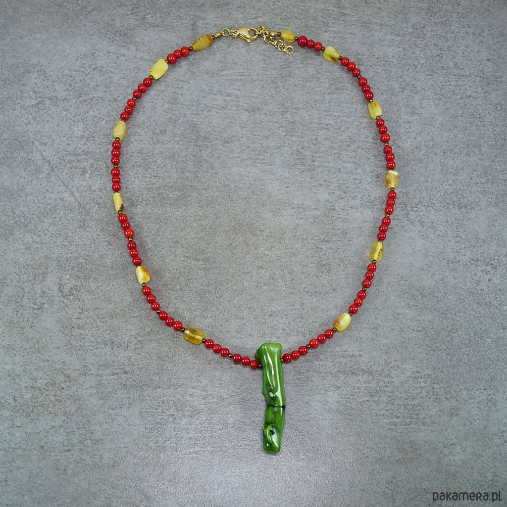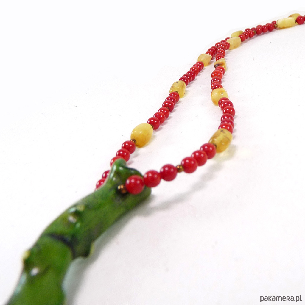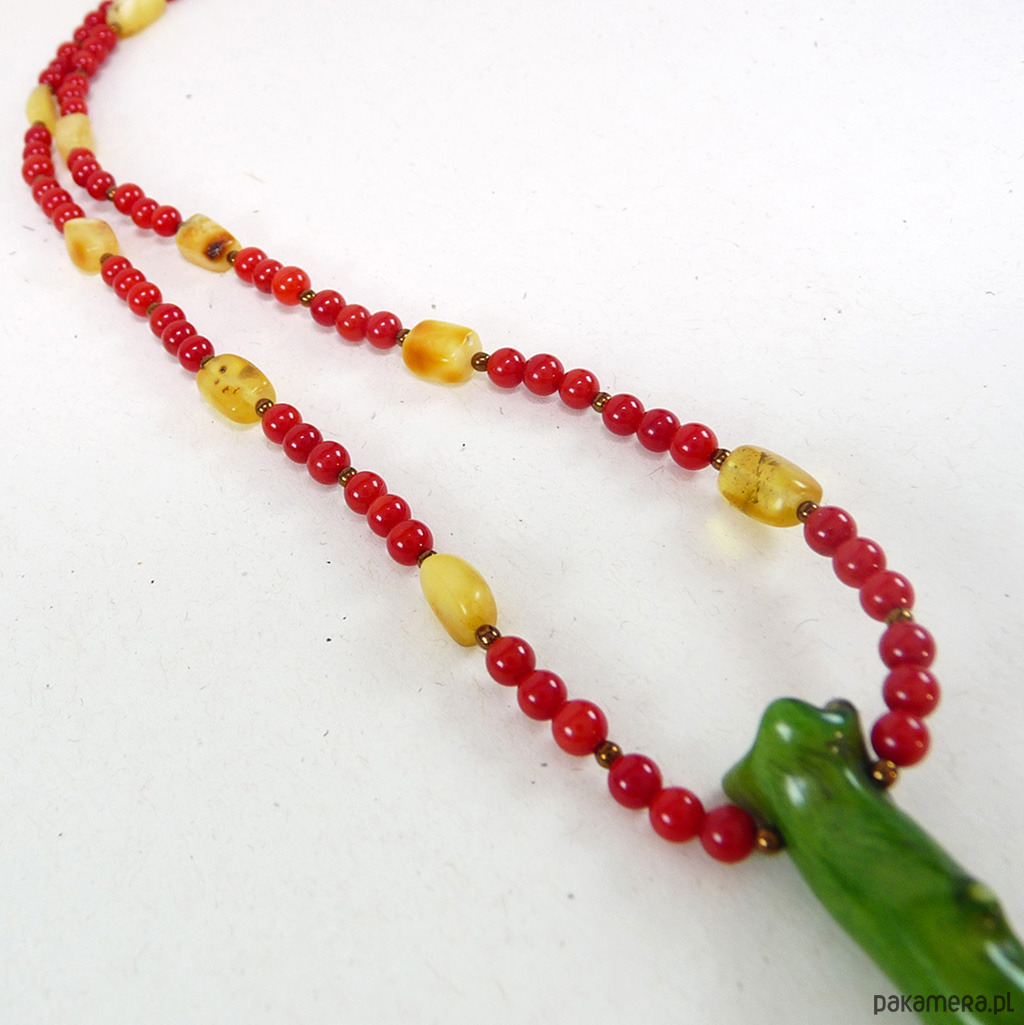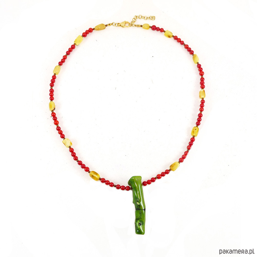 koral zielony 47 mm, koral czerwony 4,5 mm, bursztyn 7 mm, hematyt, stal szlachetna