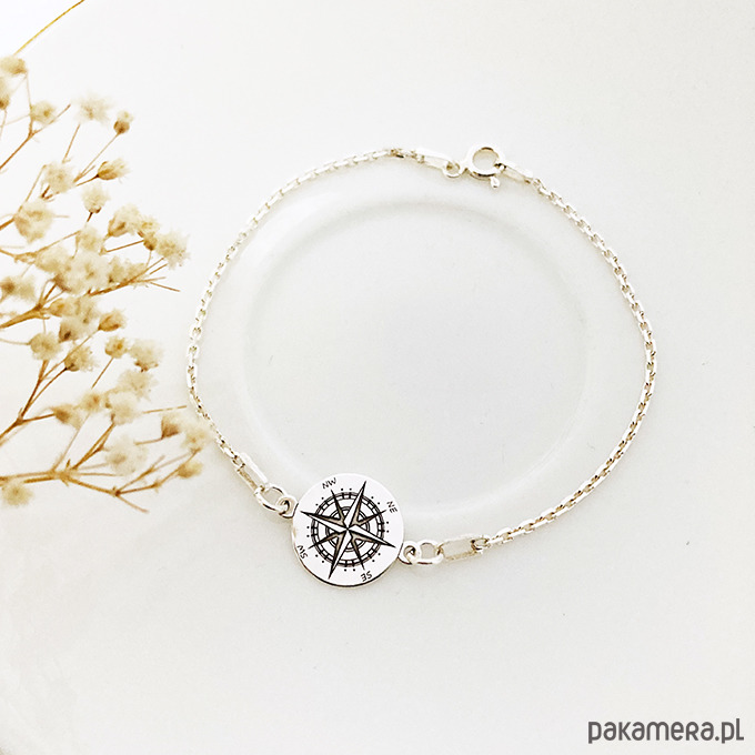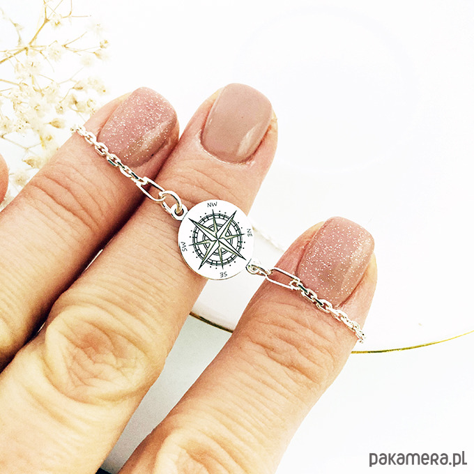 Piękna bransoletka z zawieszką kompasem jest wykonana ze srebra próby 925 . Grawer jest wyraźny ,ale delikatny.