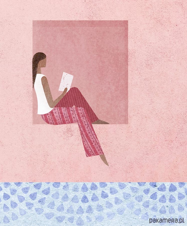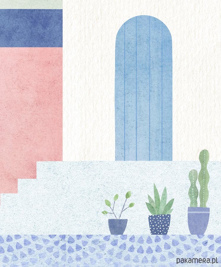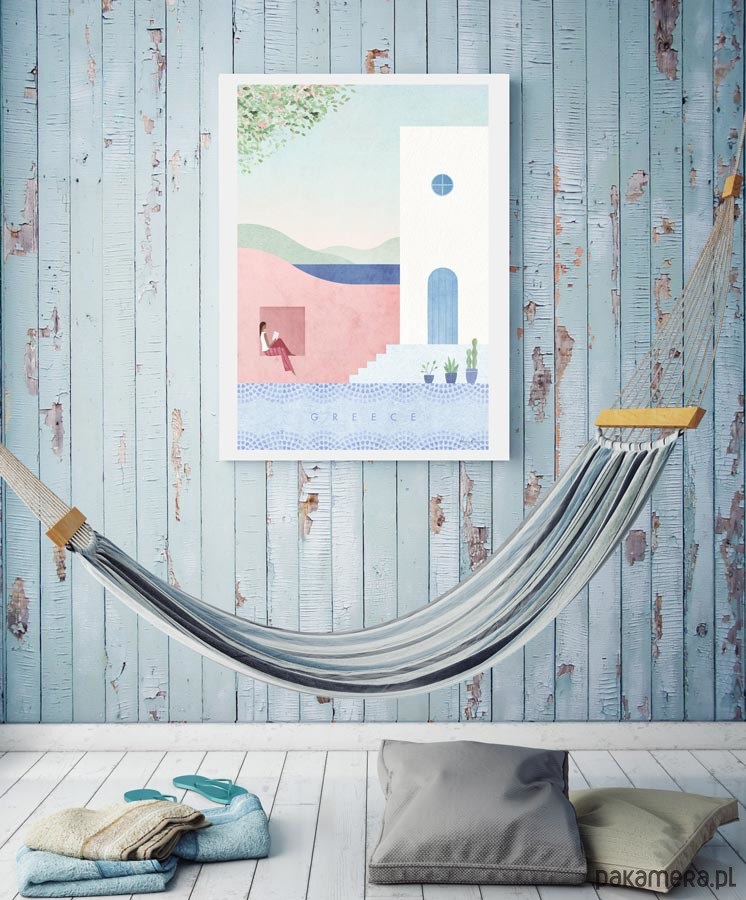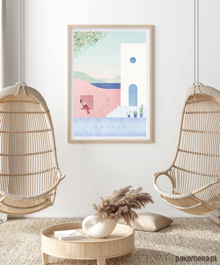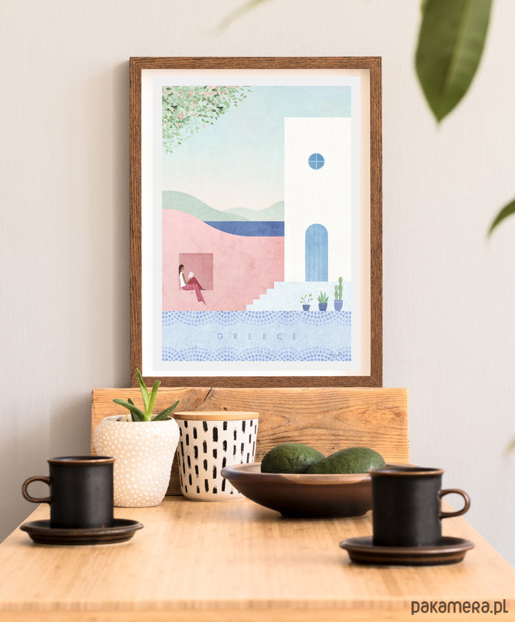 Plakat w stylu vintage przedstawiający fragment miasteczka na jednej z greckich wysp. Na pierwszym planie zabudowa w bieli, różu i błękicie, przywodząca na myśl charakterystyczny krajobraz wyspy Santorini. W oknie postać czytającej kobiety, na pierwszym planie rośliny w niebieskich donicach. Inspirowany plakatami podróżniczymi z lat 20-tych XX wieku.