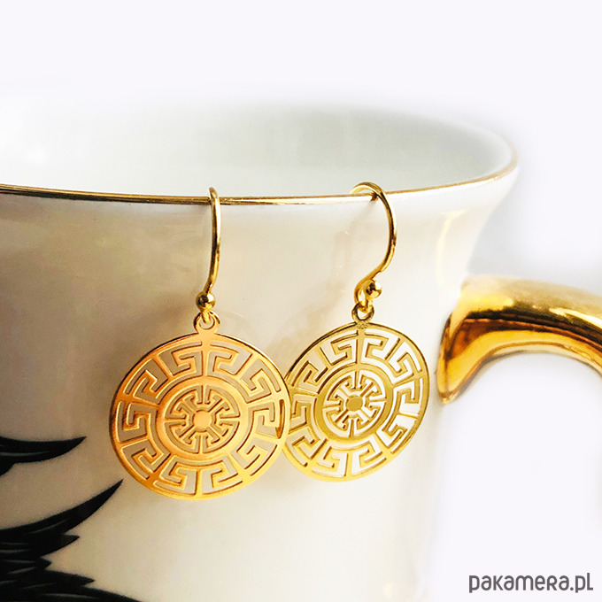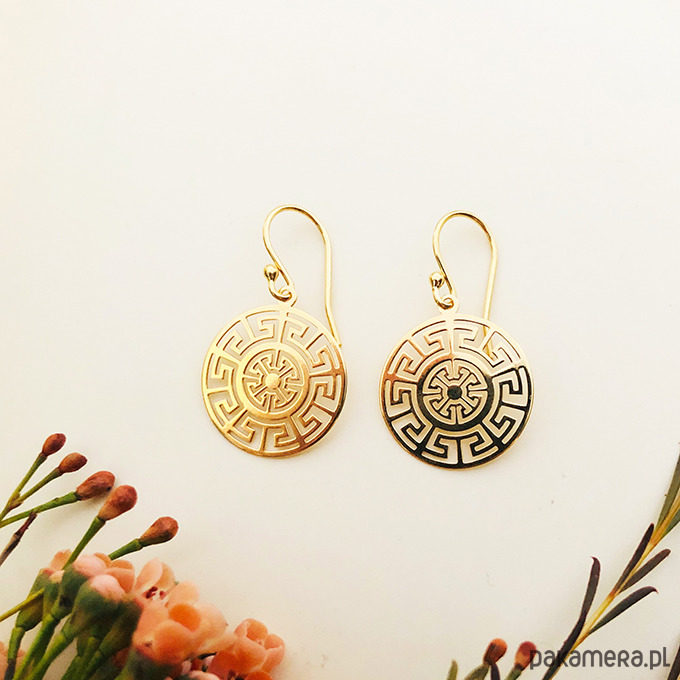 Eleganckie kolczyki z greckim motywem ze stylizowaną zawieszką w kształcie antycznego meandra.Całość jest wykonana ze srebra próby 925 złocona 24 k złotem.