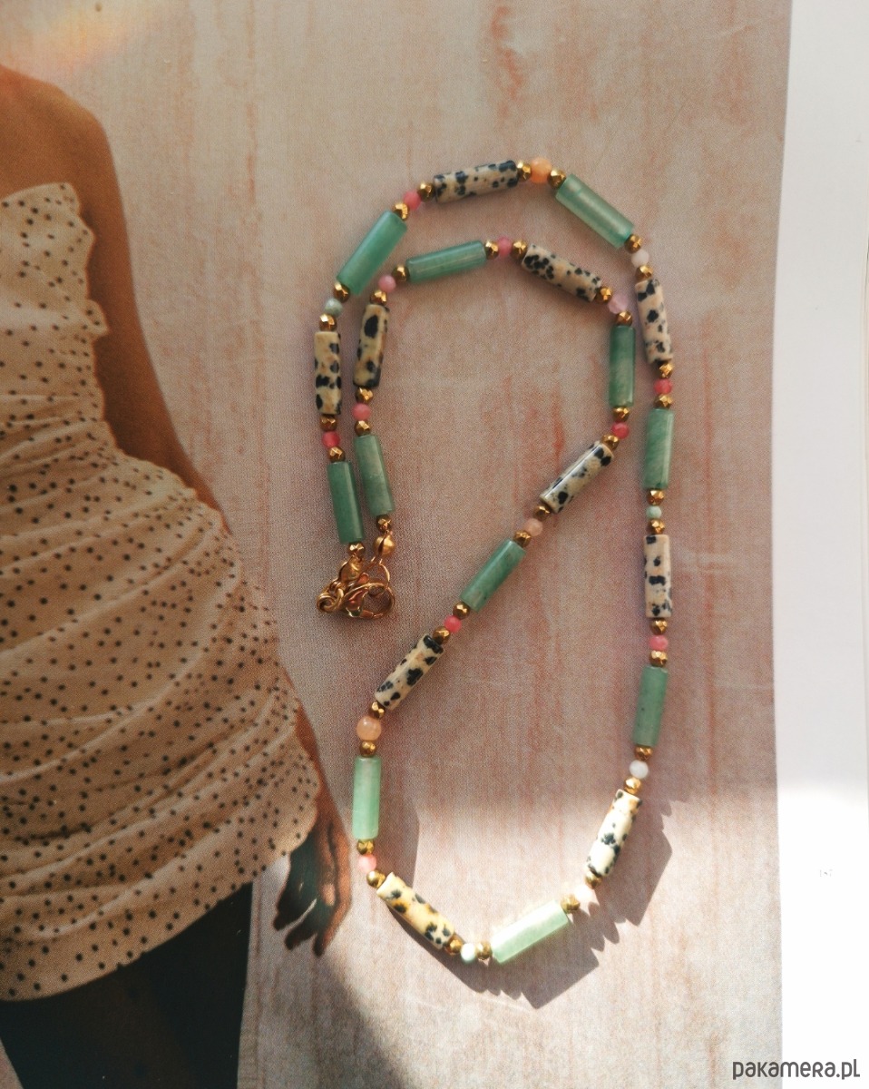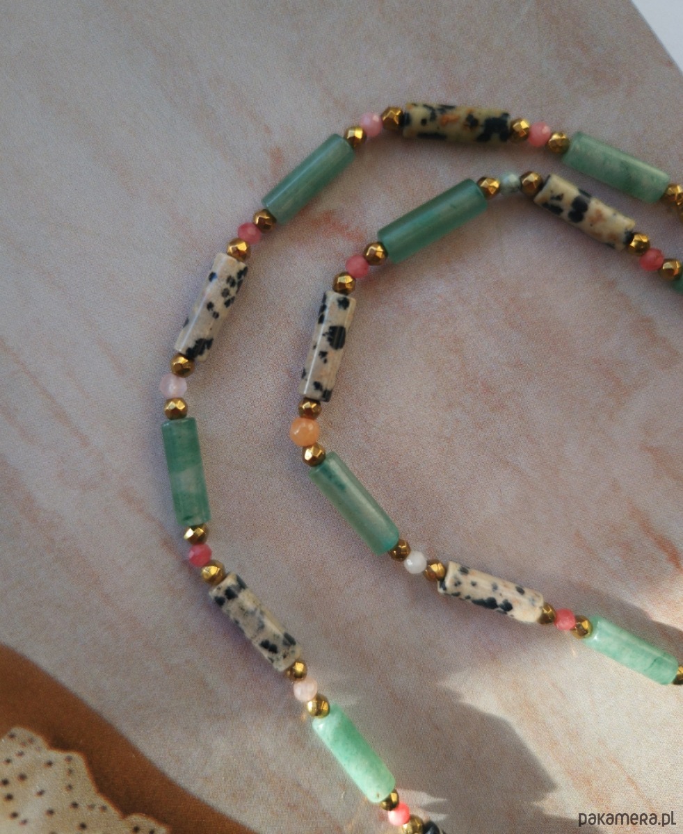 Naszyjnik z naturalnych kamieni na nici jedwabnej i z wykończeniami ze stali chirurgicznej.Złoty fasetowany hematyt,jaspisy i agaty.Dlugość 45,5cm.