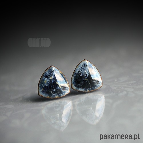 Ceramiczne kolczyki w formie sztyftów, ręcznie wykonane z delikatnej gliny kamionkowej, jednostronnie szkliwione mieszanką szarogranatowych szkliw z efektem plamek i subtelnym połyskiem, na antyalergicznych sztyftach w kolorze srebrnym.Średnica ok. 10mm.. Polecam