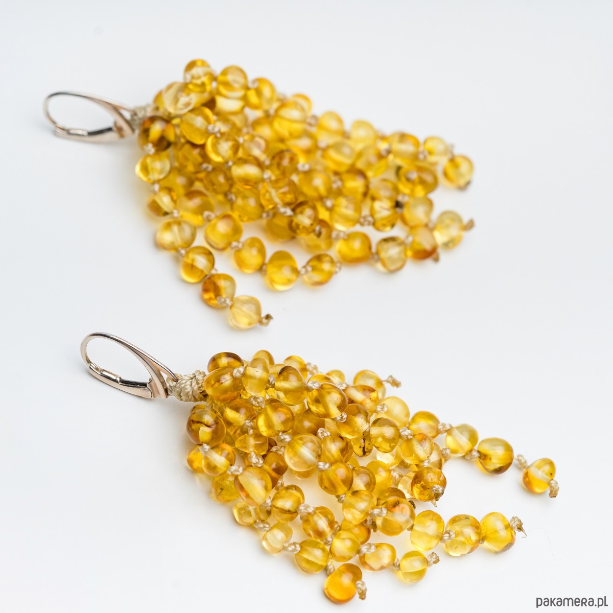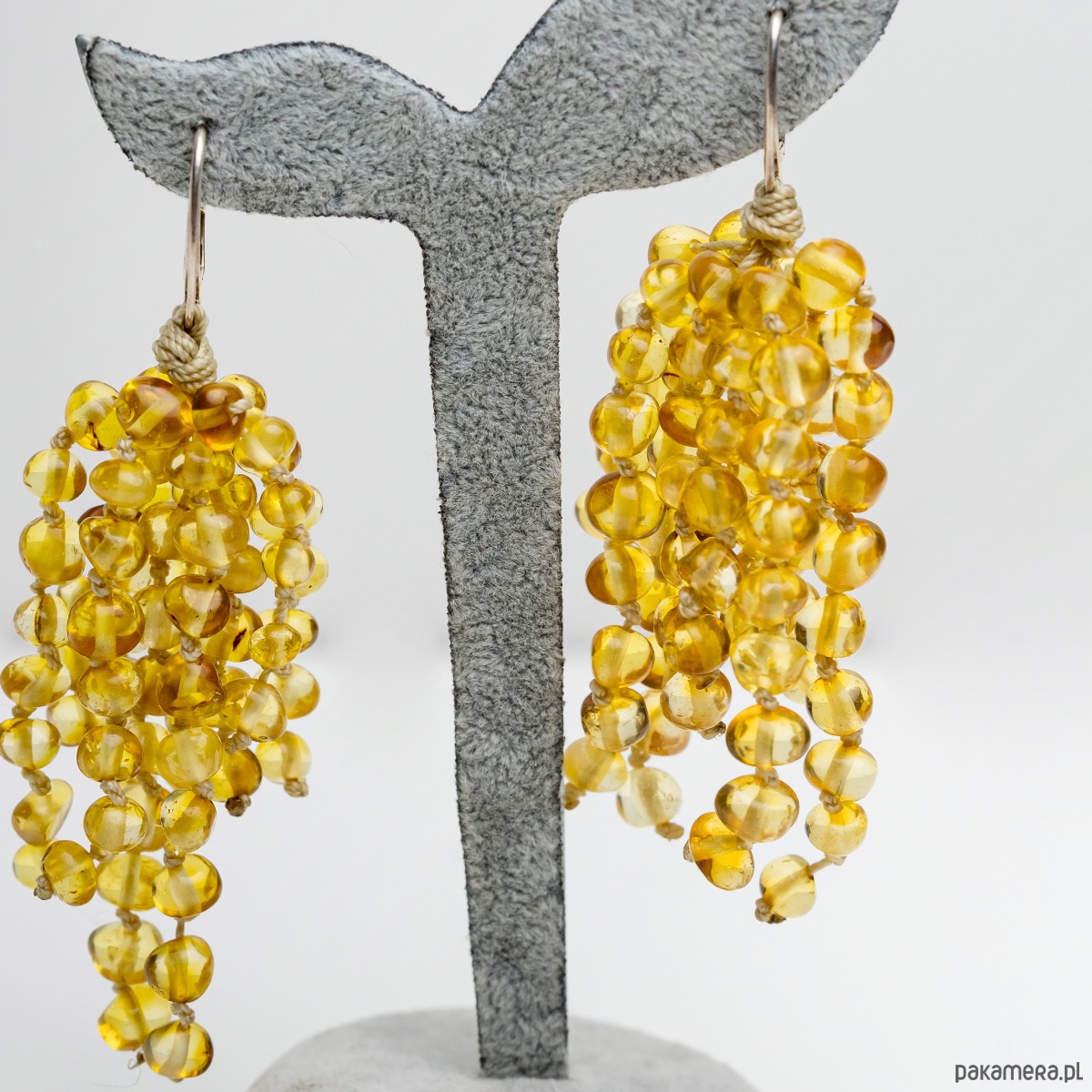 Kolczyki te zostały wykonane z bursztynowych, nieregularnych kamieni w cytrynowym kolorze. Kaźdy koralik został zabezpieczony supełkiem. Zapięcie zostało wykonane ze srebra próby 925. Kolczyki te doskonale wpisują się w estetykę boho.