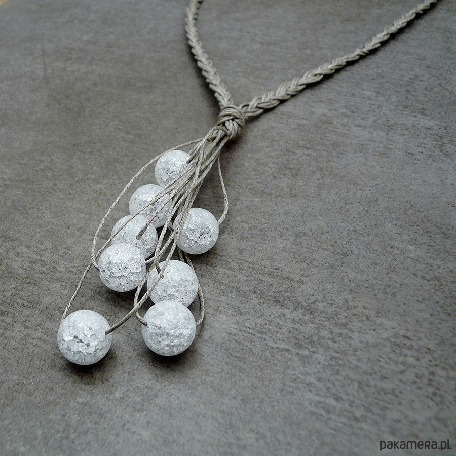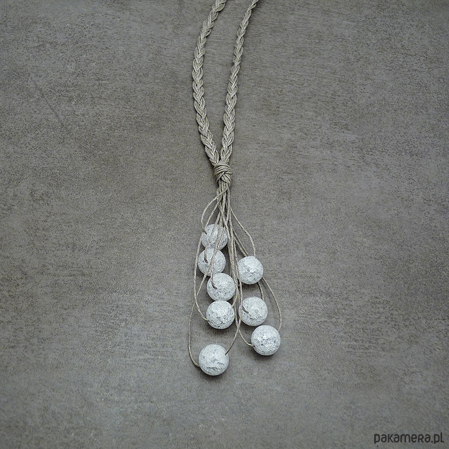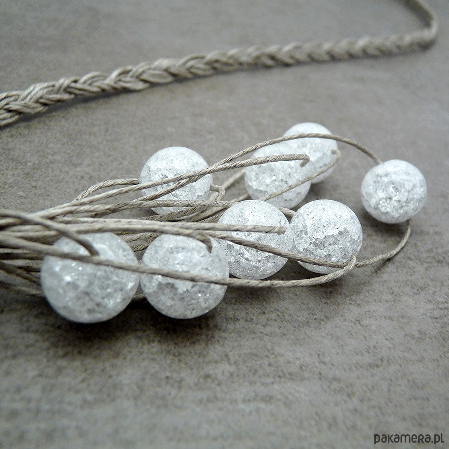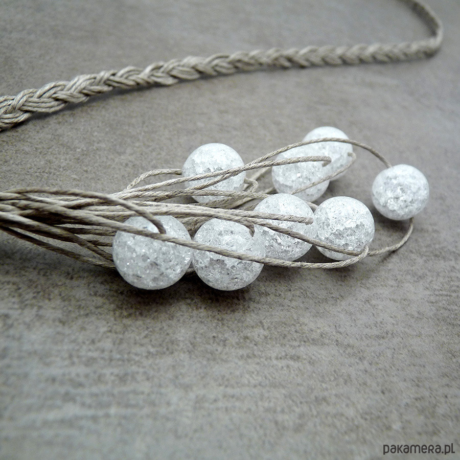 Naturalny naszyjnik wypleciony z nitek naturalnego lnu i kulek lodowego kryształu górskiego (dużo spękań)