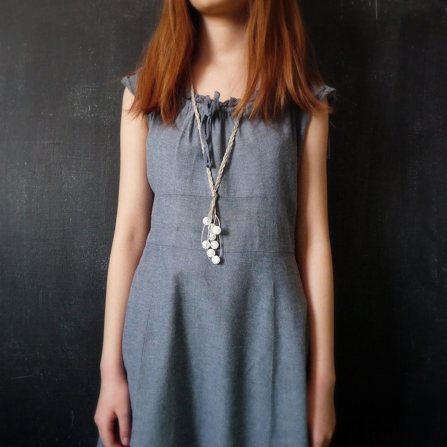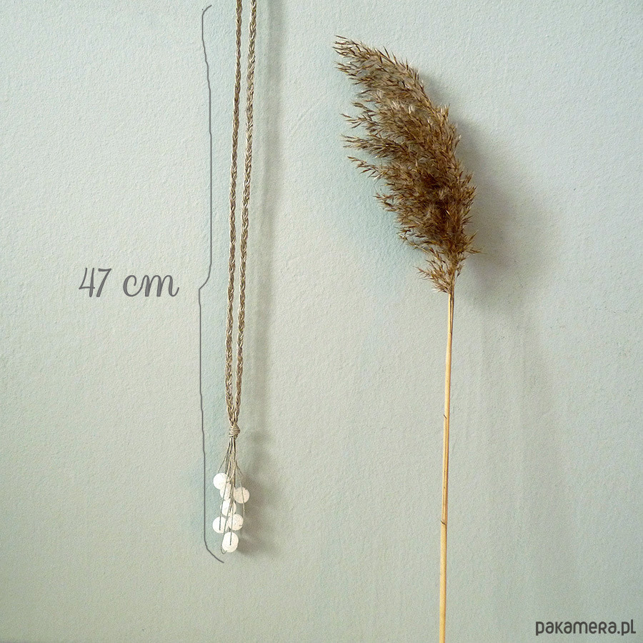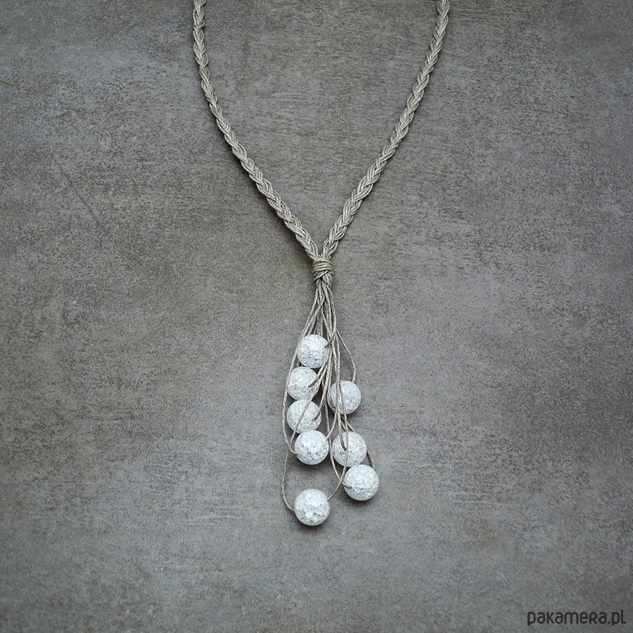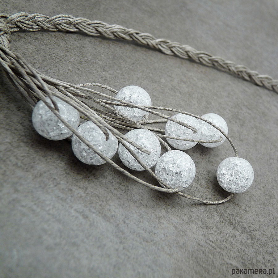 Naturalny naszyjnik wypleciony z nitek naturalnego lnu i kulek lodowego kryształu górskiego (dużo spękań)