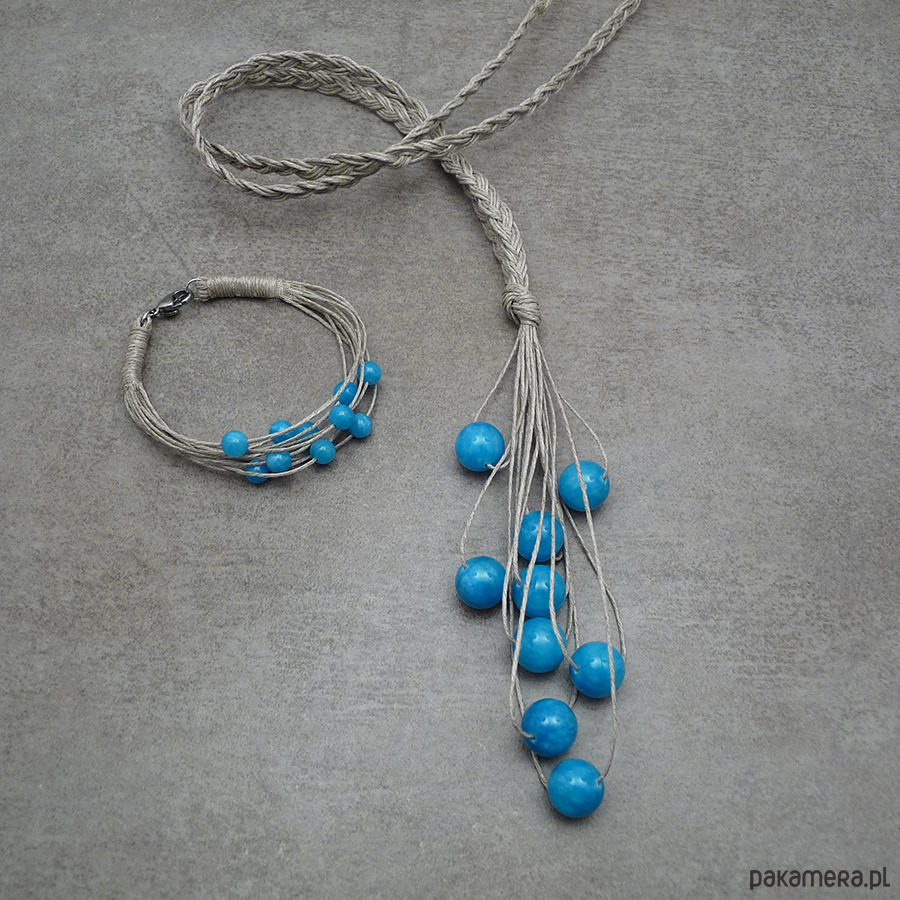 Naturalny, romantyczny przyciągający wzrok komplet biżuterii wypleciony z lnu i kulek marmuru