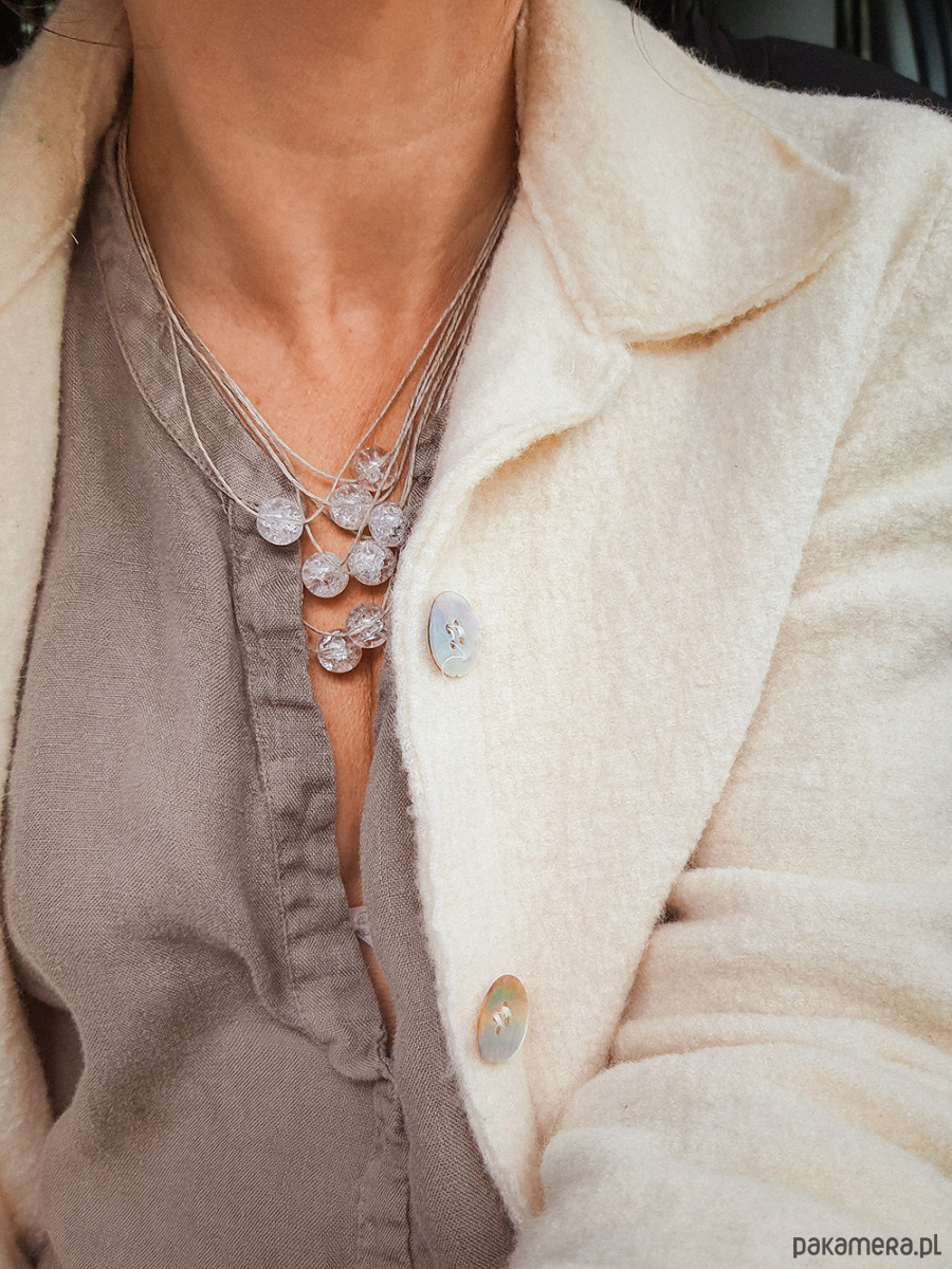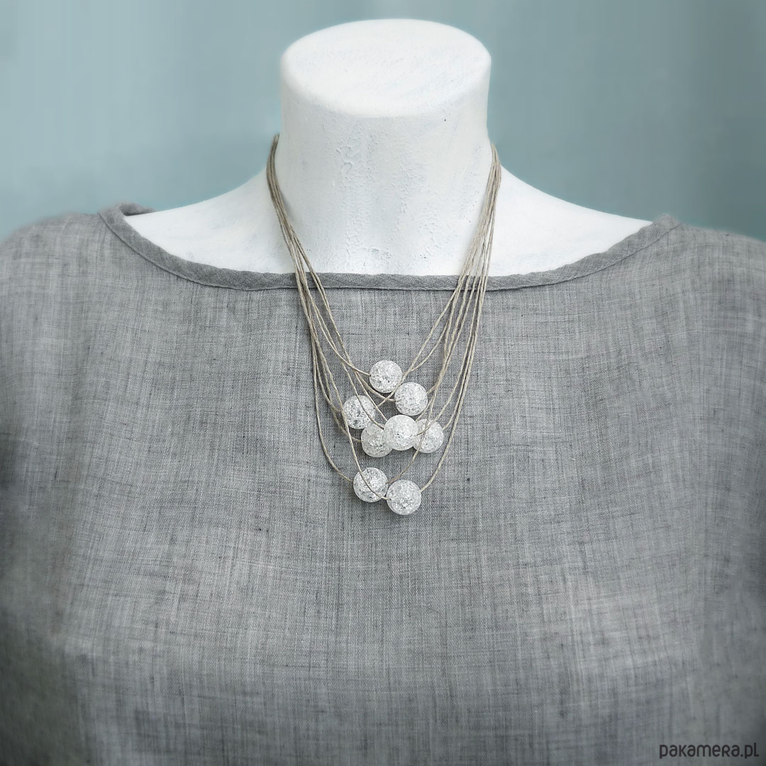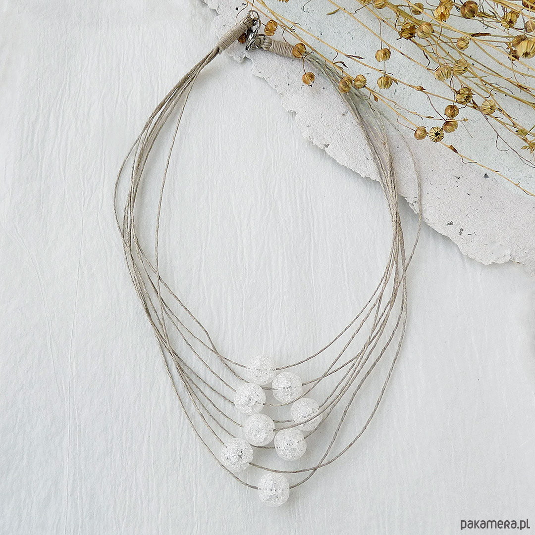 Lniany naszyjnik wykonany z nitek naturalnego lnu i kulek kryształu górskiego lodowego o średnicy 12 mm