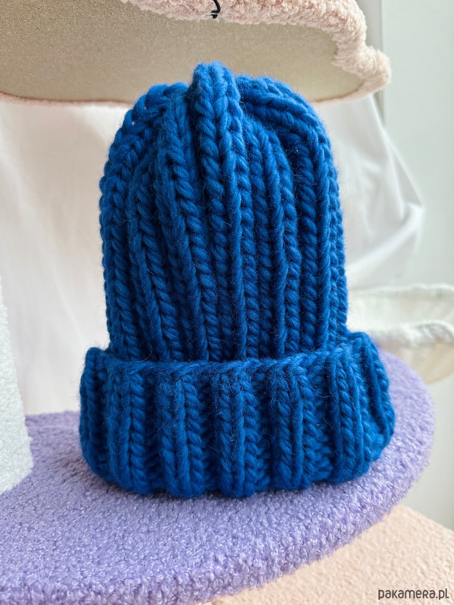 Gruba wełniana czapka beanie 100% wełna handmade kobalt niebieska