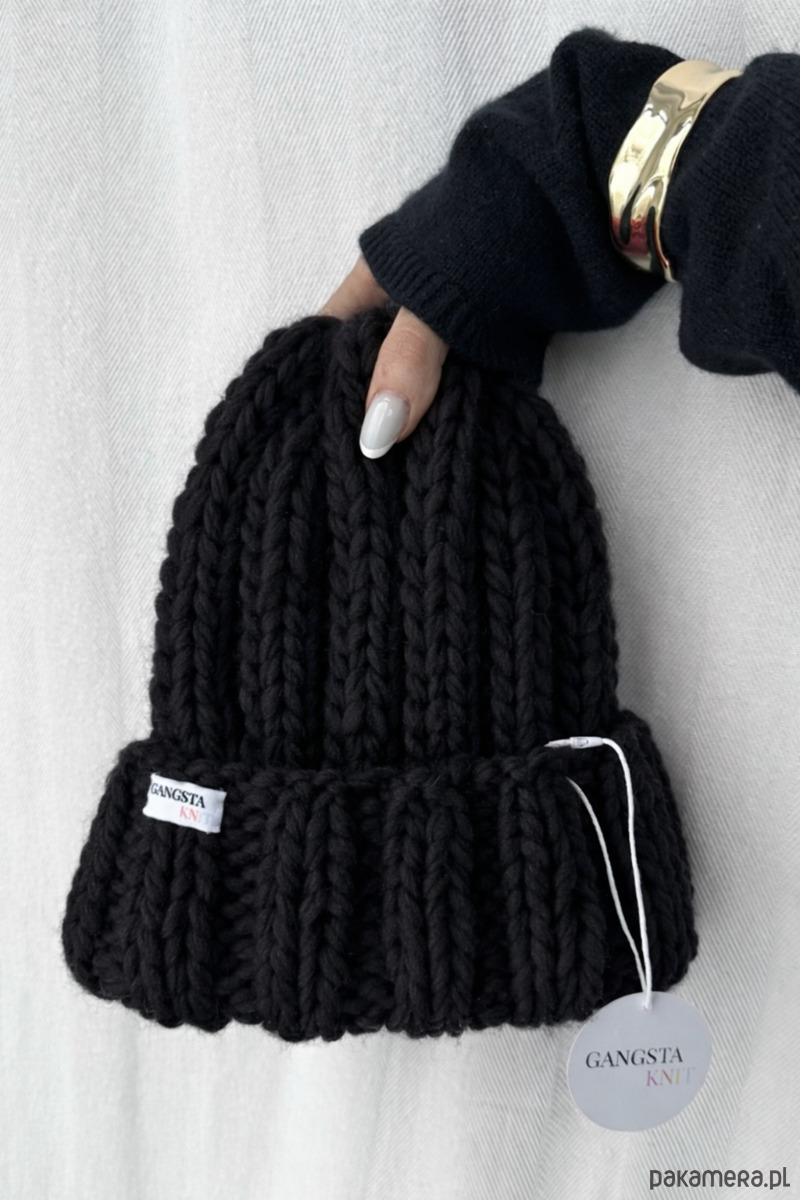 Gruba wełniana czapka czarna beanie 100% wełna handmade