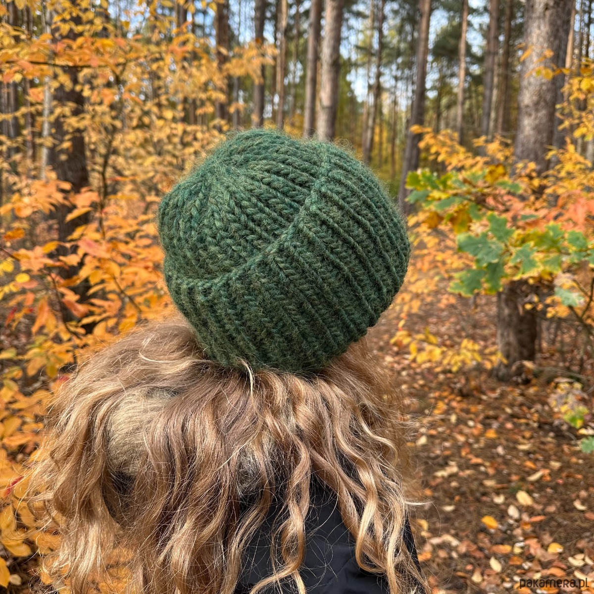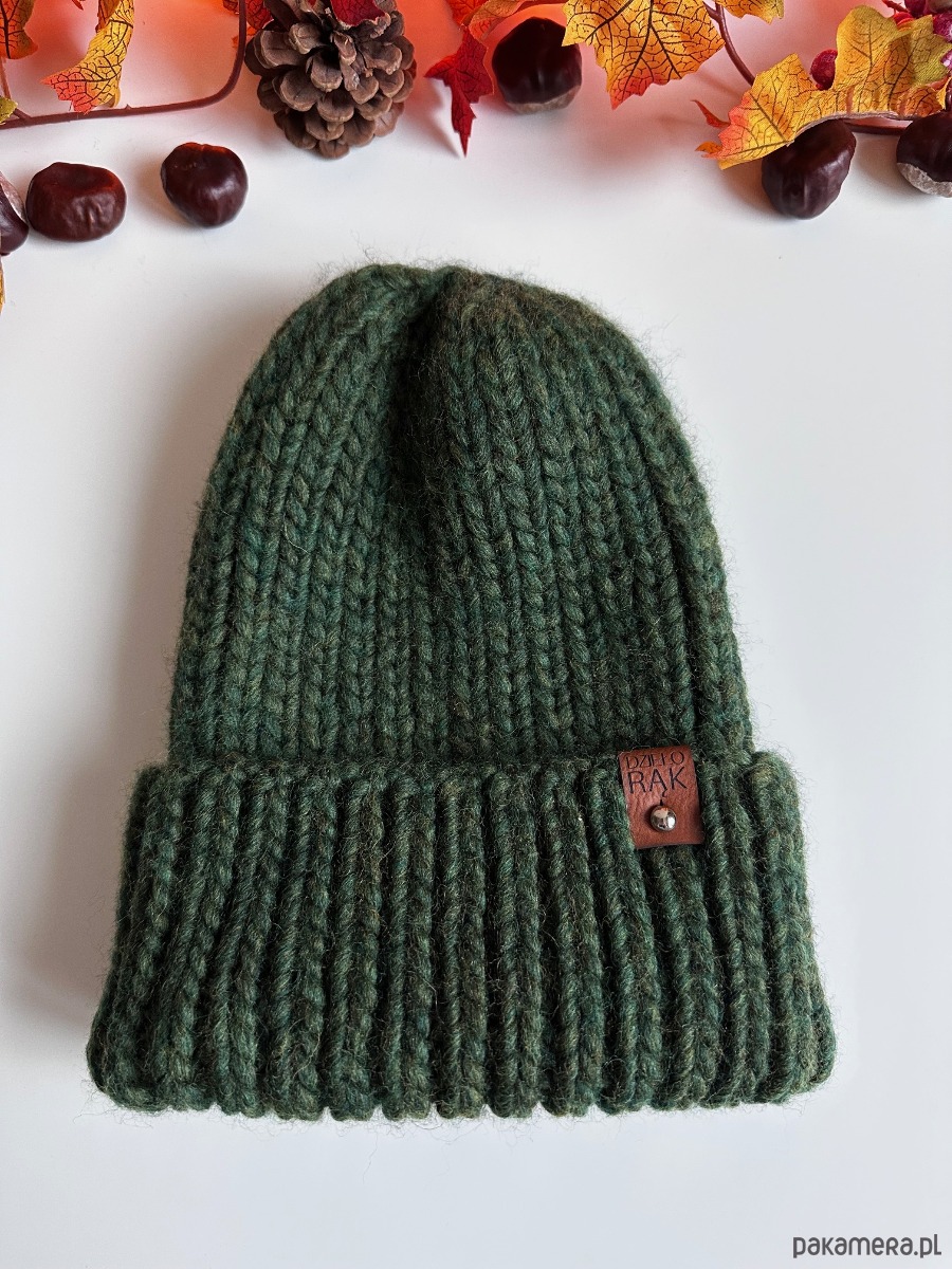 Gruba wełniana czapka oversize z bardzo szerokim wywinięciem - leśna zieleń