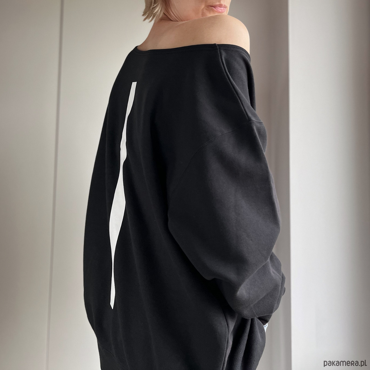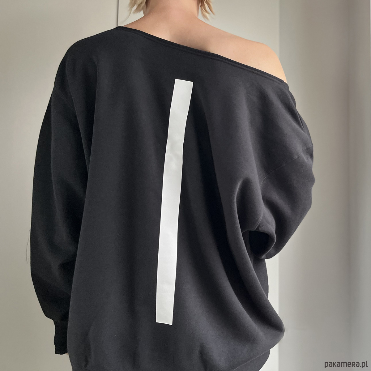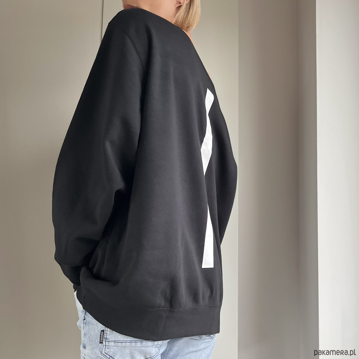 Czarna bluza z białym nadrukiem z tyłu. Bardzo fajny kontrast między matową dzianiną i matowym, ale odbijającym światło nadrukiem.